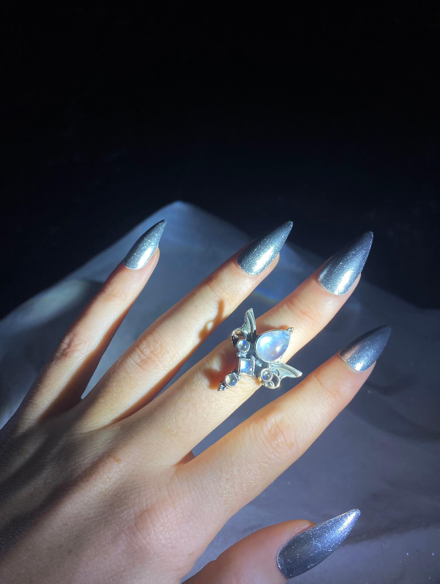 The vibe I get from this ring is Galadriel, Lady of the Light from Lord of the Rings. If you don't know who I'm talking about this might mean nothing at all. However, what you need to know she is a royal elf with the most mystical, pure and ethereal essence. She is older than the moon. She is beauty; She is grace.
