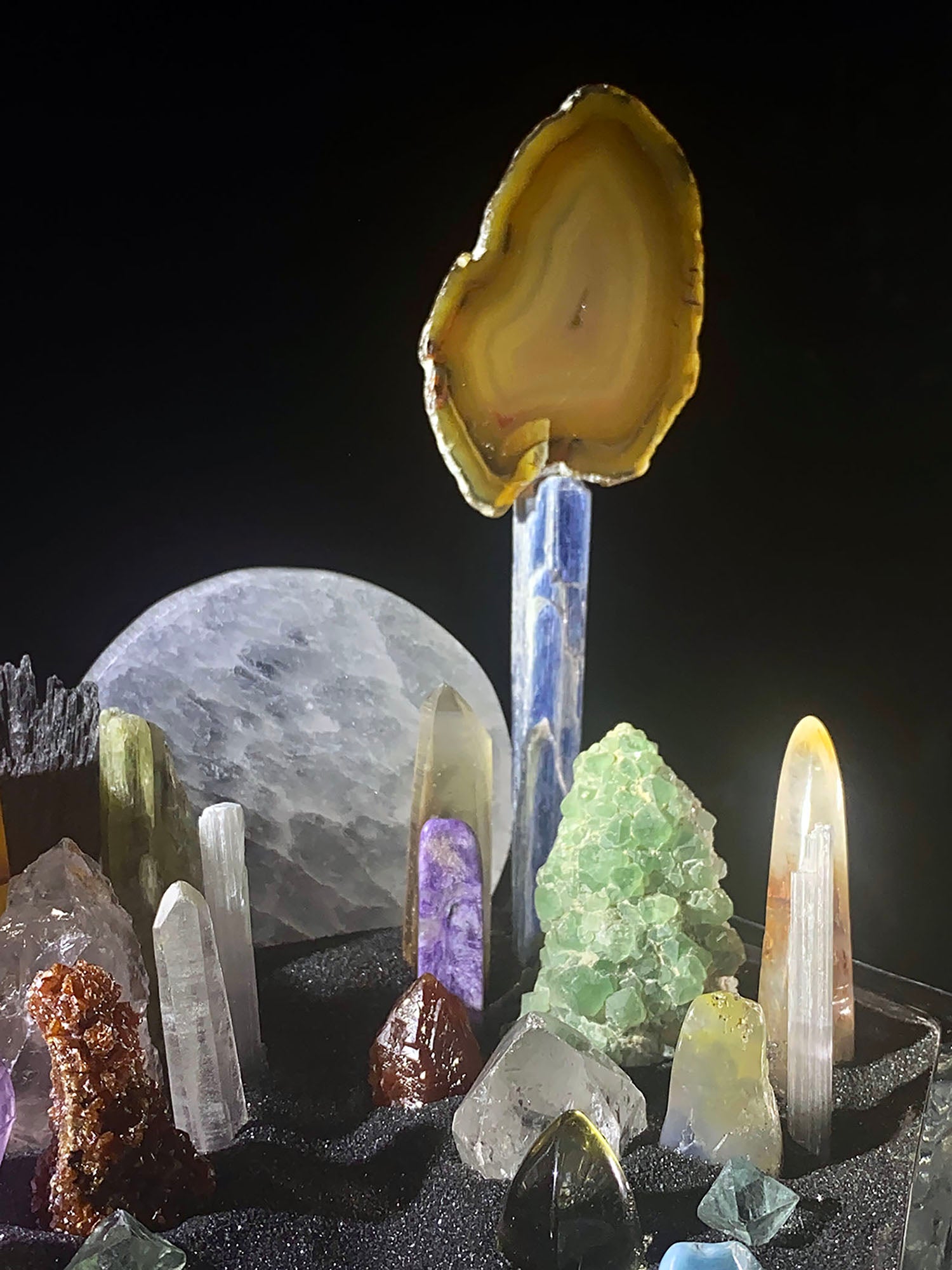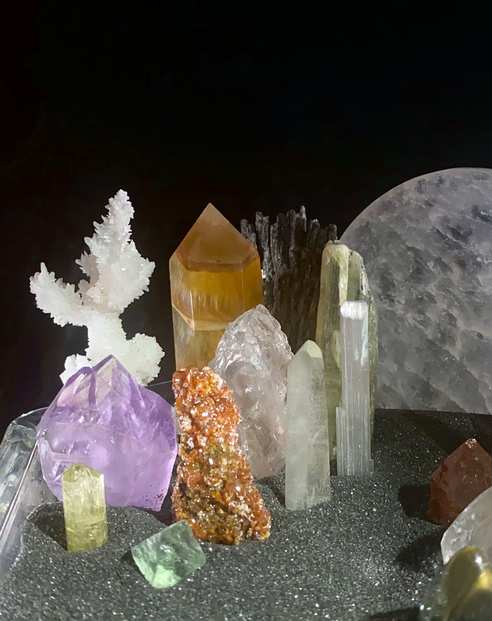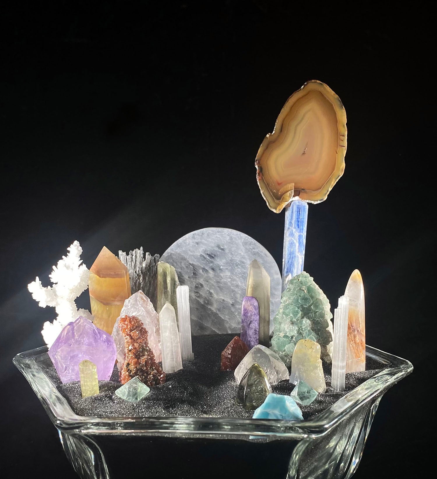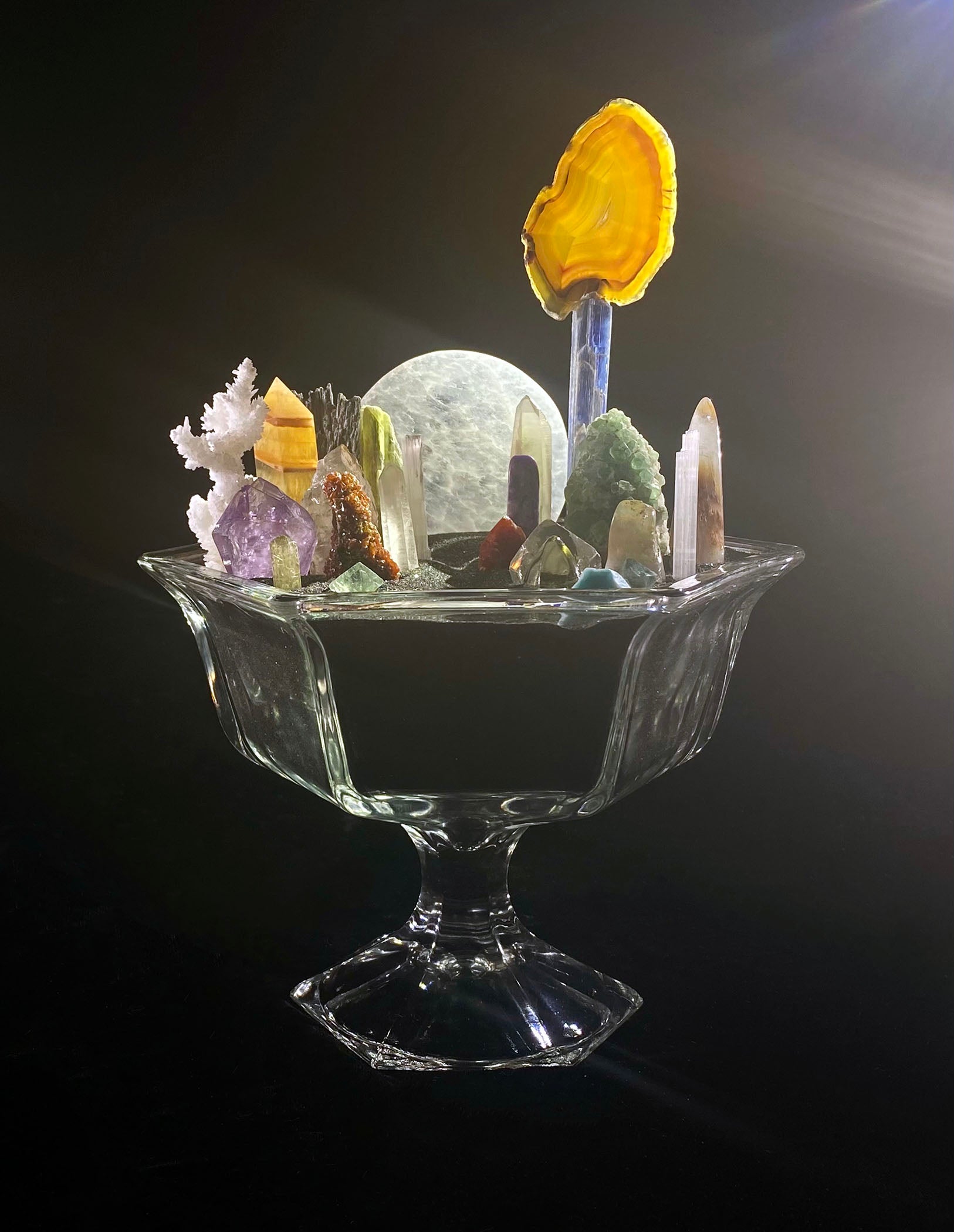 For this Melody Bowl I repurposed a beautiful vintage glass compote with an array of different types of crystals using a bit of imagination to create different types of colorful candles. My vision for this bowl was to create a peaceful night scene, a space for stillness, imagination, wonder and hope.