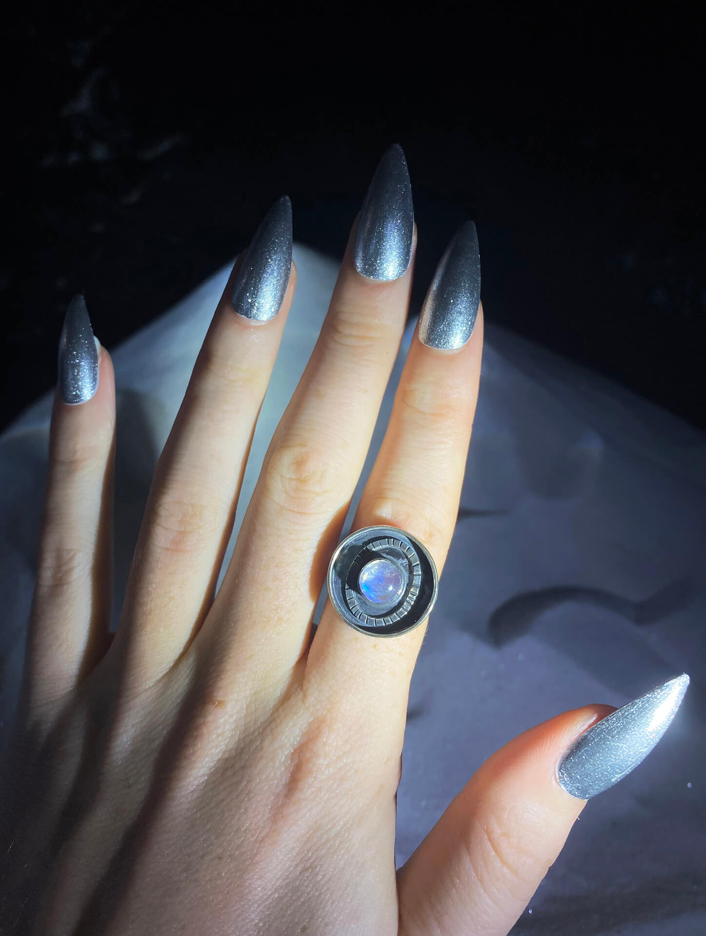 A mini flying saucer. A crop circle. A super cute rainbow moonstone ring. You'll be the centre of attention in this beauty. What ever you see, I'm sure we can met somewhere in the middle. Anyways, the good vibes I get from this ring are all encompassing.