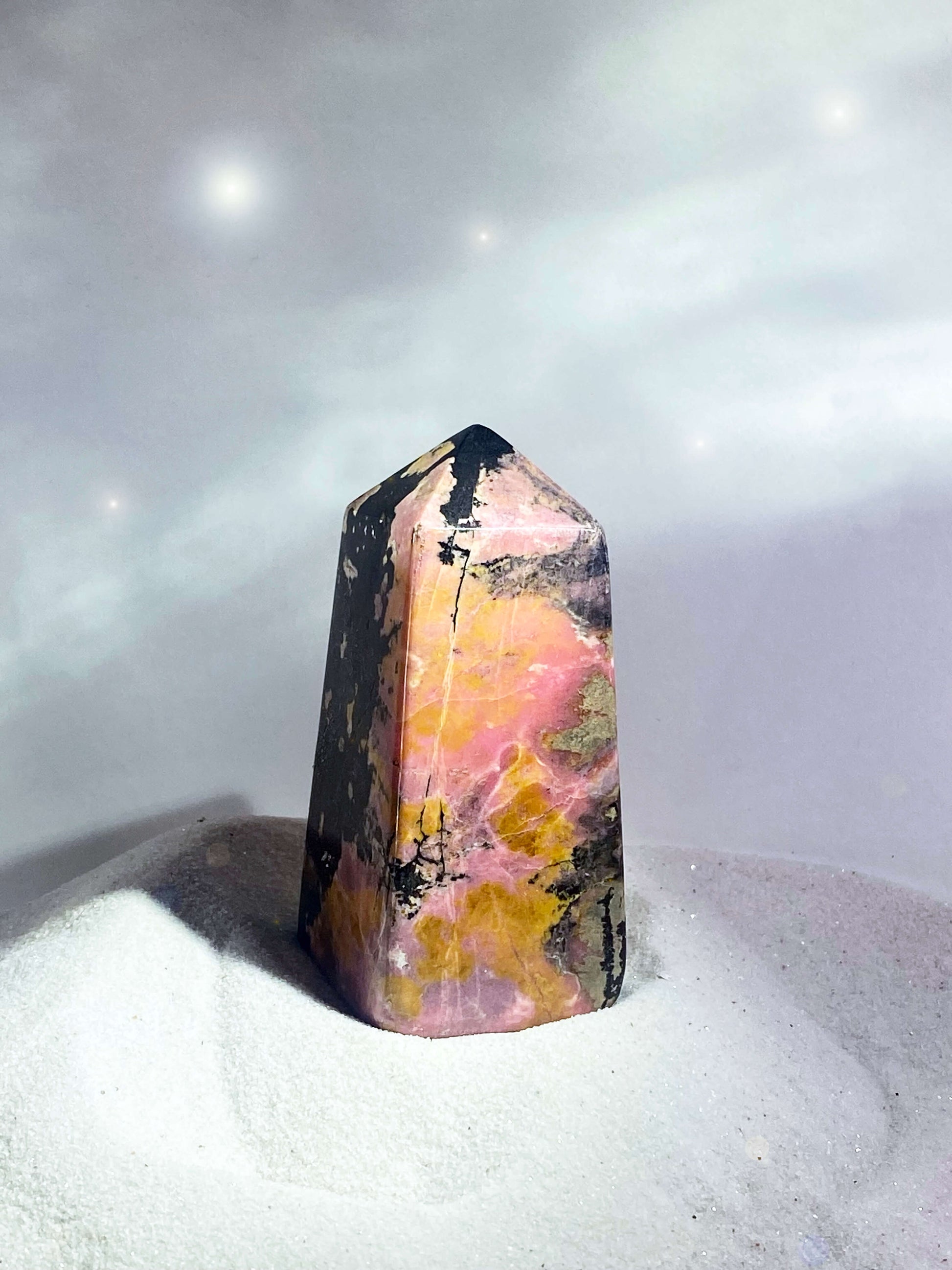 This is a high quality Rhodonite tower that was hand-picked for it striking ink-like markings atop of beautiful blend of pink and yellow hues. This tower radiates a nurturing and loving energy, something we all need to be reminded of. It is an ideal crystal for clearing away emotional wounding from the past and aligning one to their highest potential.