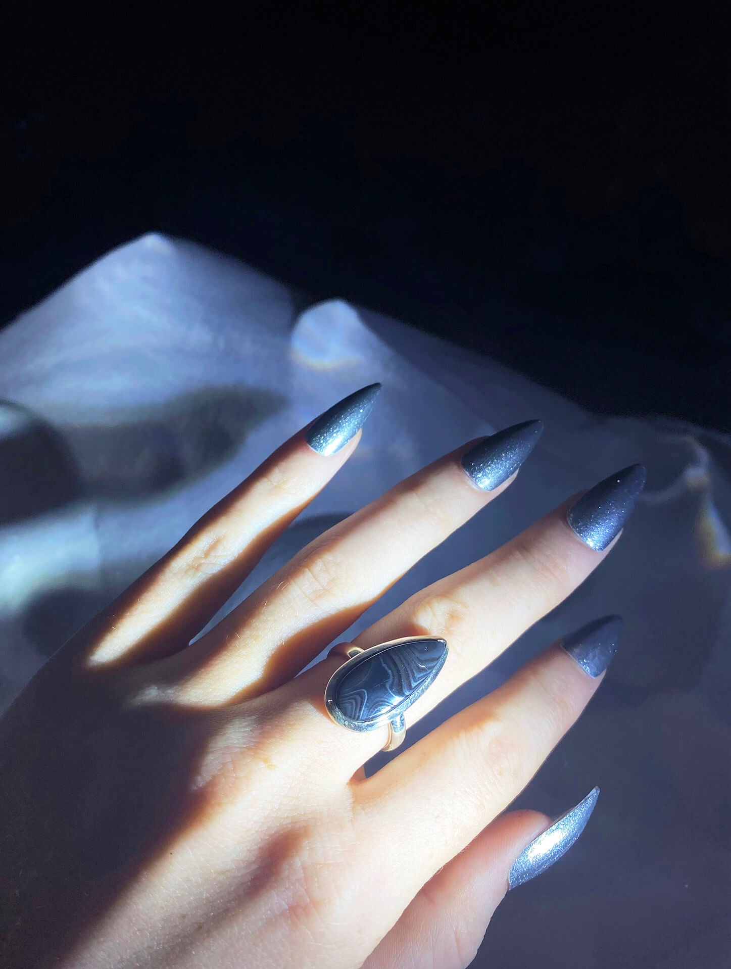 Mysterious, alluring, pensive....are just a few of the words that come to my mind when gazing at the black curves in this Crown of Silver Psilomelane ring. It hints to us the reflection we see of ourselves can often be distorted and warped. That the illusion we have of ourselves can be caused by our emotions and unbalanced state of being. Following these bands brings awareness and unlocks what is inhibiting us from our best state of being.