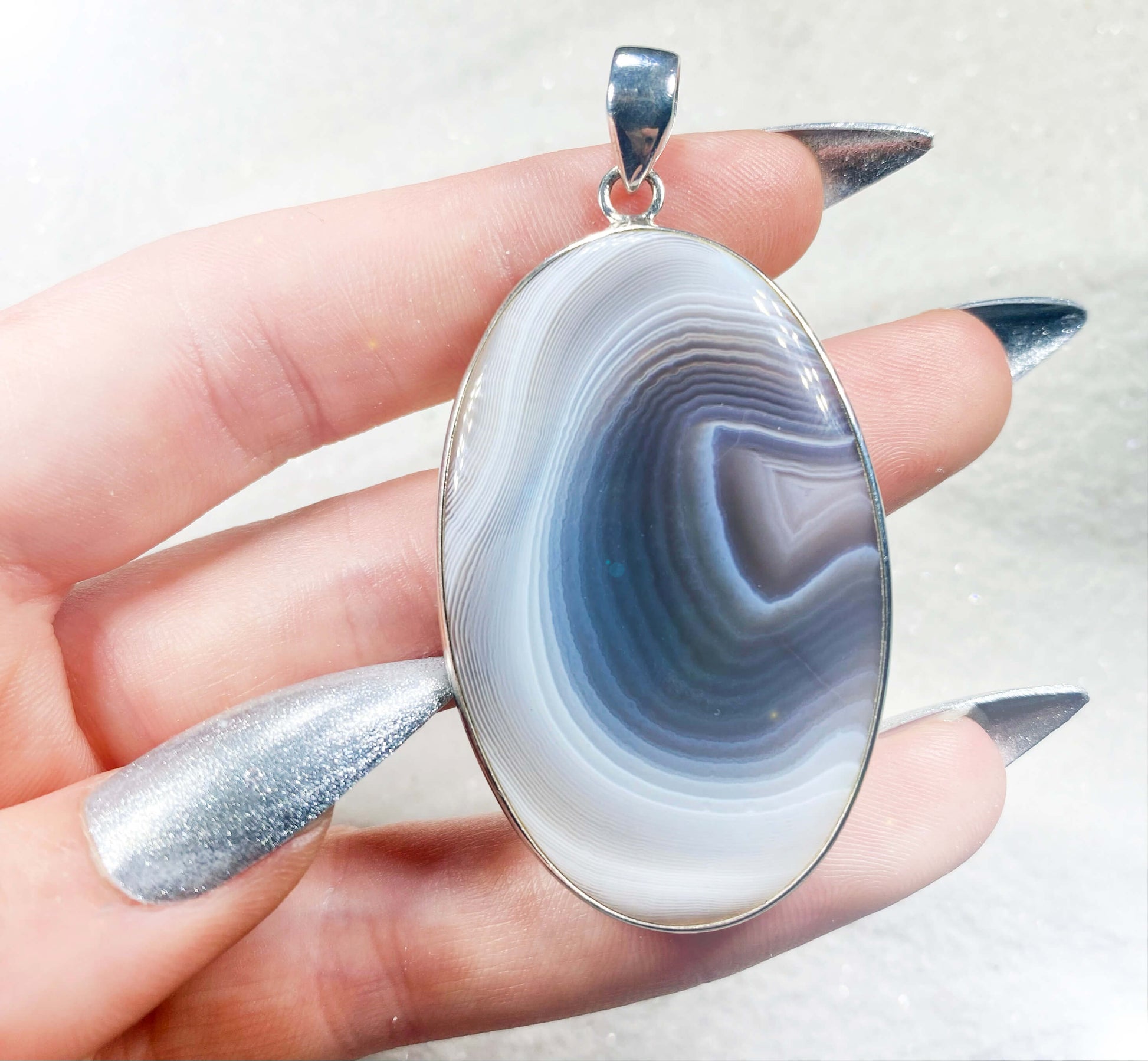 This Exquisite Botswana Agate has the most mesmerizing banding of soft purpley-grey and white tones. This extra large statement pendant piece is eye-catching and calls for a true lover of stones.