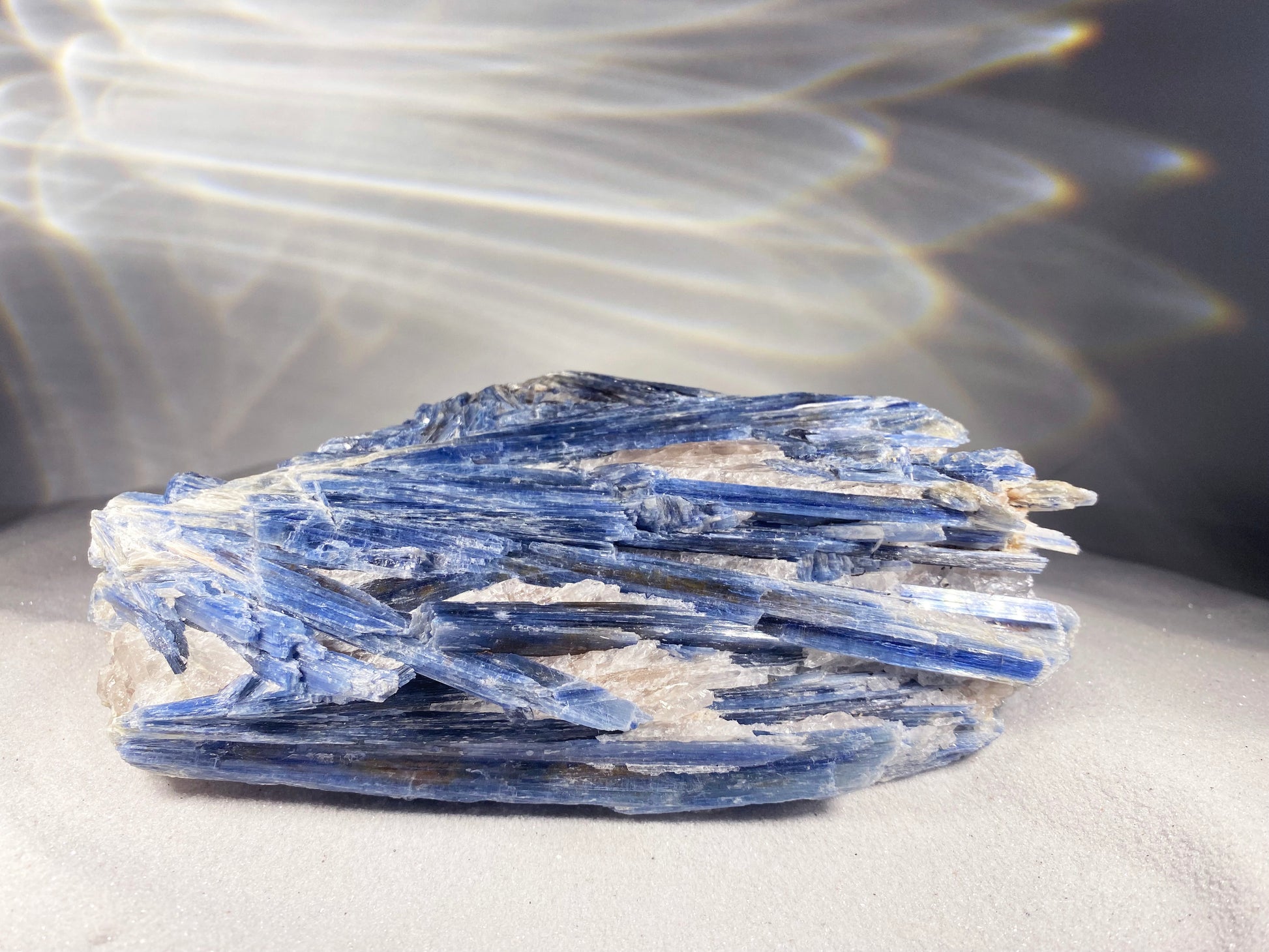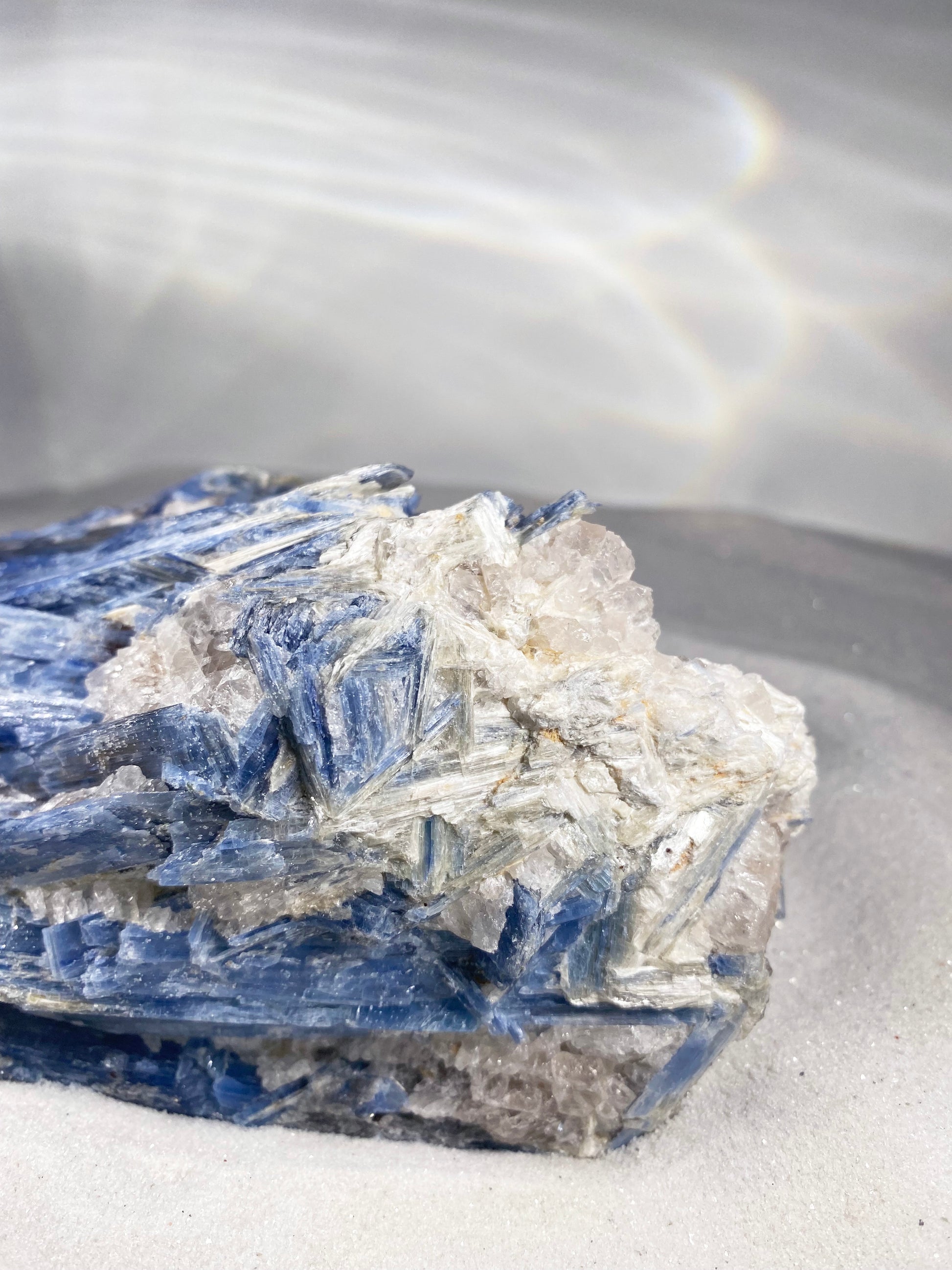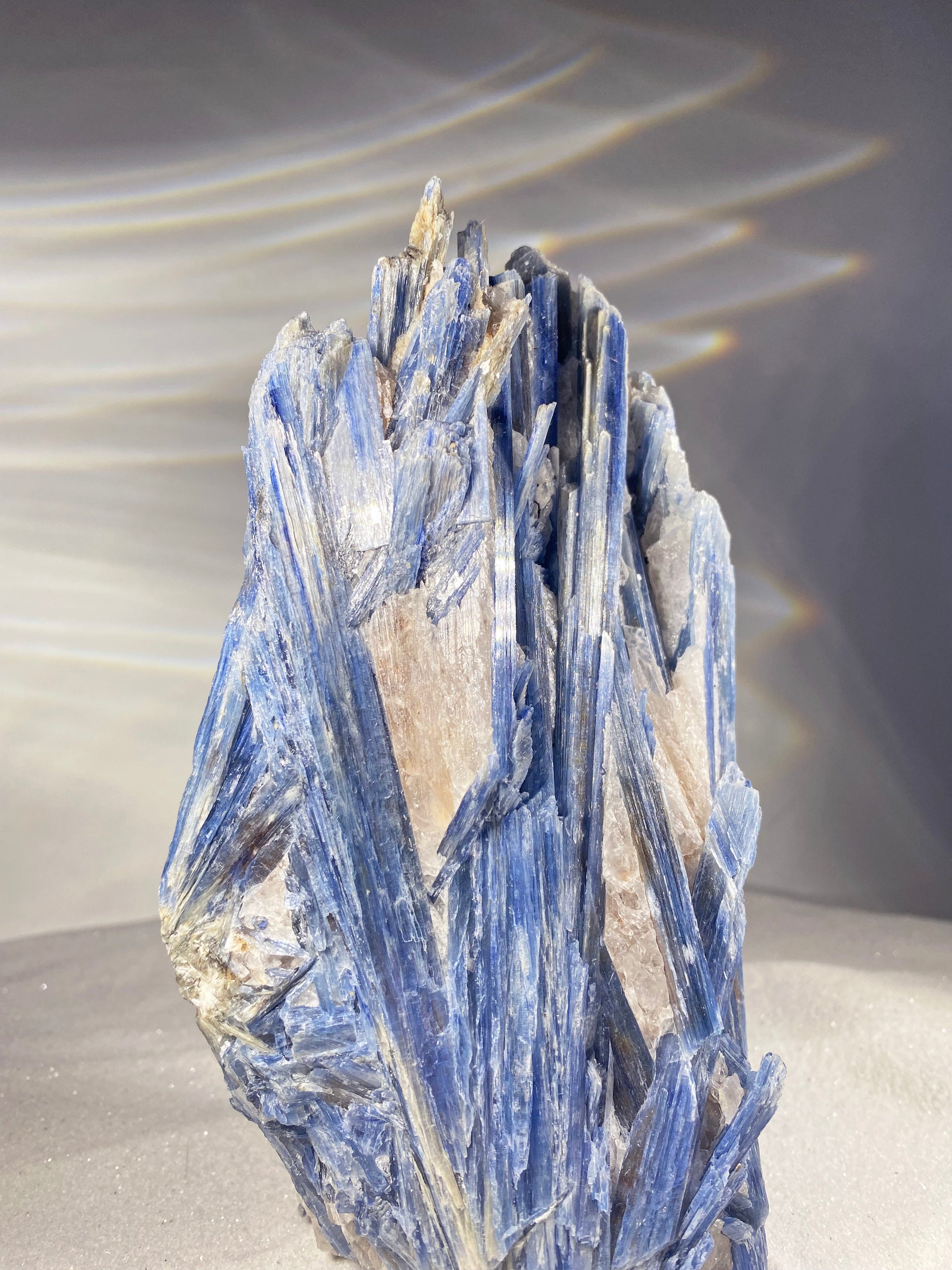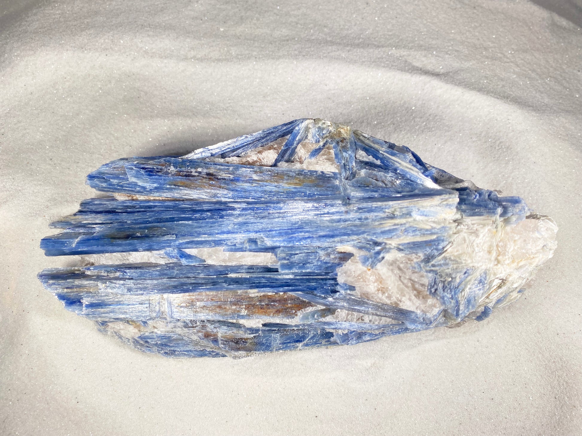 Kyanite is one of those crystals that fascinates those who lay eyes on it. Its typical growth pattern of sprays of bladed crystals with its bright blue color makes this mineral unique and iconic. The specimen here is of spectacular quality creating a beautiful display of thick rich blades imbedded in a host stone of Quartz. This extra large Kyanite crystal makes a beautiful addition spreading positive high vibrations in your space.