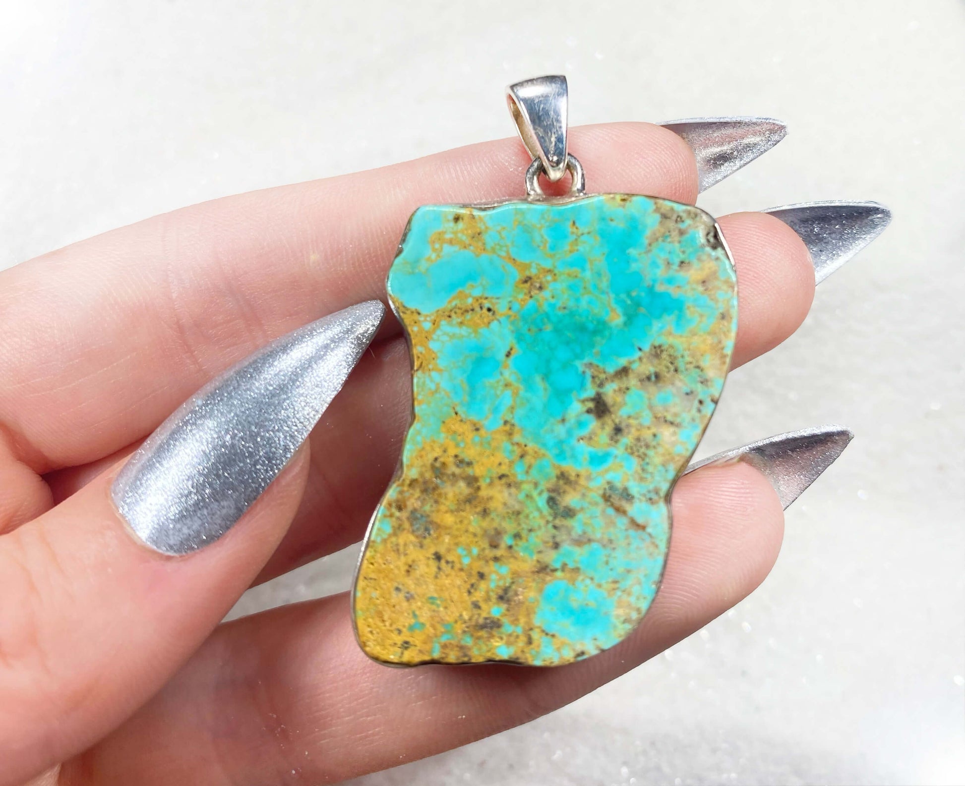 This is an extra large statement pendant featuring a spectacular cut of natural and authentic Sleeping Beauty Turquoise. This is a true collectors dream piece and would be a wonderful addition to any turquoise lovers collection. Though you don't have to own any turquoise to fall in love with this one, it could be your very first to admire and love.
