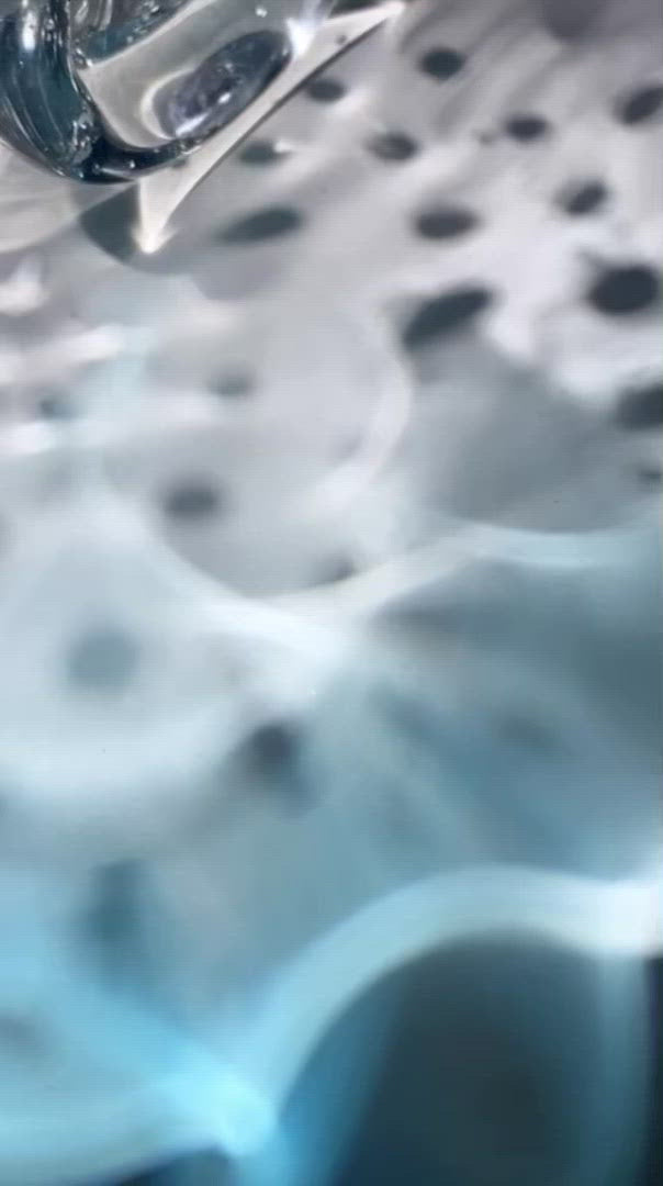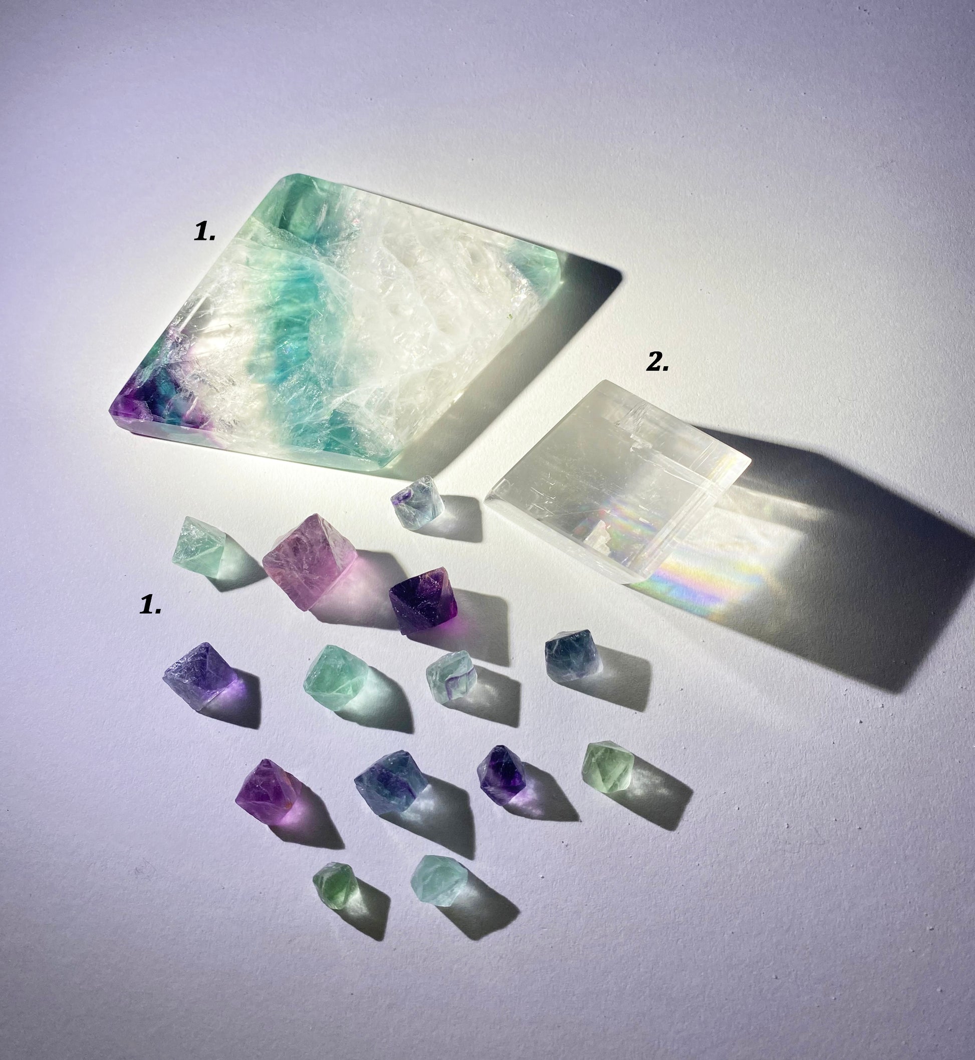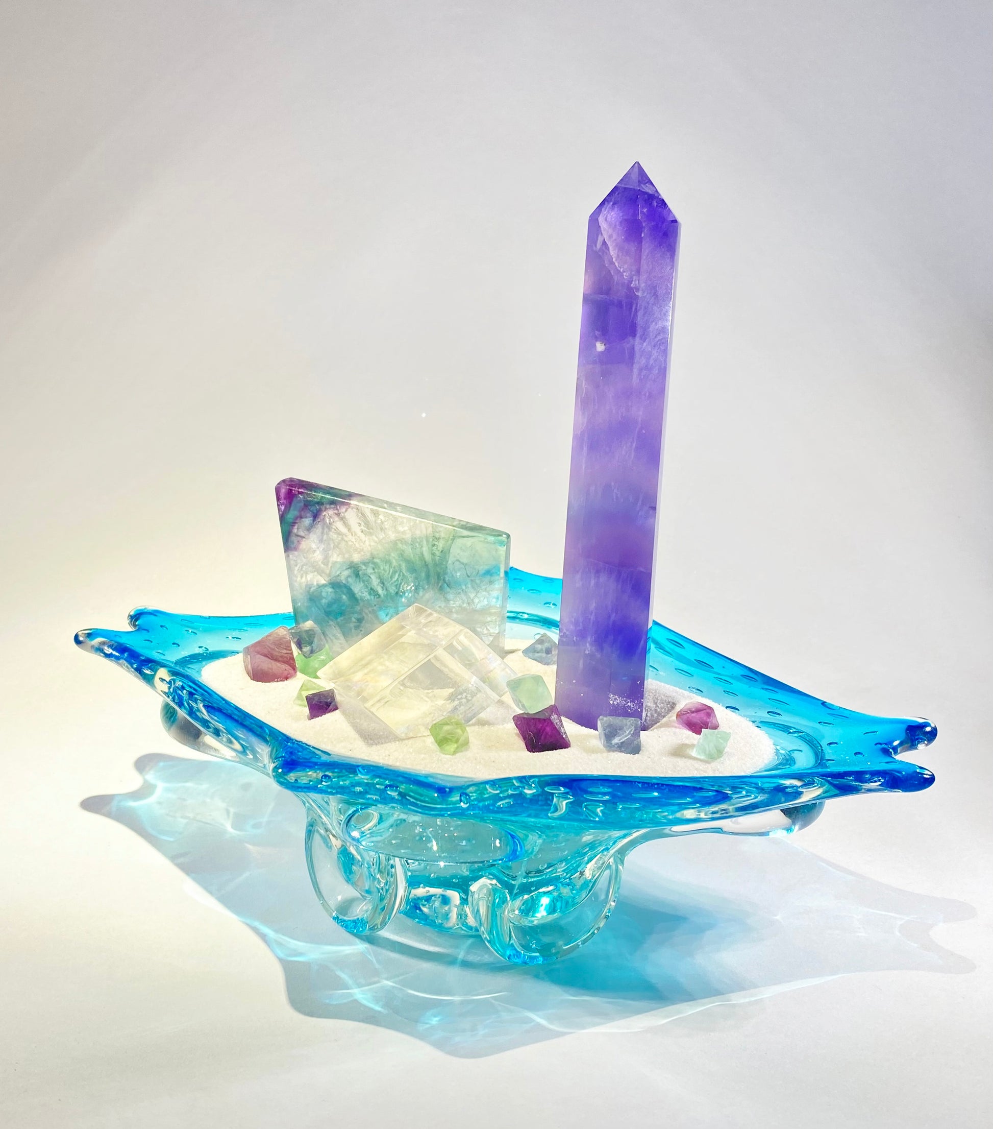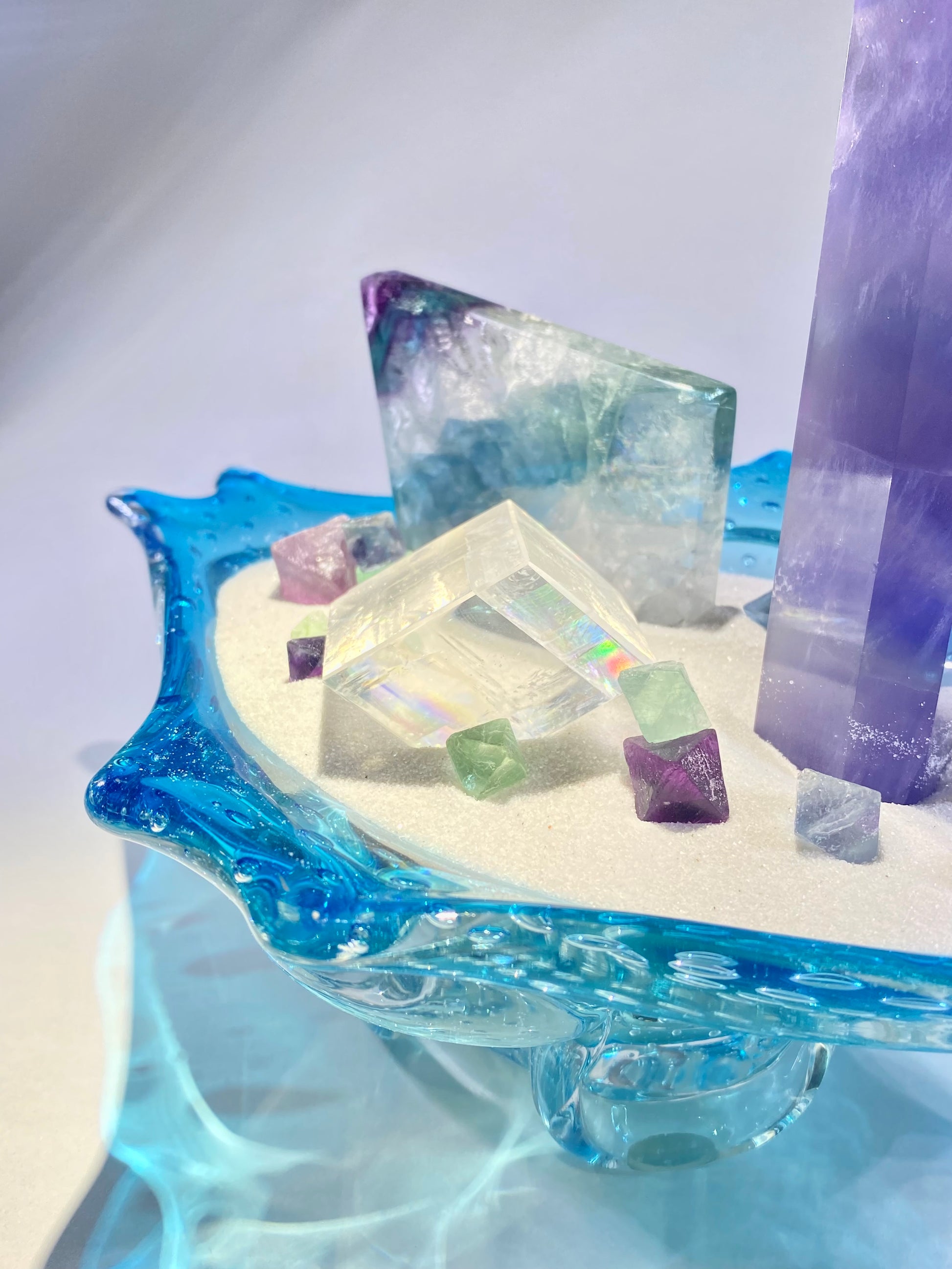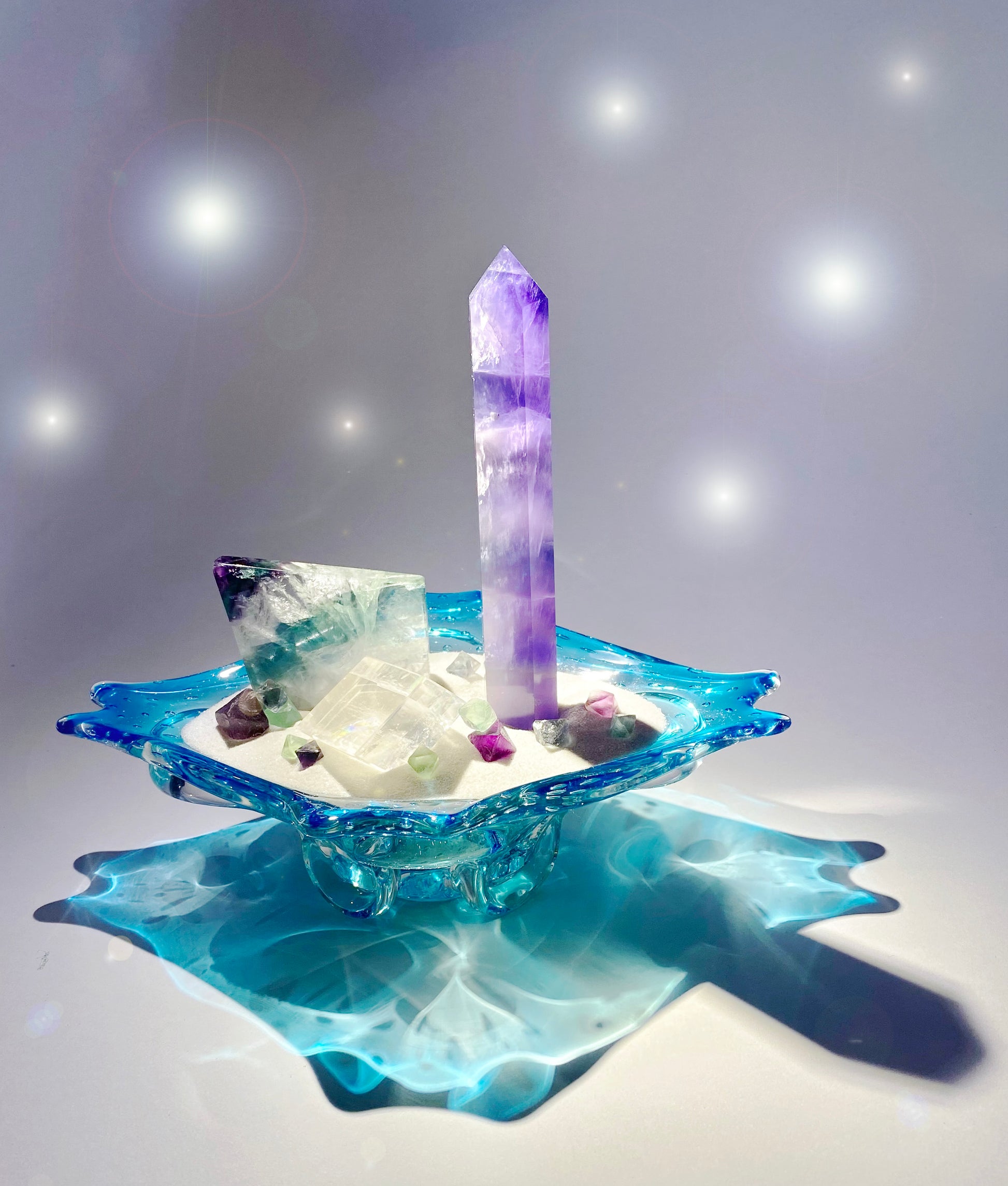 Foxy Fluorite is a groovy curation of colorful Fluorite shapes and a rad Optical Calcite with stellar rainbow inclusions. Together they create the perfect vibe for getting your boogie on or just chillen at the pad. This flavorful and futuristic energy transports you to the 70s crib of your dreams. The juicy handblown blue bowl with its encased bubble technique has me chillaxin’ on an inflatable sofa. This Melody Bowl is far out baby! You catch my drift?