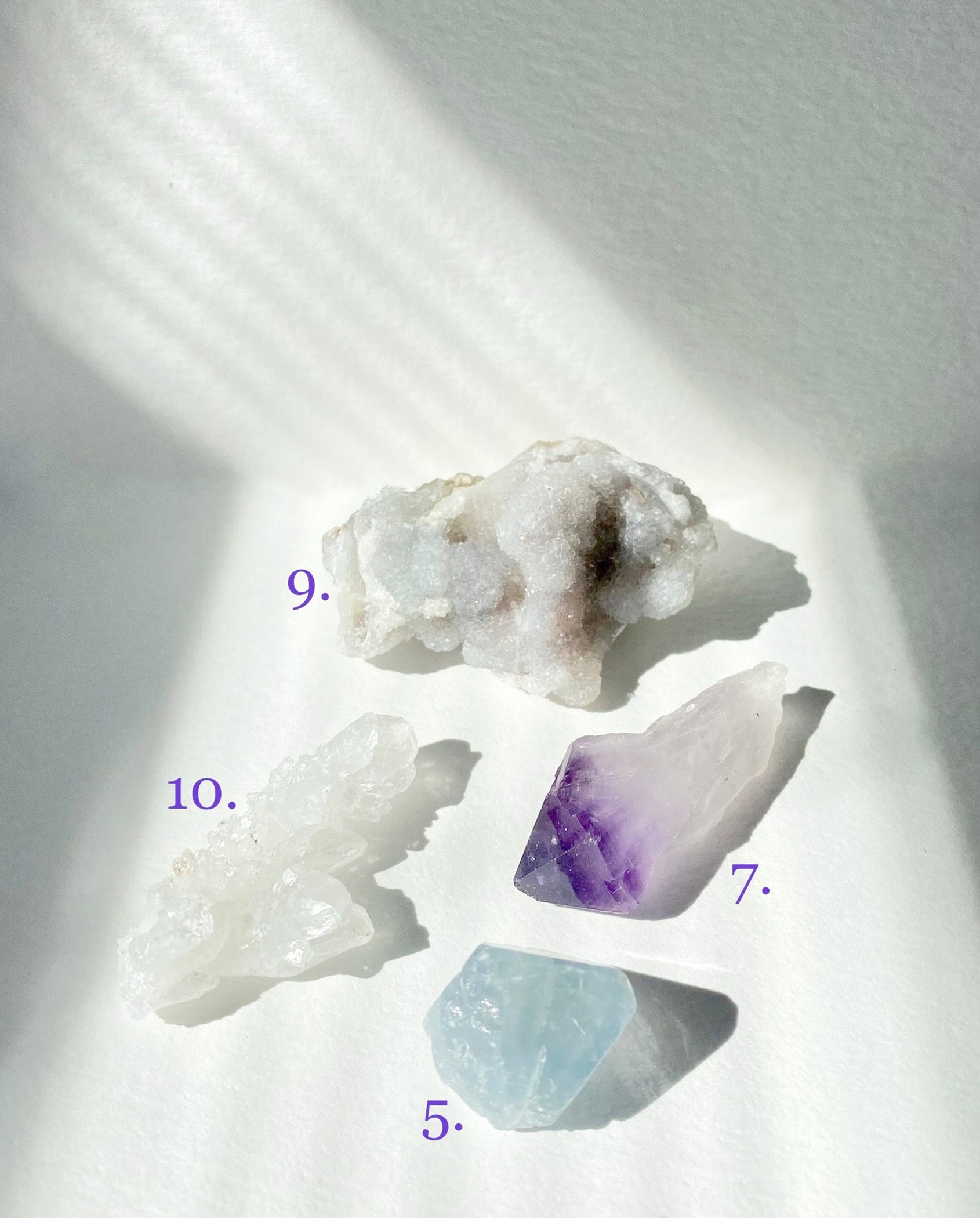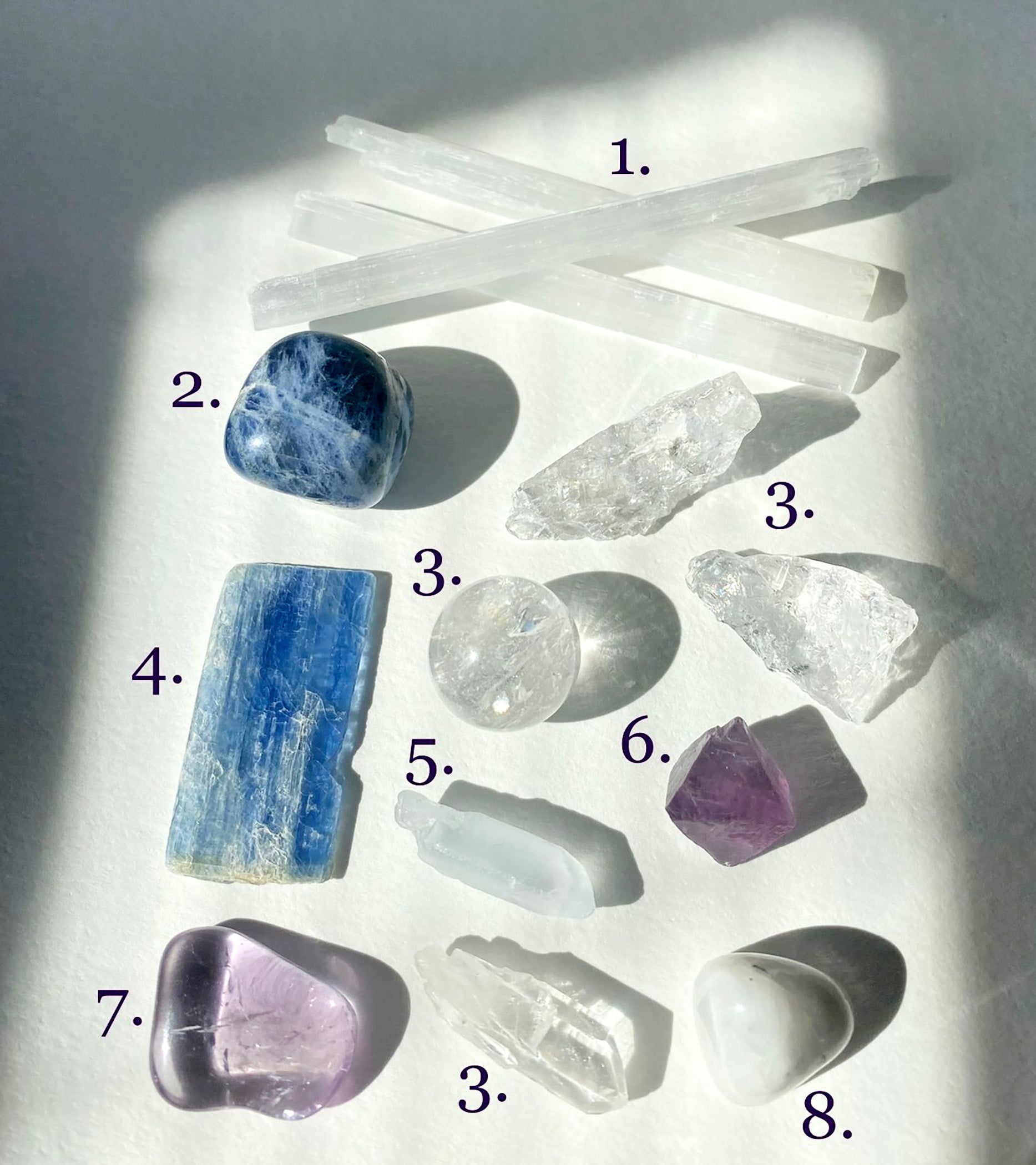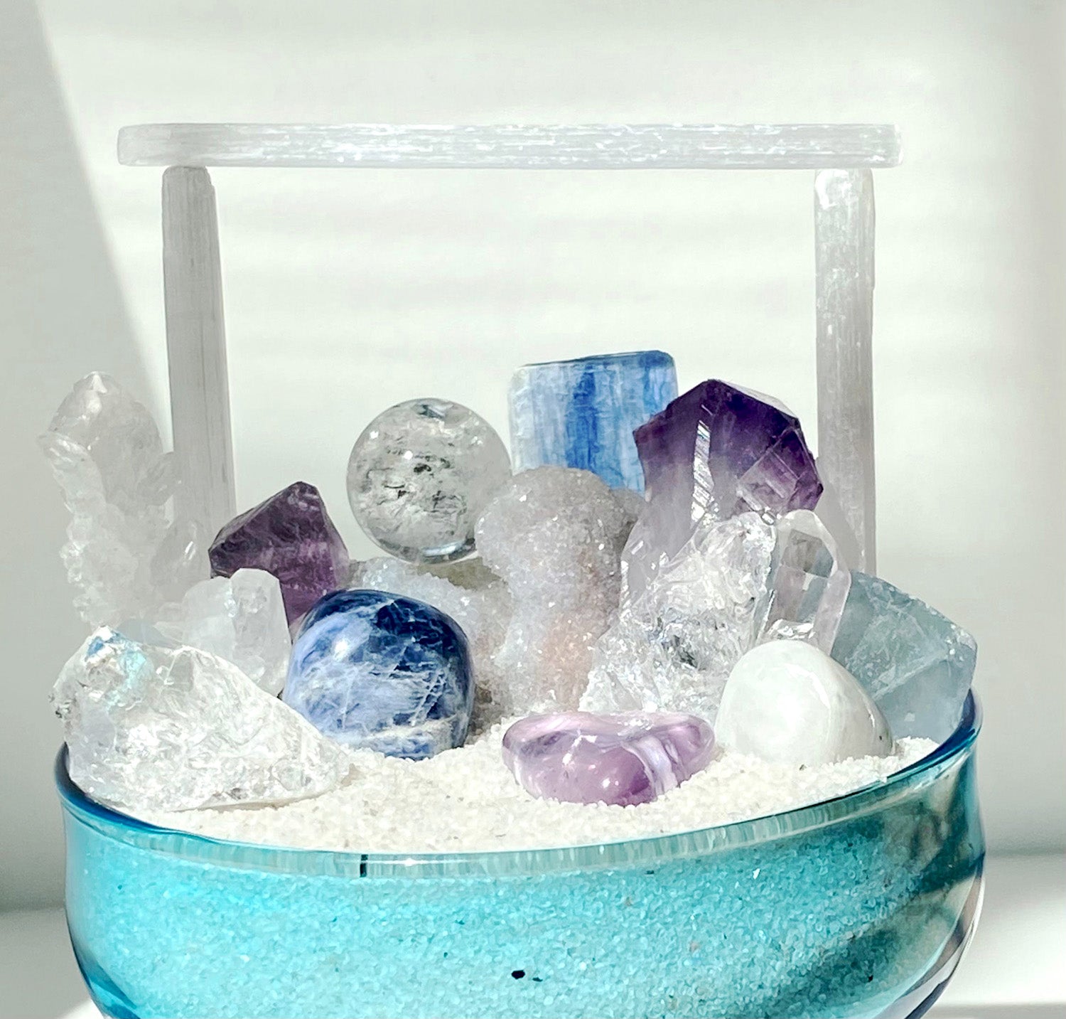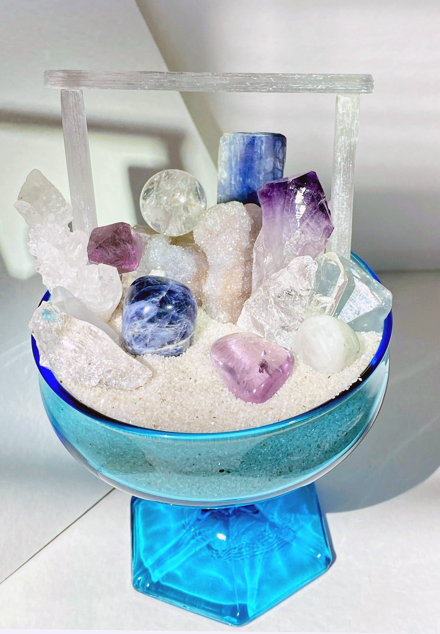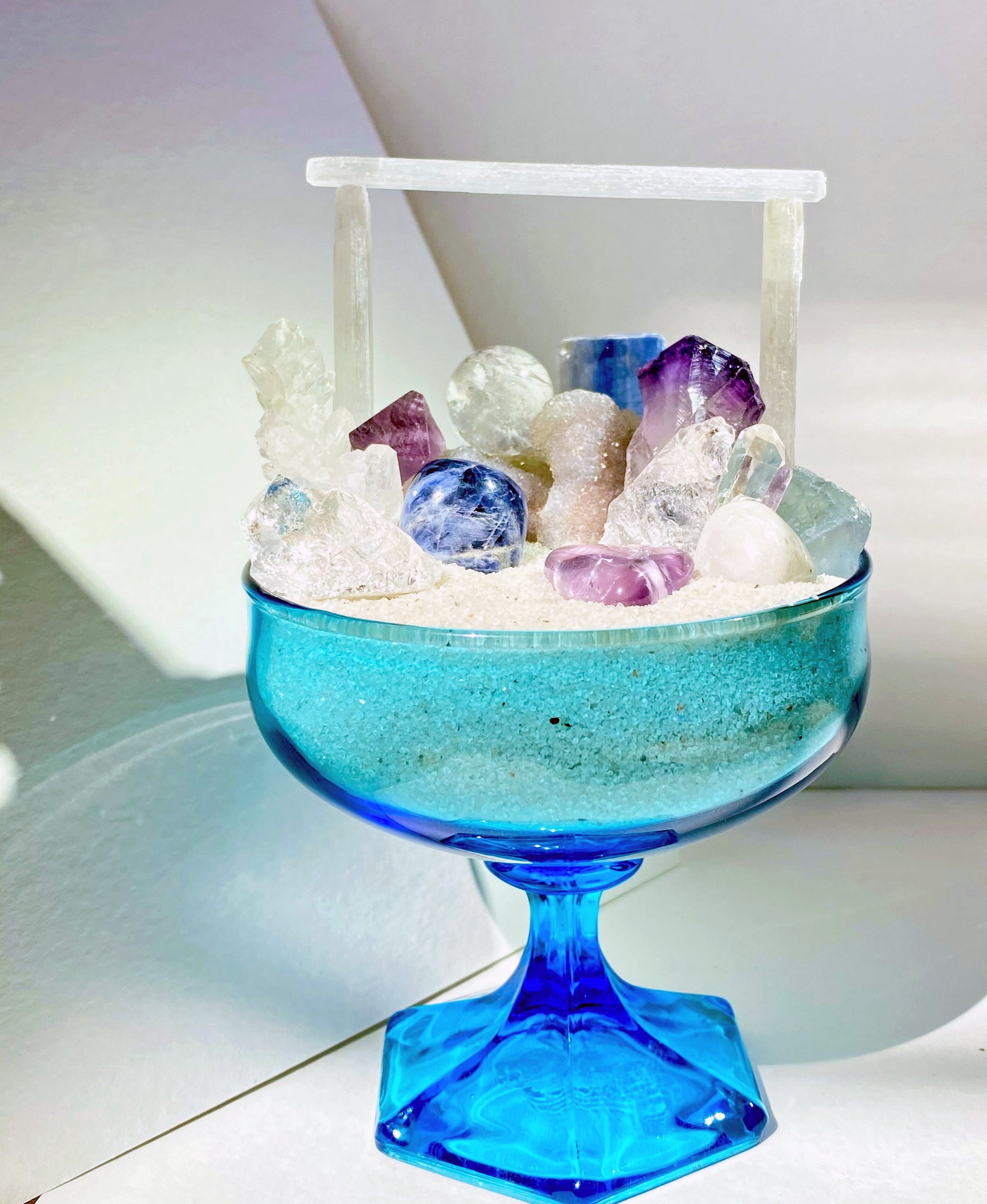 I used crystals that are purple, blue or white for assisting in a peaceful night’s sleep, with strengthen ability to dream. The energies of the crystals in this bowl will help you sleep soundly as you drift through the dream gate to a mystical land where those who await to meet you reside. The vessel for this melody bowl is a vintage and repurposed cobalt blue dessert dish.