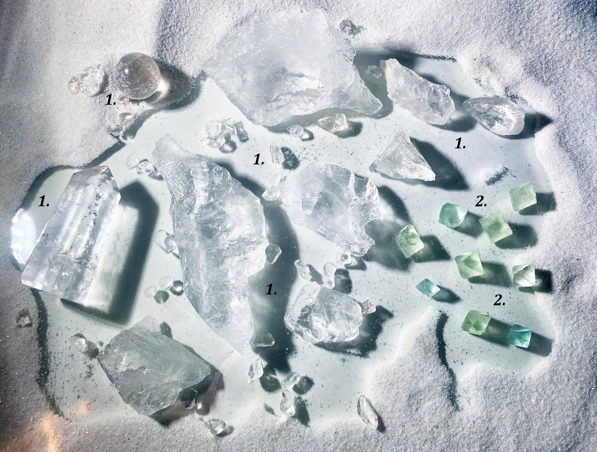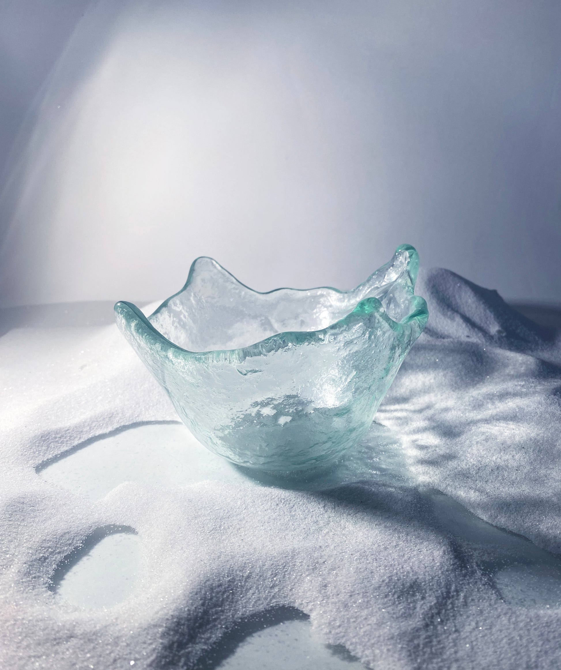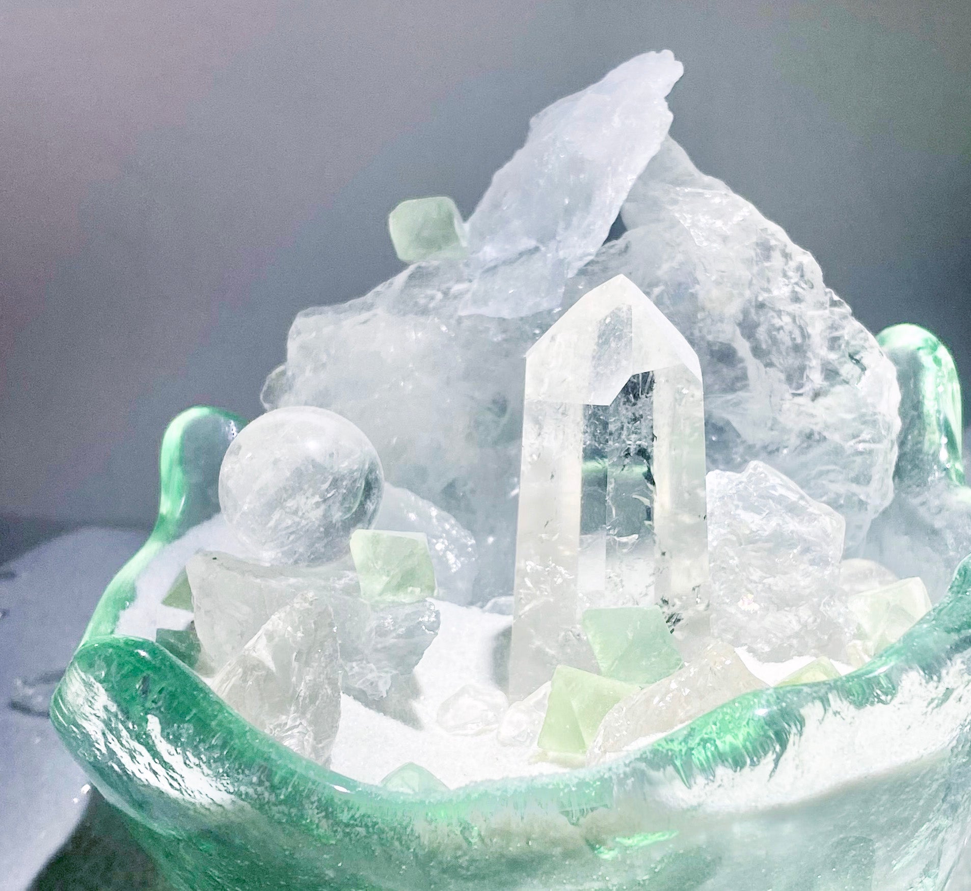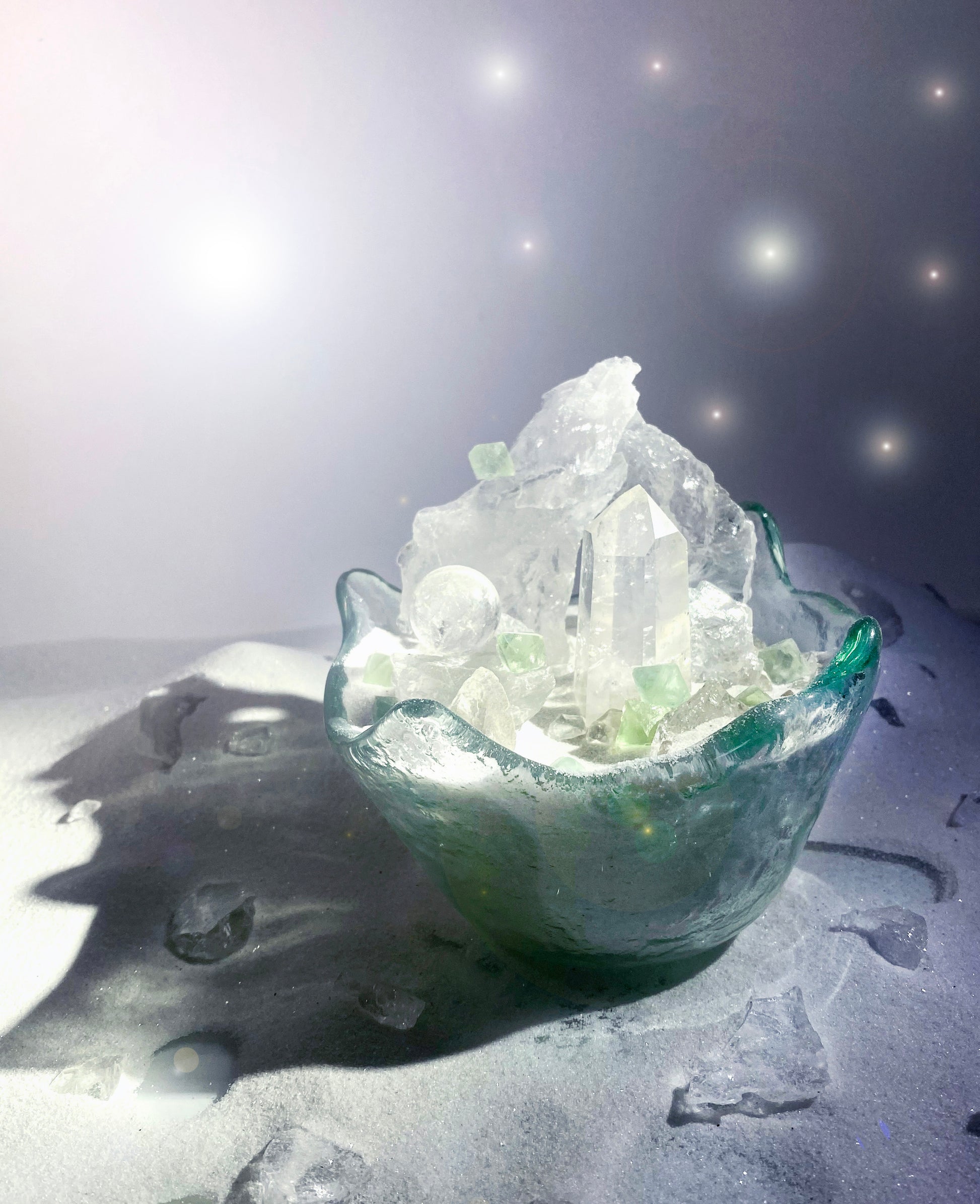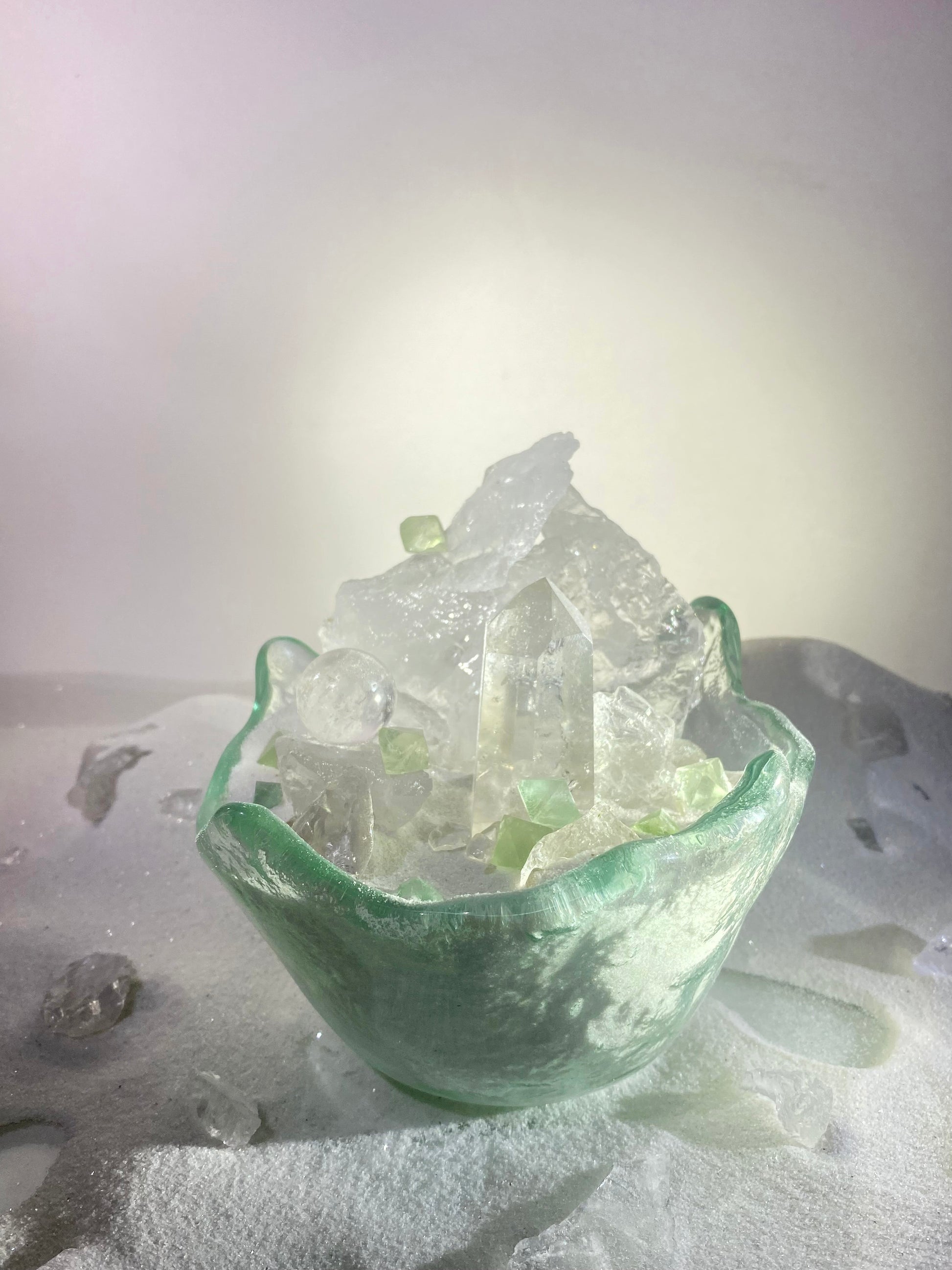 This bowl was made by using a textured handblown mint colored bowl resembling ice. The ice was constructed by only using different clear quartz shapes and icy spearmint green fluorite octahedrons.
