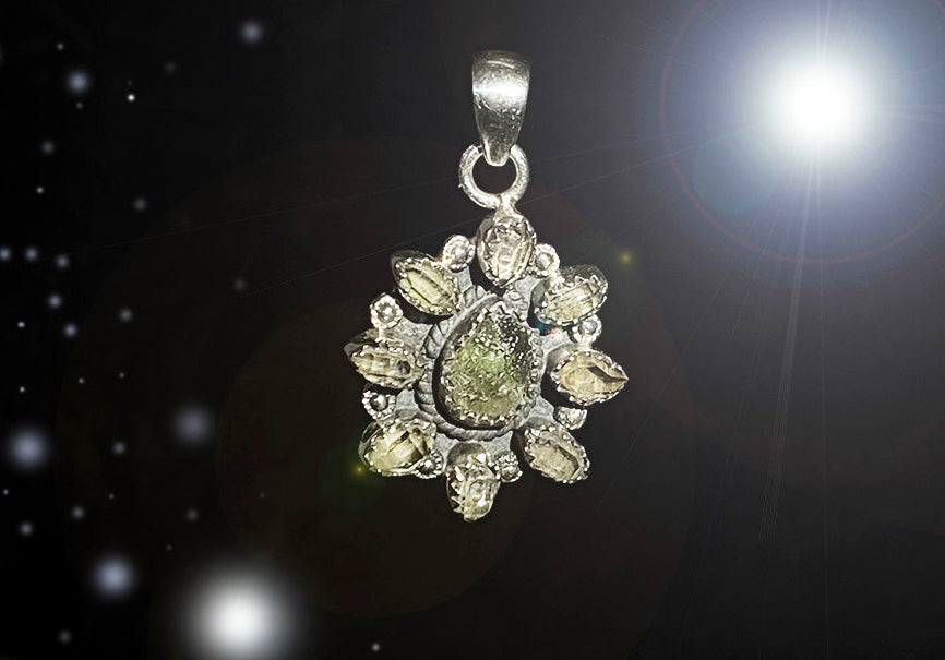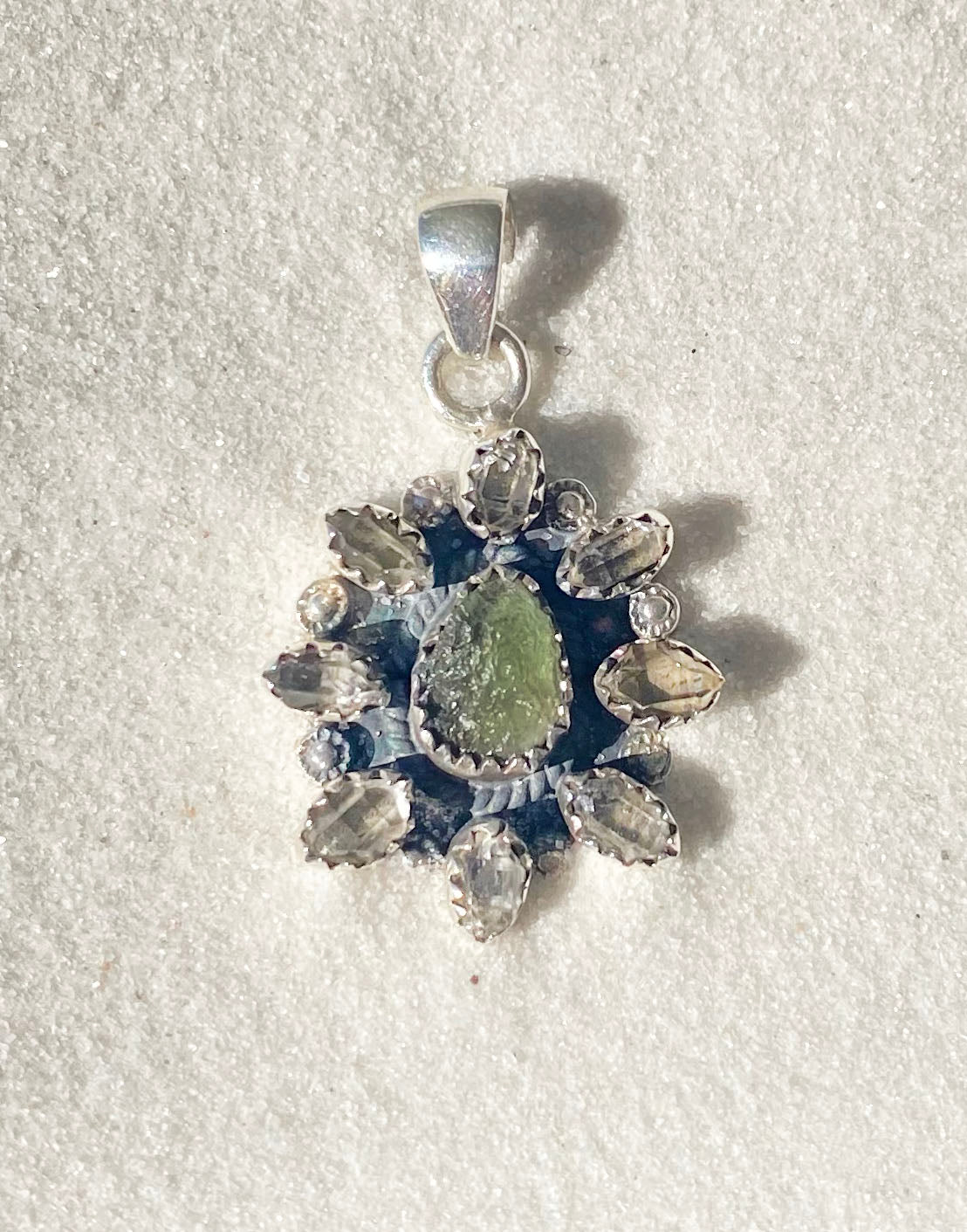 One-of-a-kind. Sterling silver. Herkimer Diamonds from Herkimer, NY. Moldavite from Czech Republic.