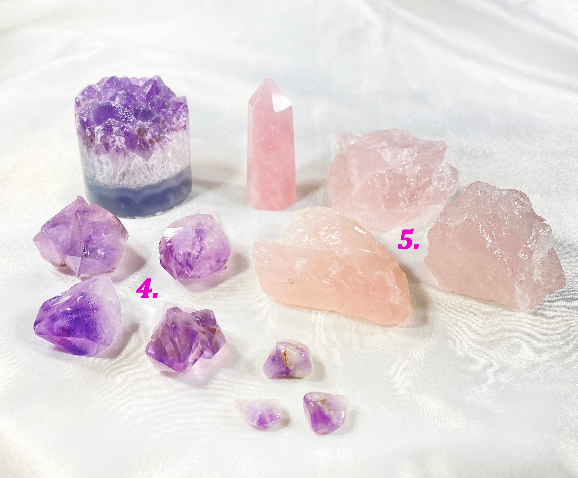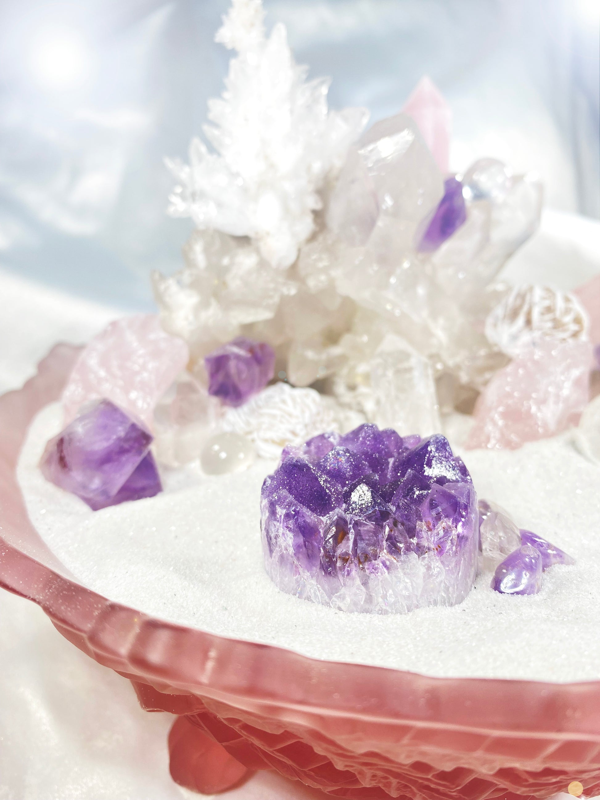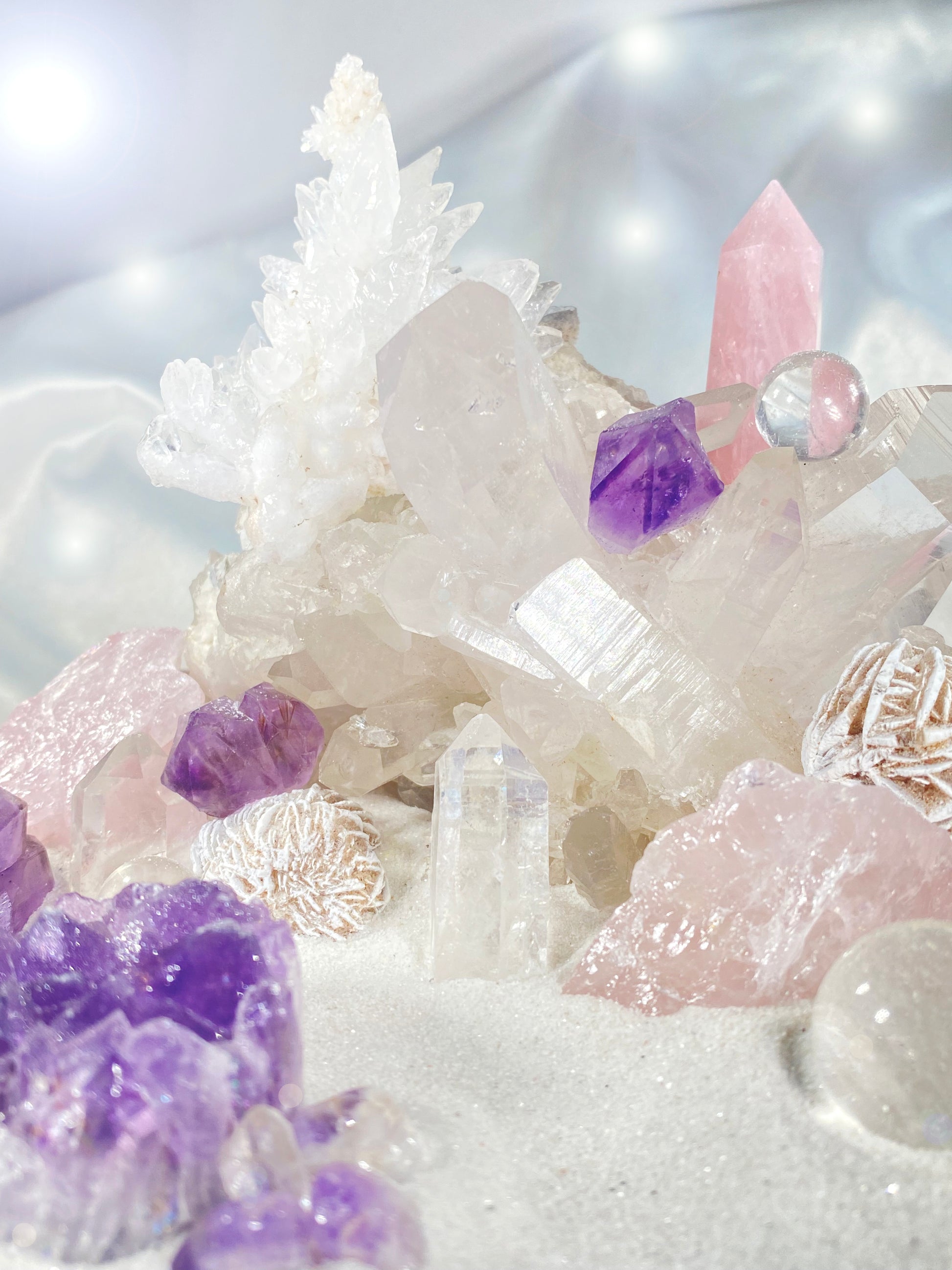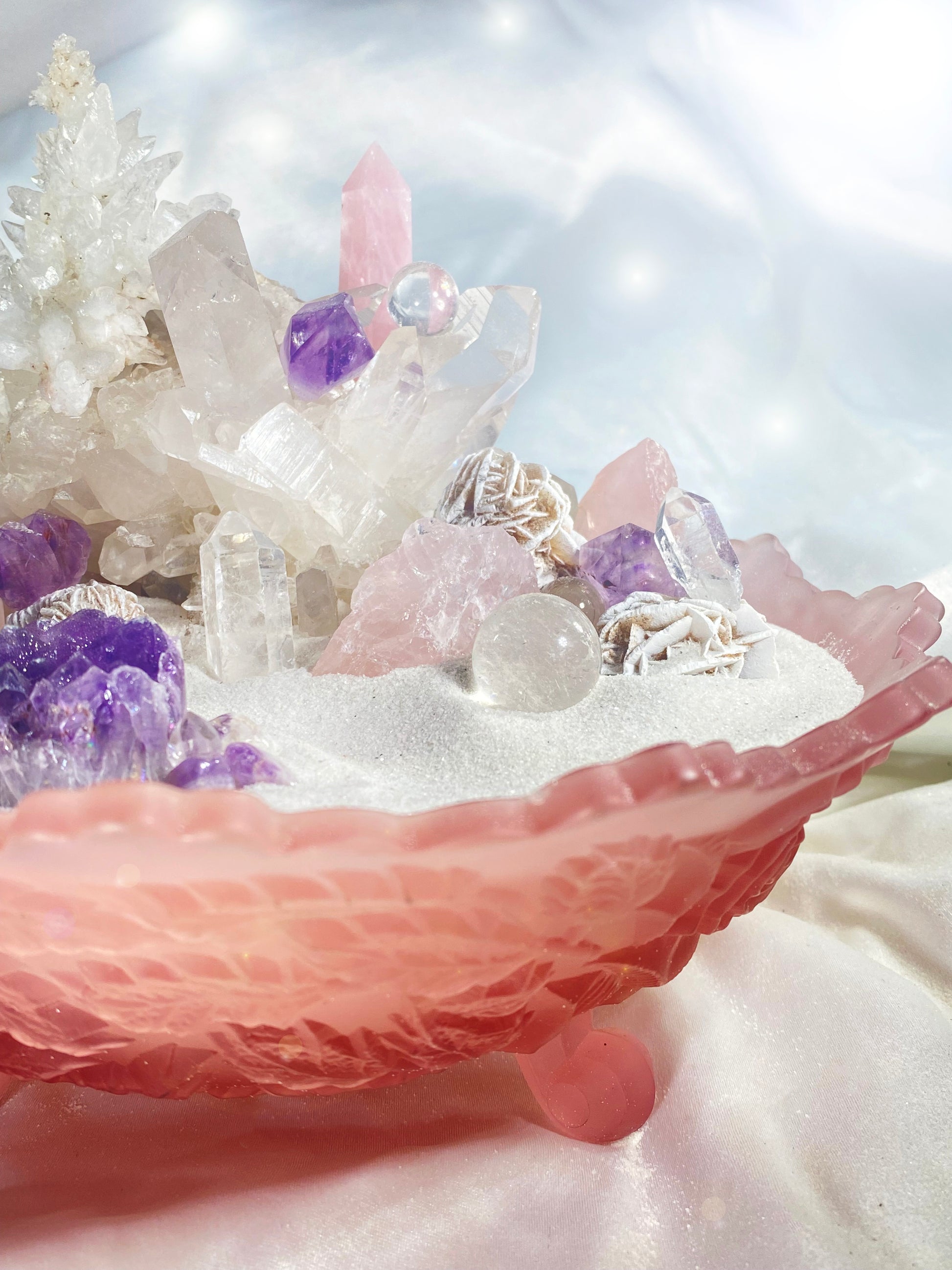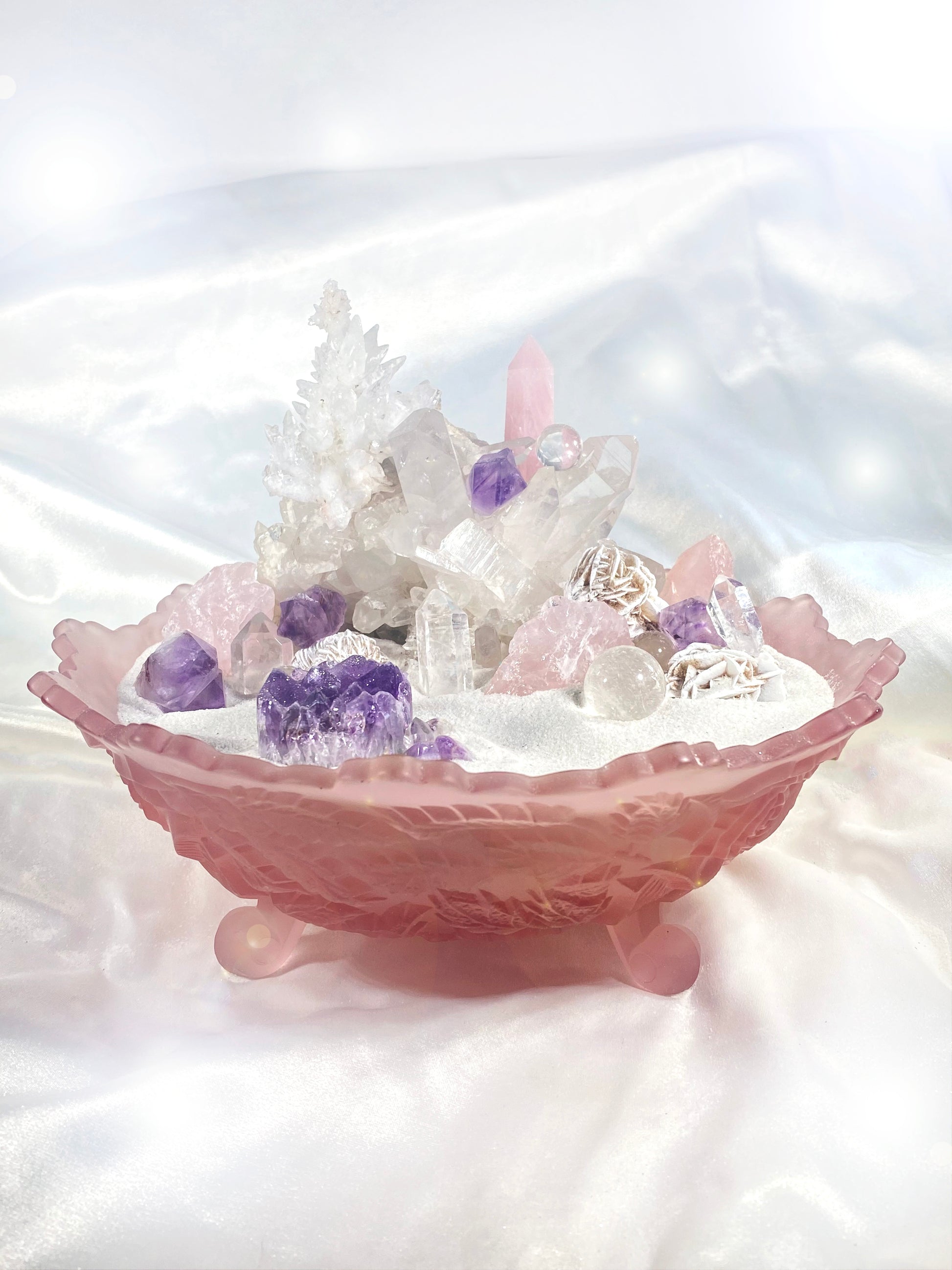 Oh Mi Amore! My sweet, sweet love! Showing your affection with a dozen of roses is a classic thing to do. But you could also say it with a blush colored, frosted vintage rose imprinted Melody Bowl that’s adorn with a fairytale of crystals…that will never die. However, the melody of this bowl is for all kinds of affection, whether it's romantic or the appreciation for yourself you deserve. This beautiful arrangement of lovely crystals is ballade to true loves promise. Rose Quartz, Amethyst, Clear Quartz and Desert Rose Selenite combine wonderful principles of love. Love is unconditional, love is healing and love is strong.