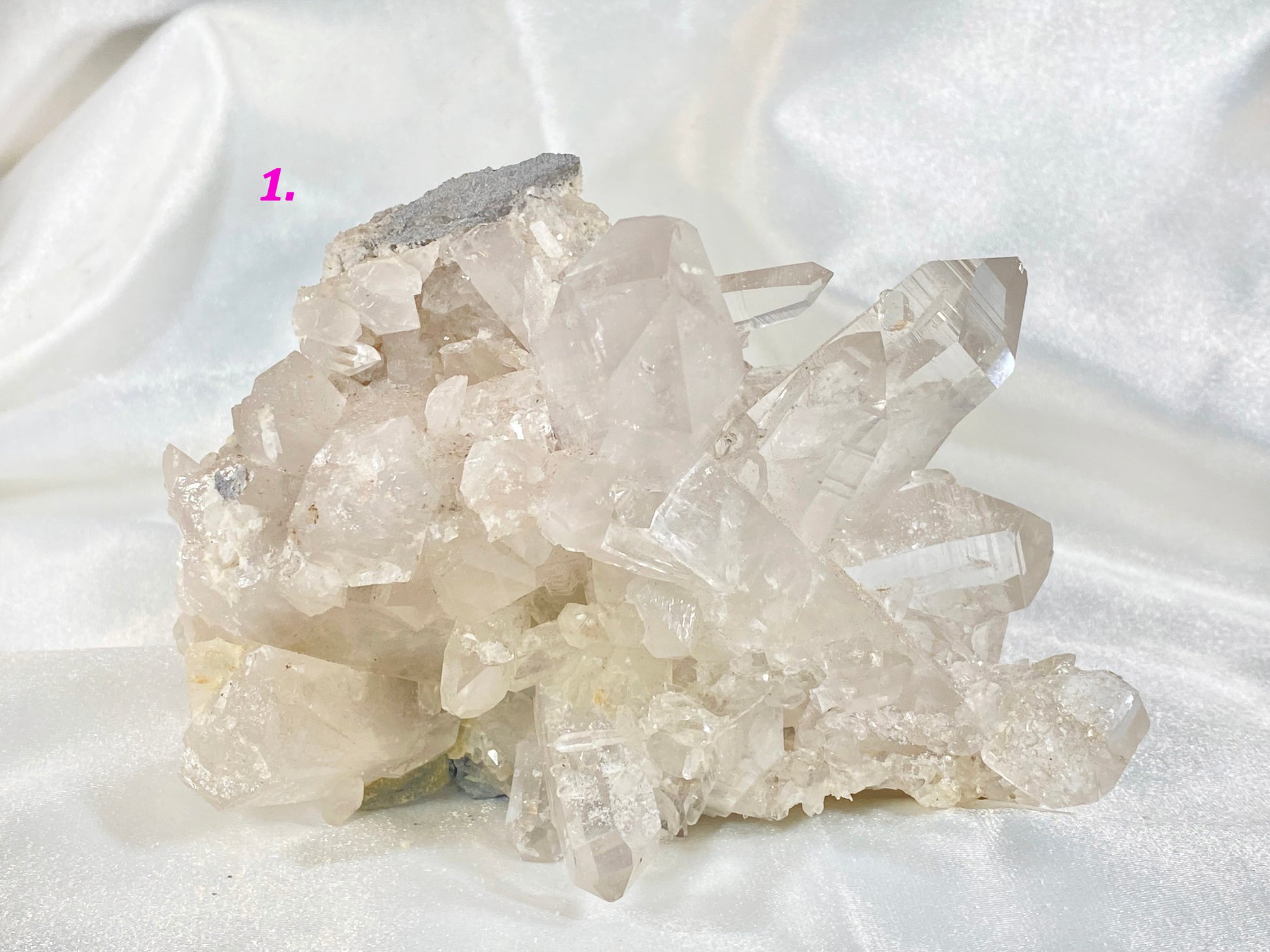 The center piece of this bowl is a beautiful Lemurian Clear Quartz cluster from Brazil. Many of the points in this cluster display horizontal striations or grooves on the points surface, creating a ladder-like effect. These marking are how you differentiate a Lemurian Quartz from the others. Lemurian Clear Quartz have a very special vibration that is said to reflect the legend of the lost advanced civilization of Lemuria, a place like Atlantis but more spiritually developed. Encoded into these crystals, through these lines are teachings on "oneness" and deep healing wisdom. Their vibrations are pure and are full of love and light.