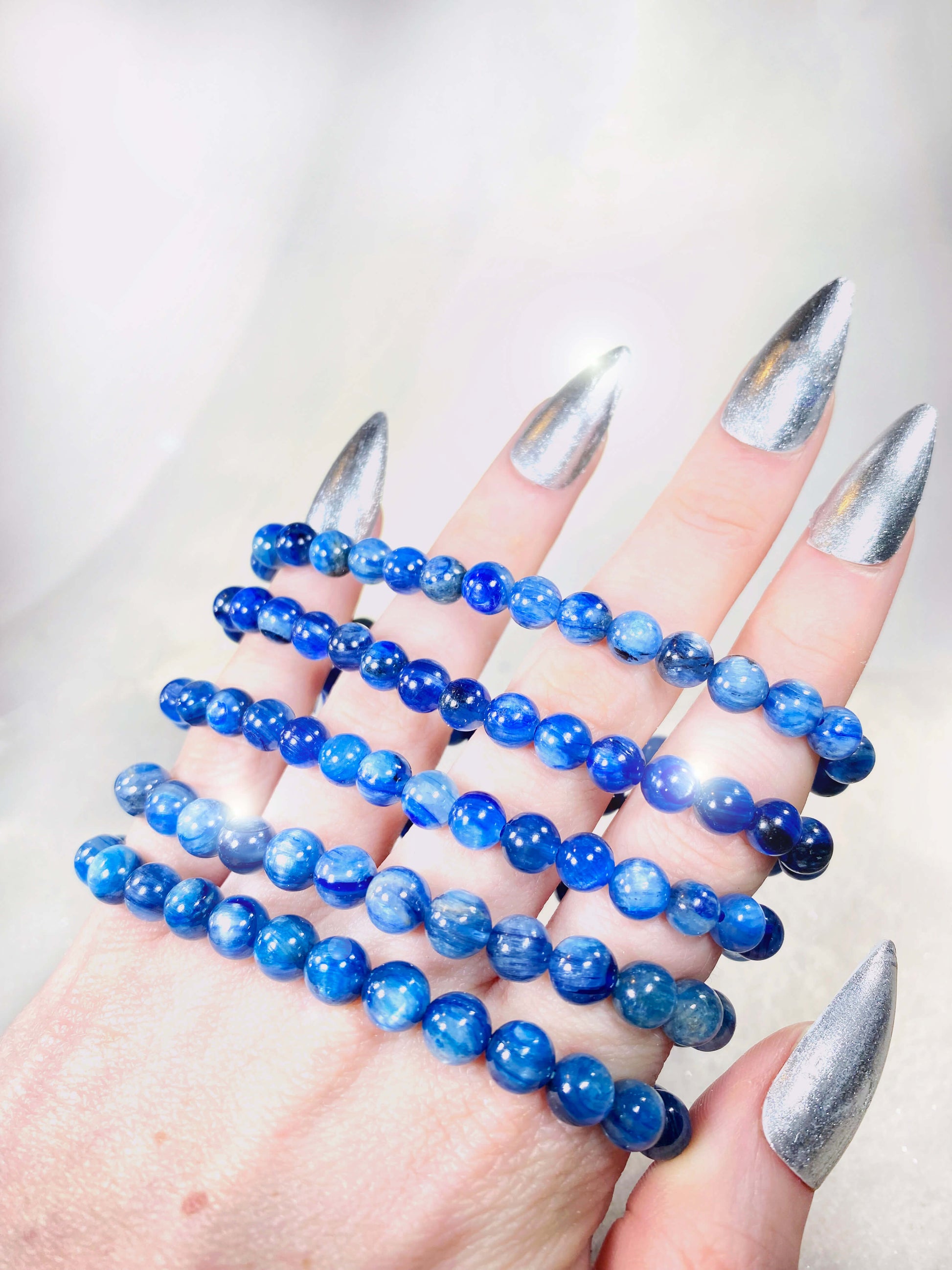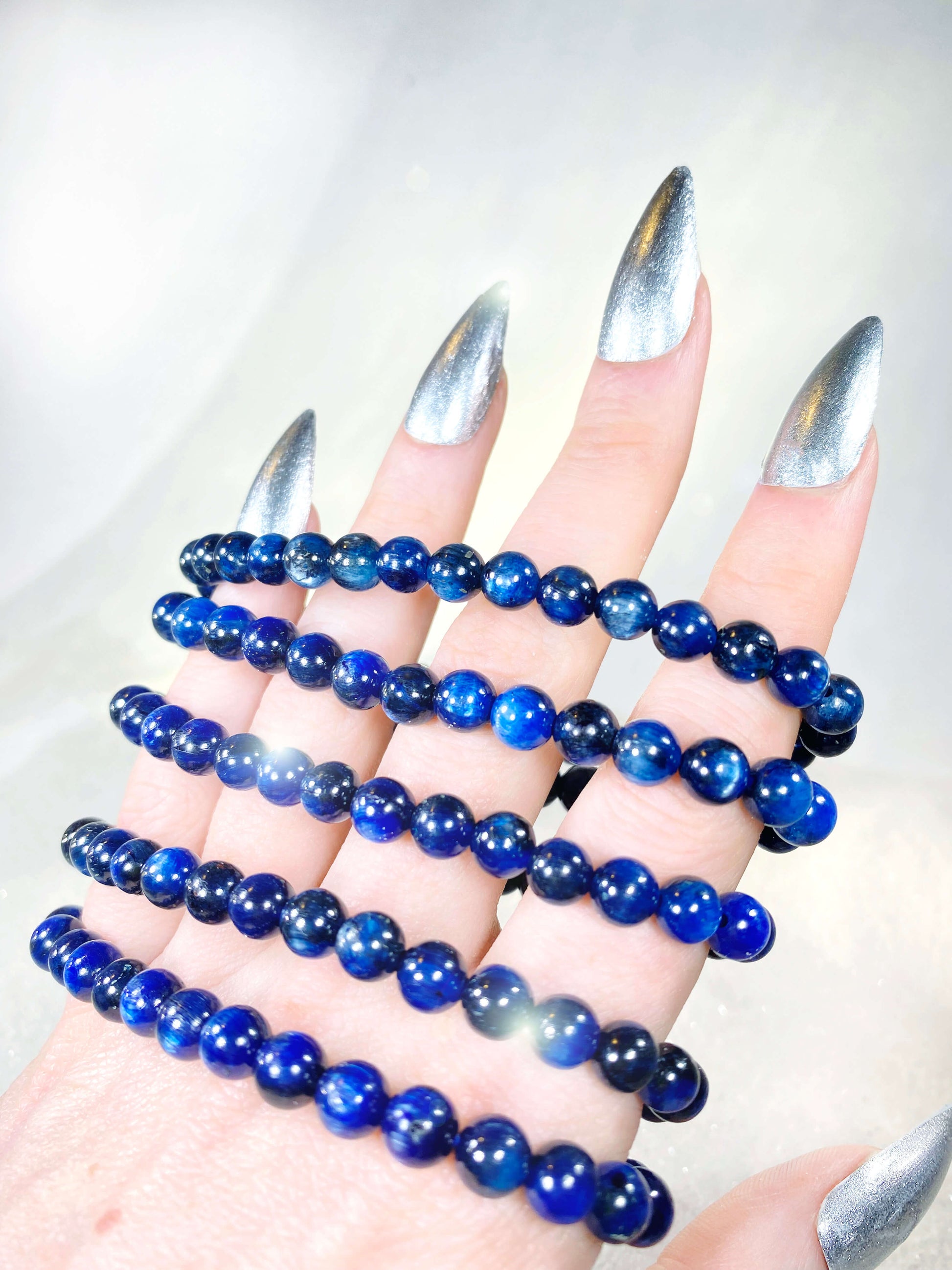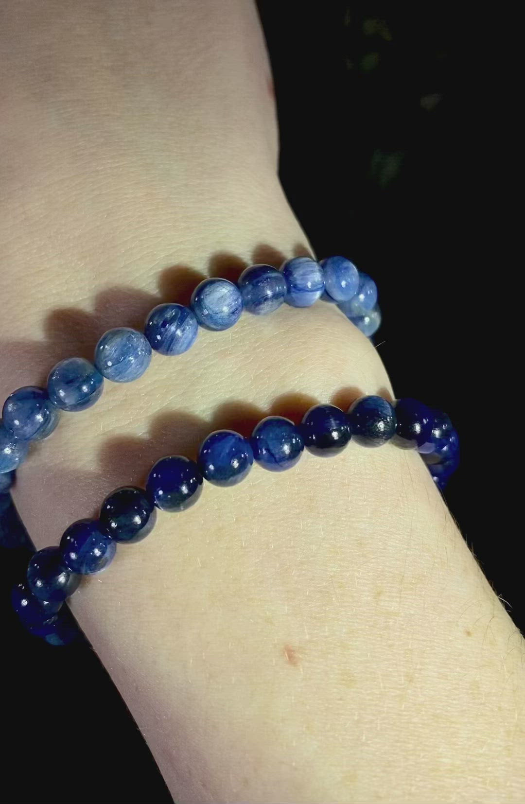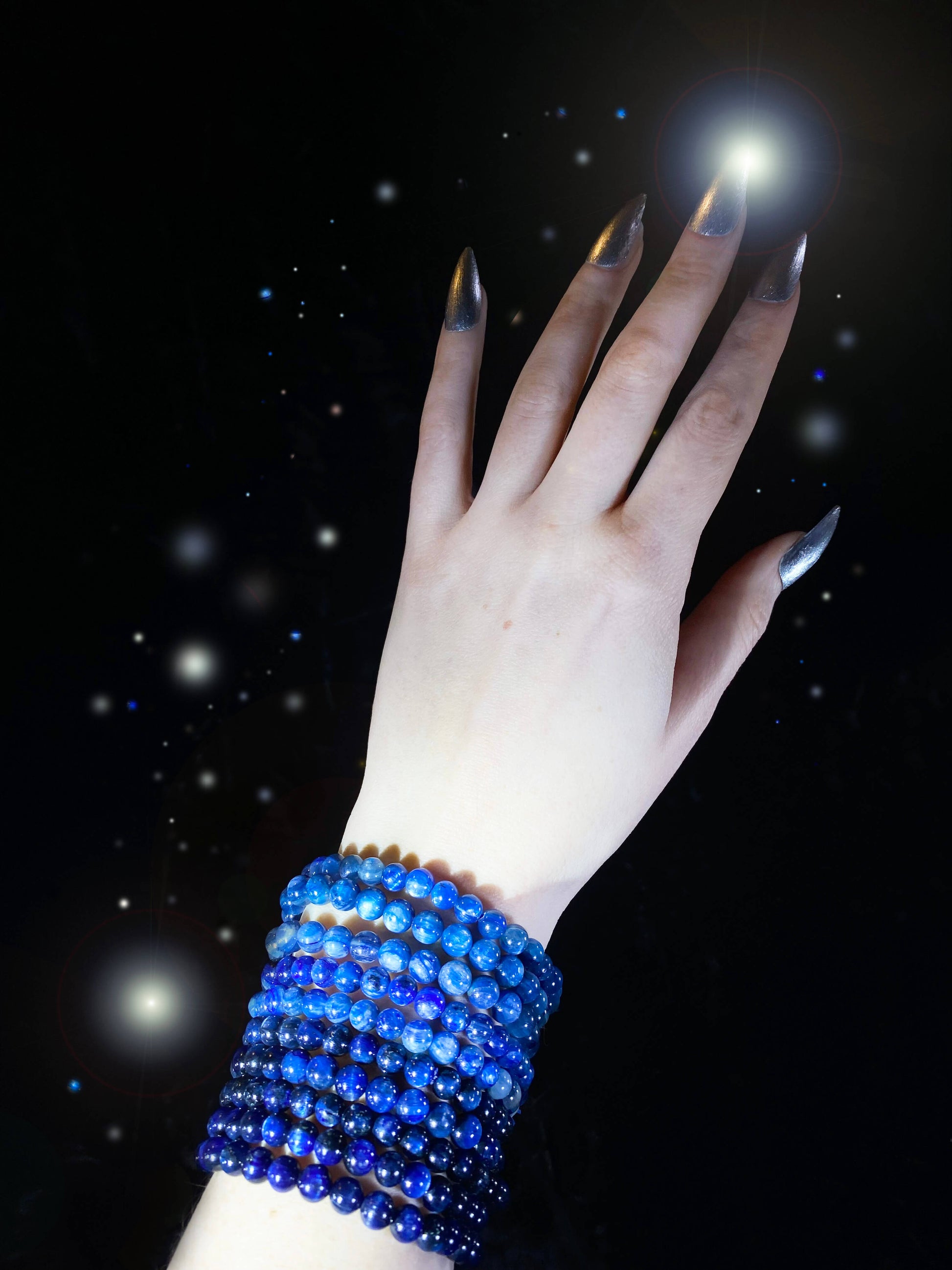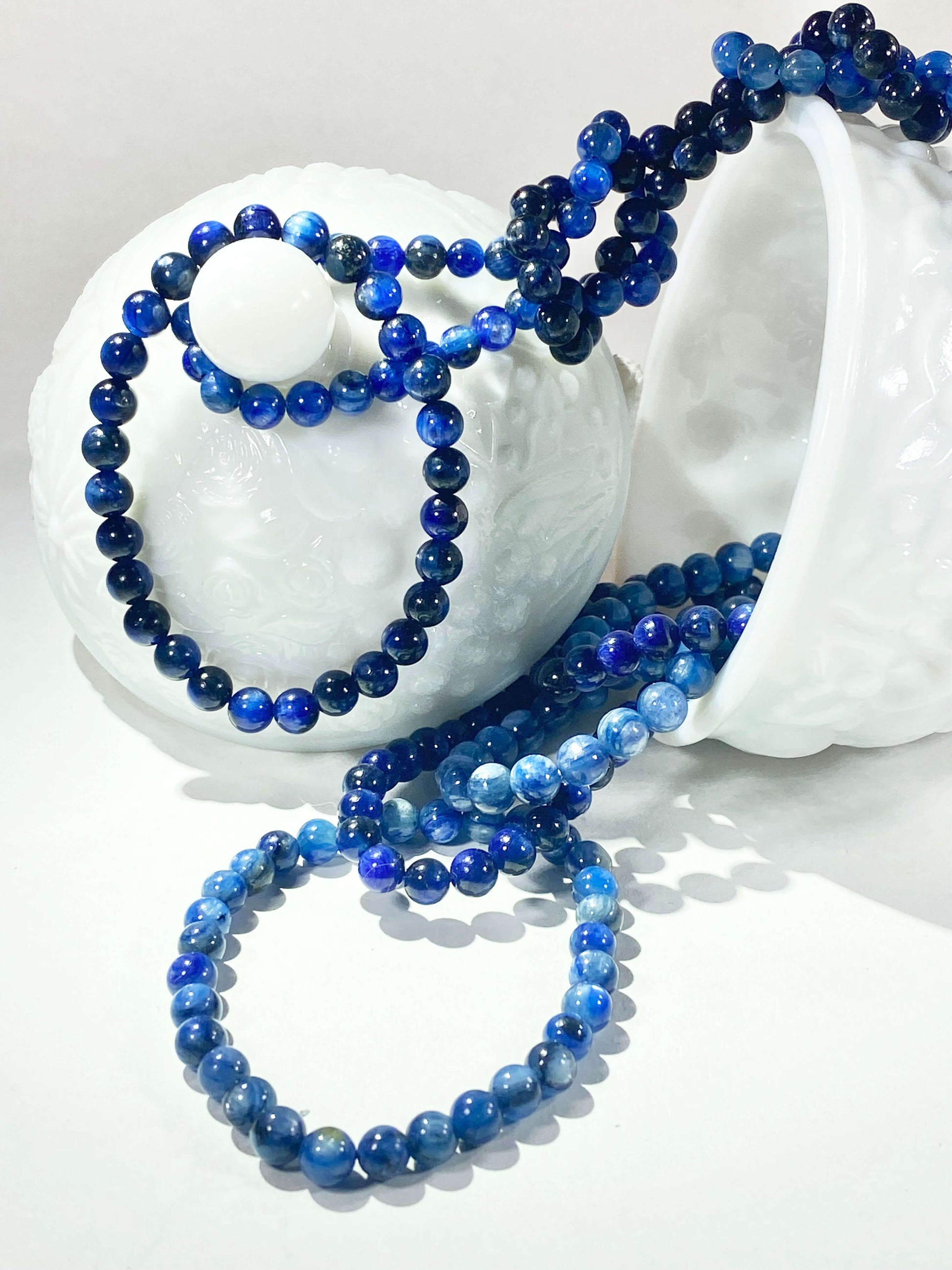 Dreamy, rich and awe-inspiring beads of Blue Kyanite link together like a night sky that's just oh-so-right. Reflected beams of light dance on the surface of the pearly brilliance of these high-quality crystals. Whether you are more drawn towards the lighter blue, "Afternoon Sky" or the darker blue "Midnight Sky" they both imbue a sense of serenity and peace. Both colors are 100% natural!