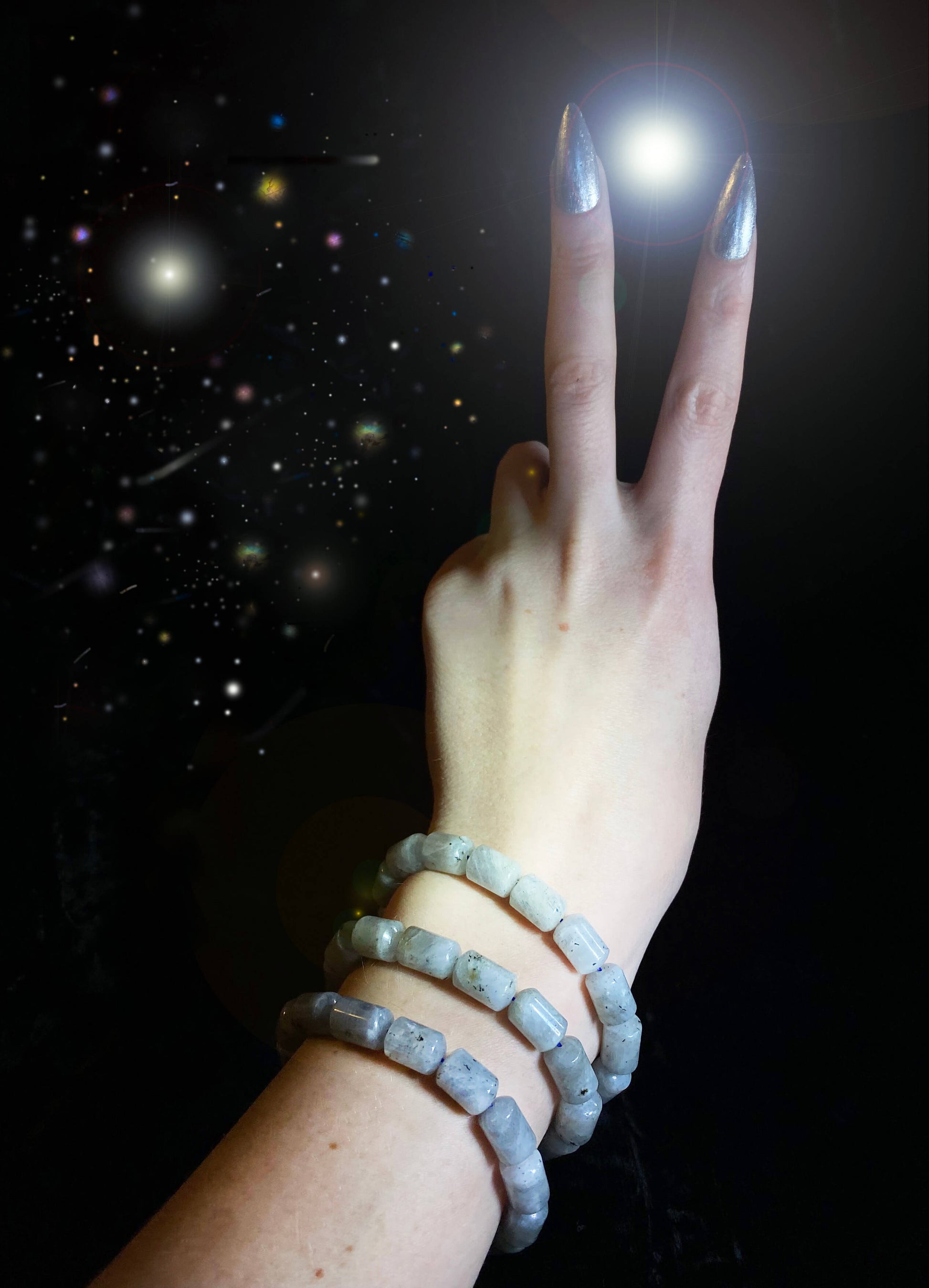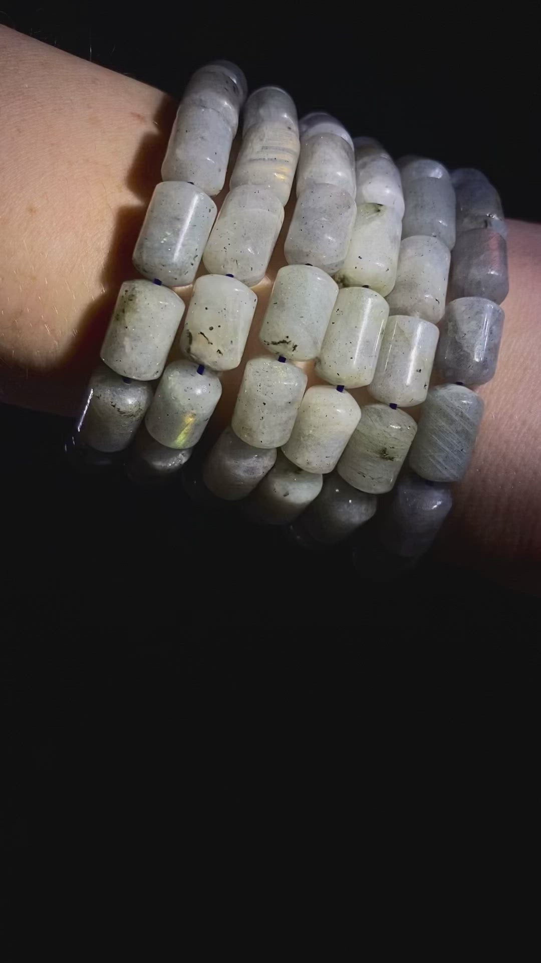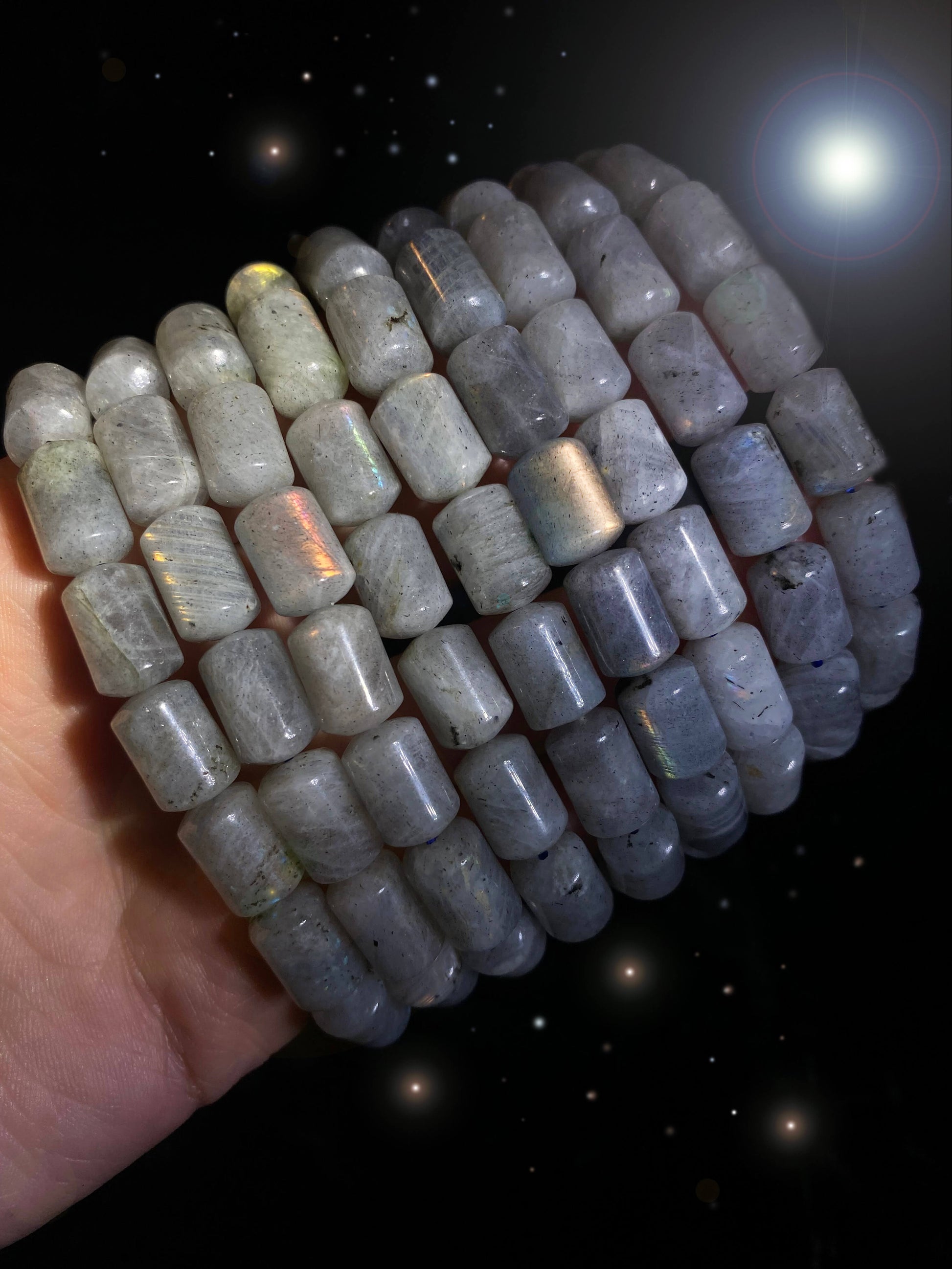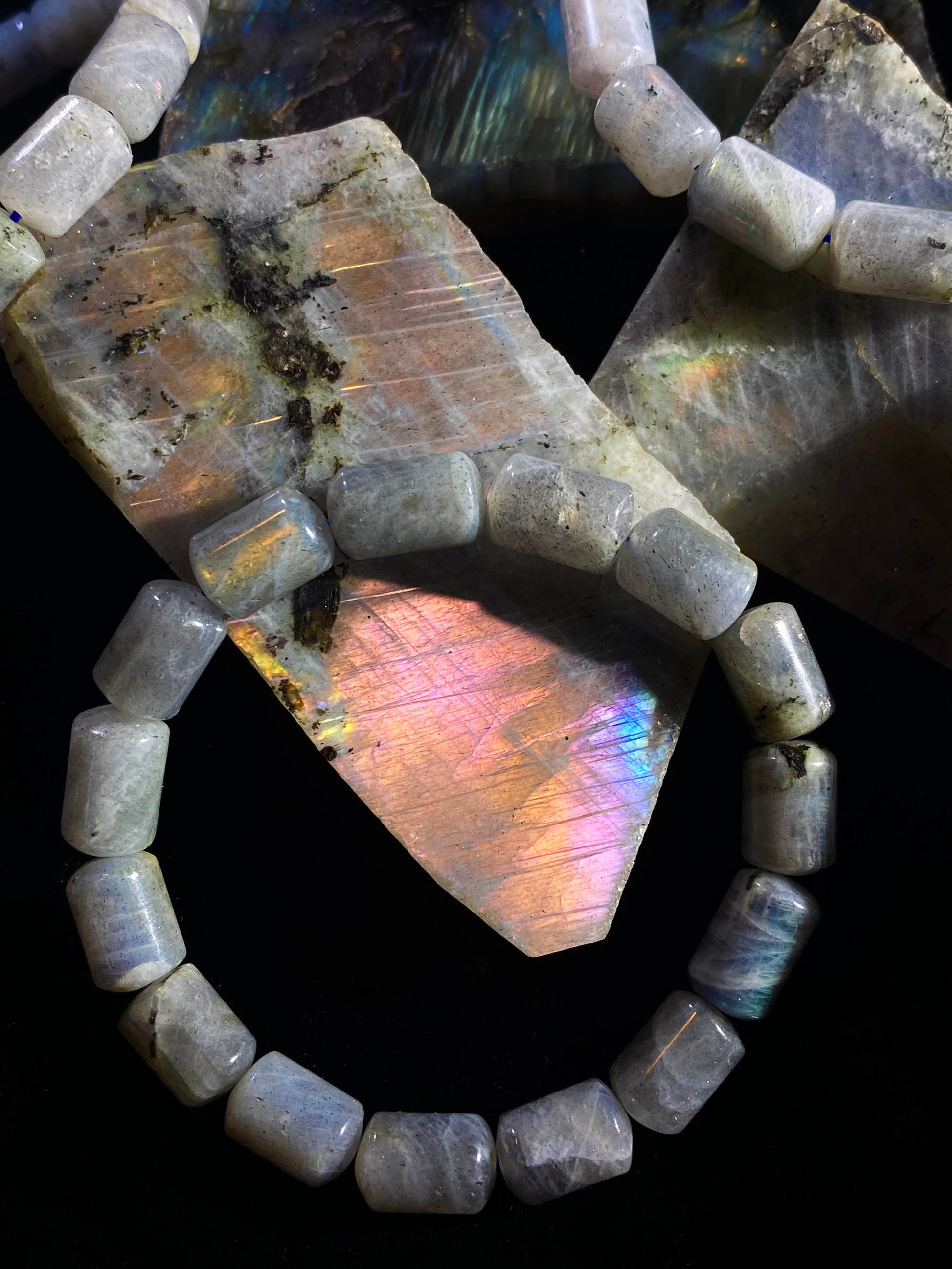 When it comes to the arm party, bracelets with different shapes and styles are oh so welcome! And when your vibe is colorful flashes of labradorescence, all eyes are on you. These unconventional “pill” shaped beads are the magical remedy to upgrade the vibrance of your aura. The rainbow flickers of light dazzle from different directions when you move your wrist, granting wishes like a magic wand.