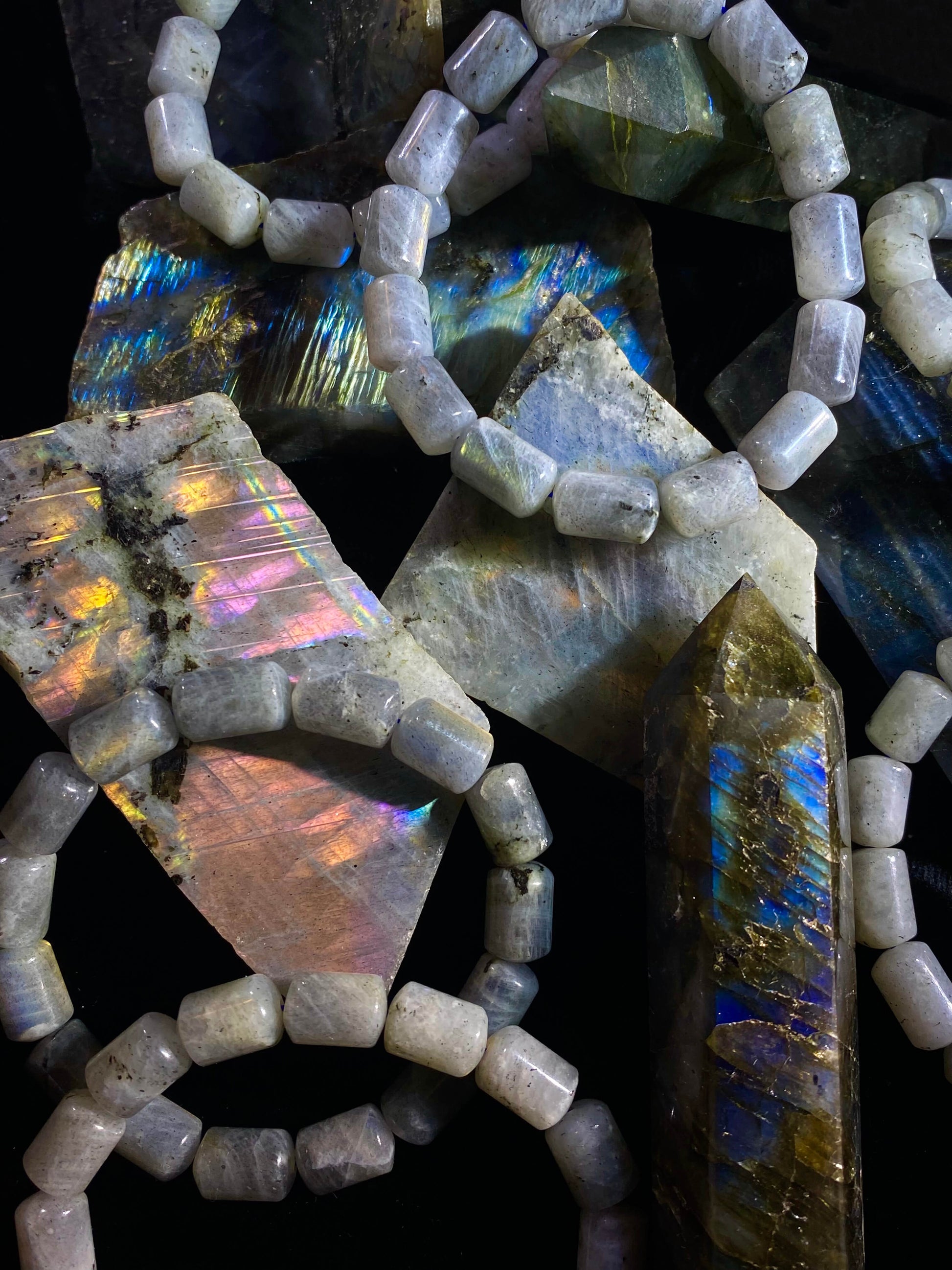 Labradorite is a stone of pure magic, awakening those to the awareness of one’s innate magical powers. The magic it refers to are the gifts we are all born with and have access to tap into. This powerful wind element stone is one of transformation, divination and awakening. It holds a rainbow of hues that connects to all our chakras and specifically activates the inner eye.