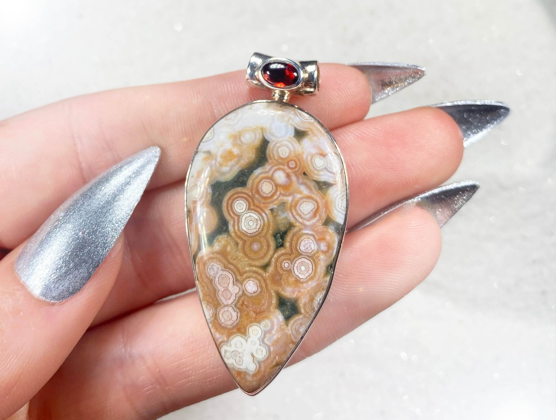 Ocean Jasper is a favorite variety among jasper lovers. Radiating the energy of water and the ocean, the energy of Ocean Jasper is a wonderful heart-opening stone that invites you to call love, joy, and happiness into your life. This amazing pendant features a garnet embellishment on its bail adding a extra vibration of passion.