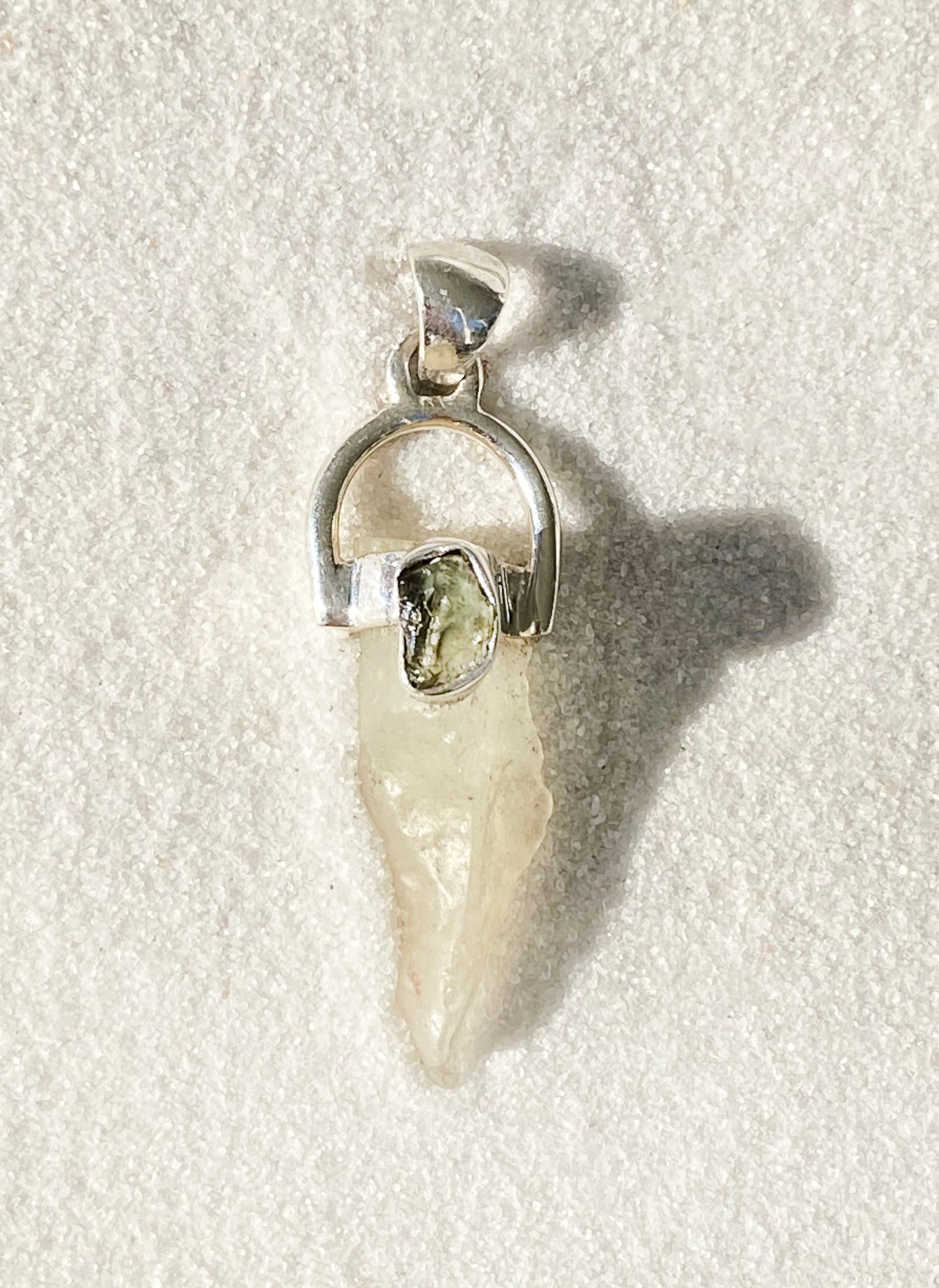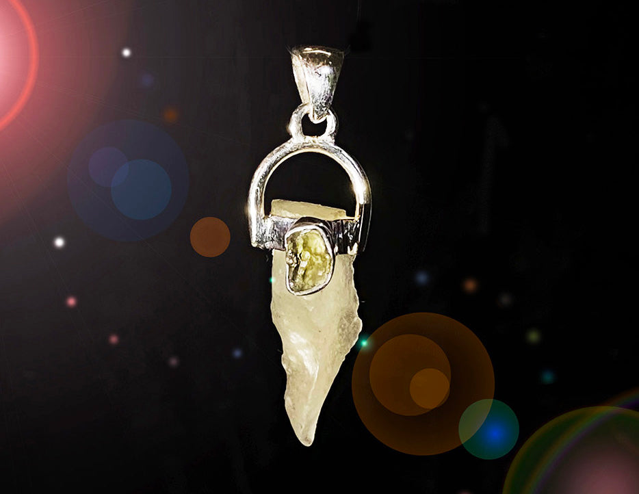 If you want to accelerate your spiritual growth, this tektite combination is the one for you. This pendant features a piece of genuine rough Moldavite accenting a piece of natural and authentic Libyan Desert Glass. Together these two high vibrational energies are powerful transformers.