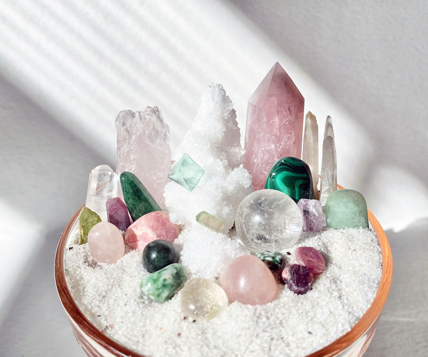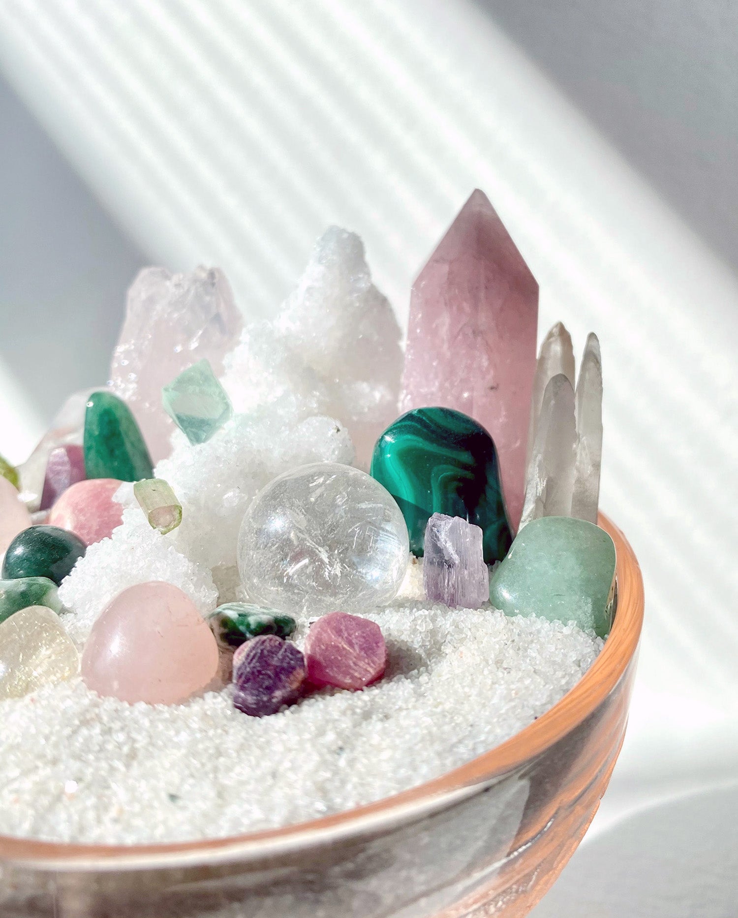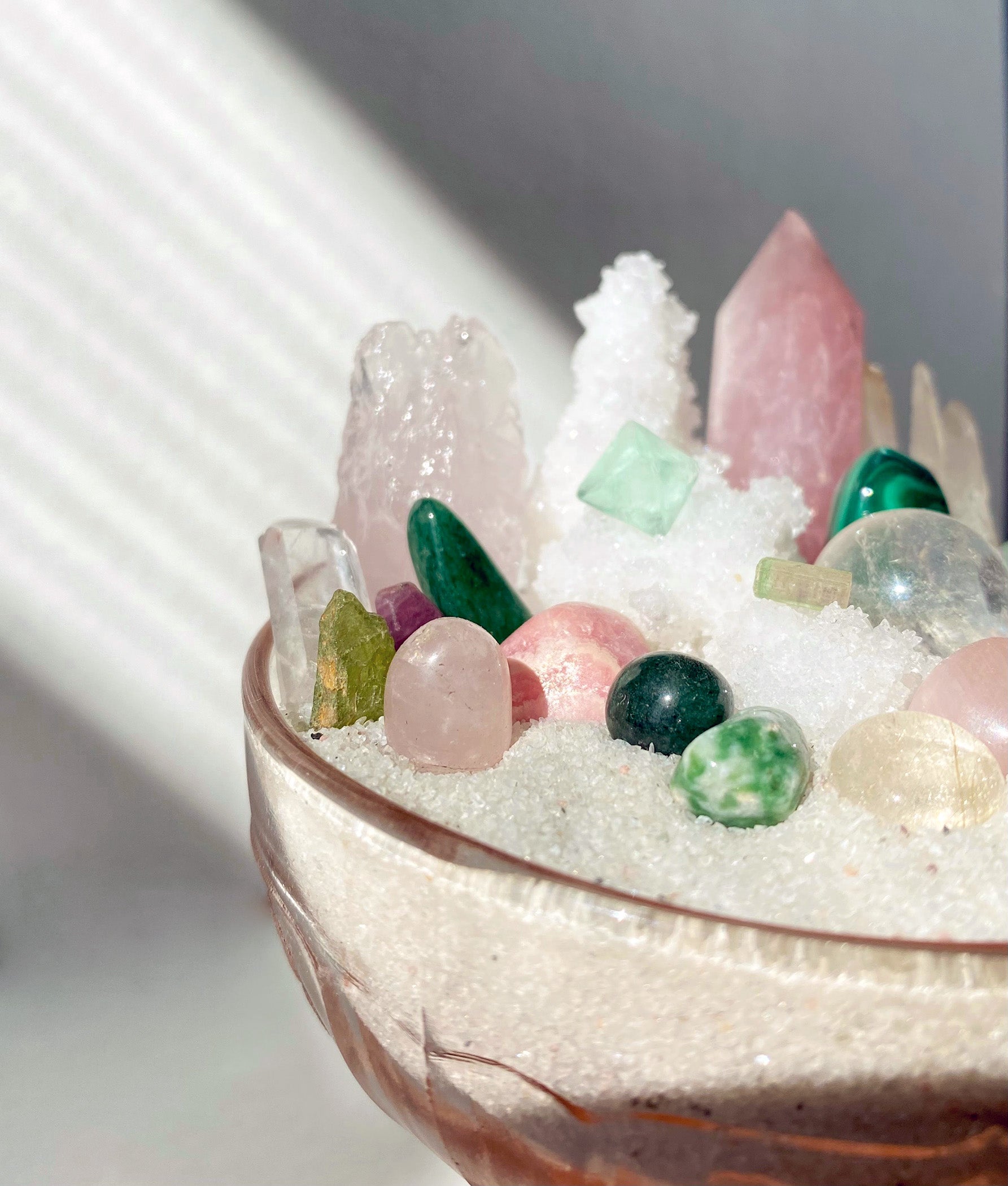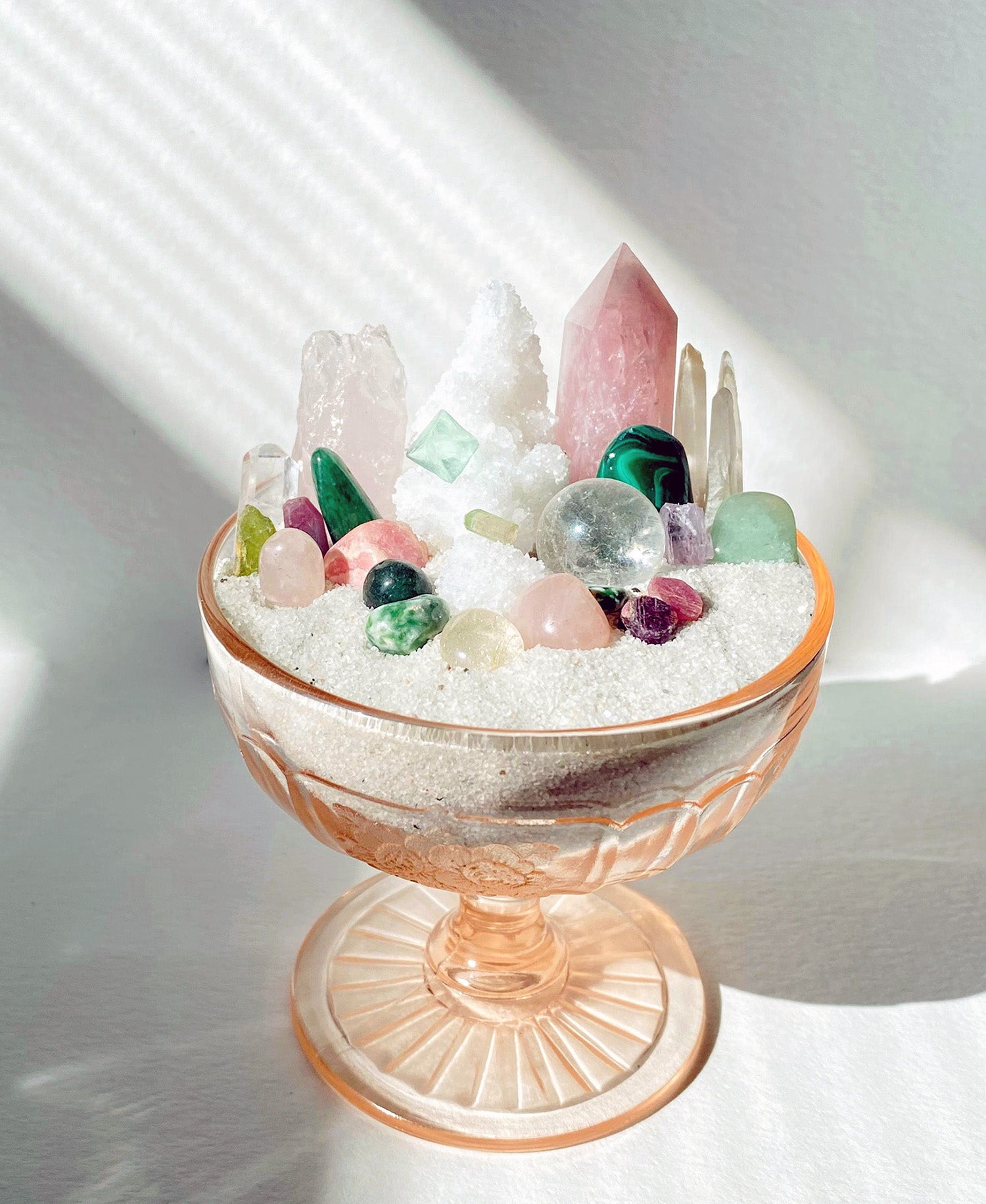 This "Lil' Anahata" bowl was created with crystals whose energies embody and assist the Heart Chakra's main significance.Gathered in a beautiful vintage pink desert dish with flower motifs, this sand garden is the perfect little reminder of the importance of centering our being and exemplifying all that is love within and around us.