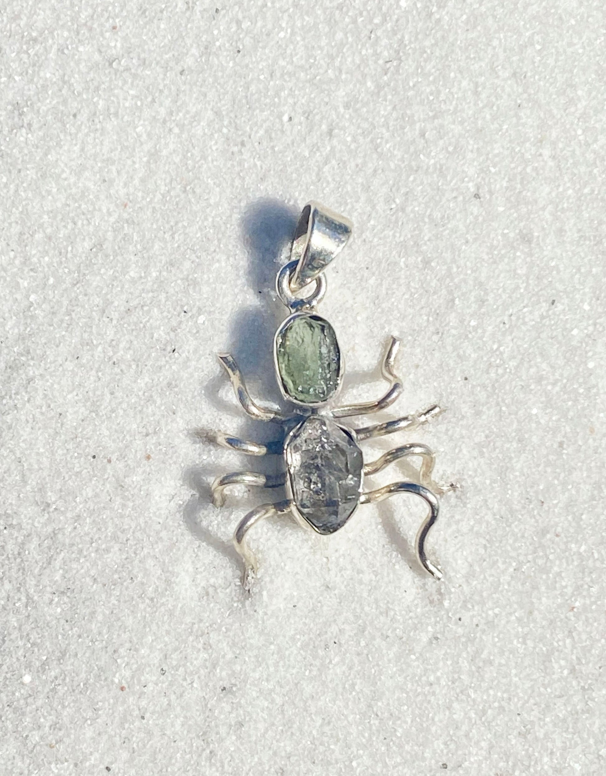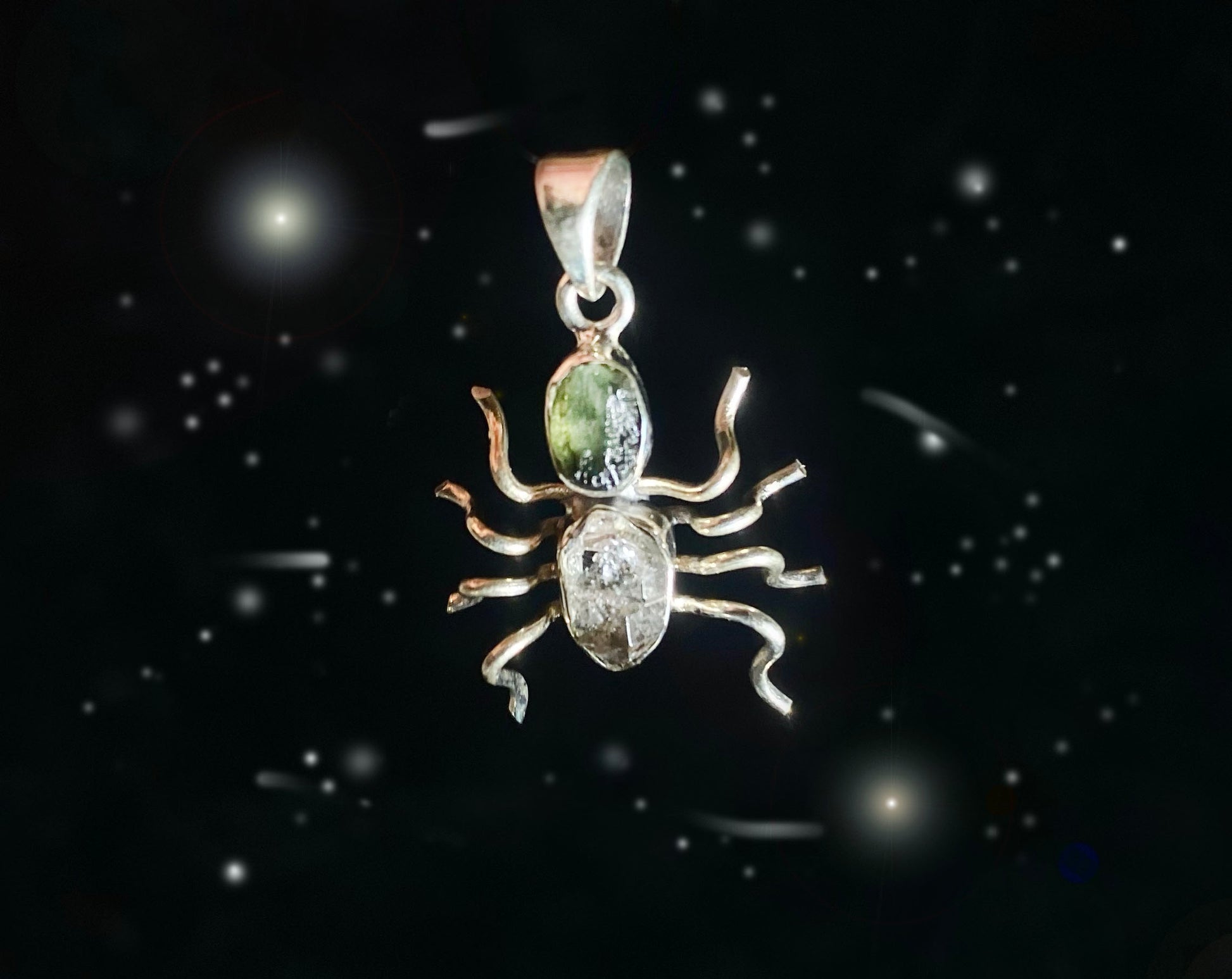 This pendant is epic for its powerful energetic combo of Moldavite and Herkimer Diamond and the animal totem meaning of a spider. A spider has many spiritual meanings but some of most popular include, transformation, personal power, harmony, oneness and creativity.