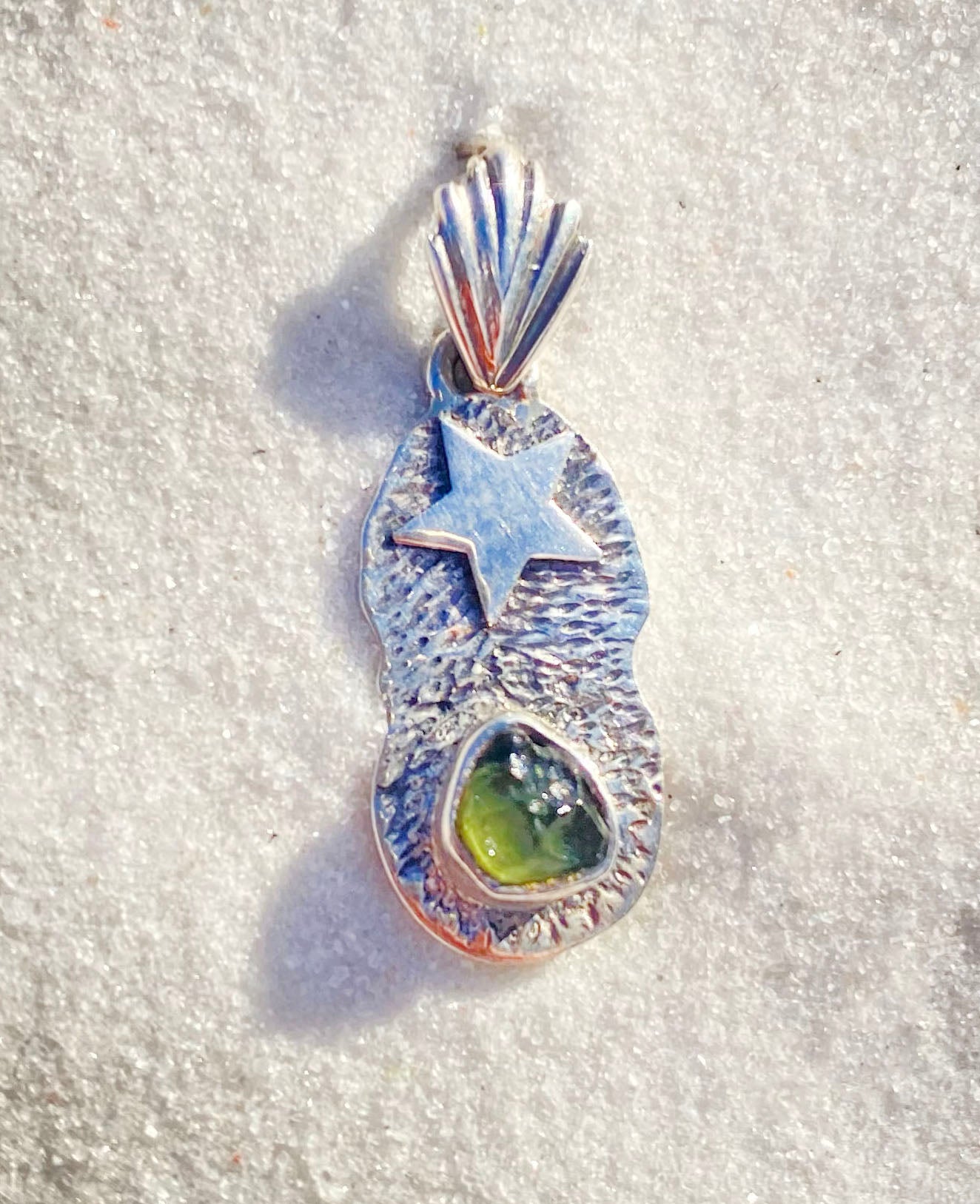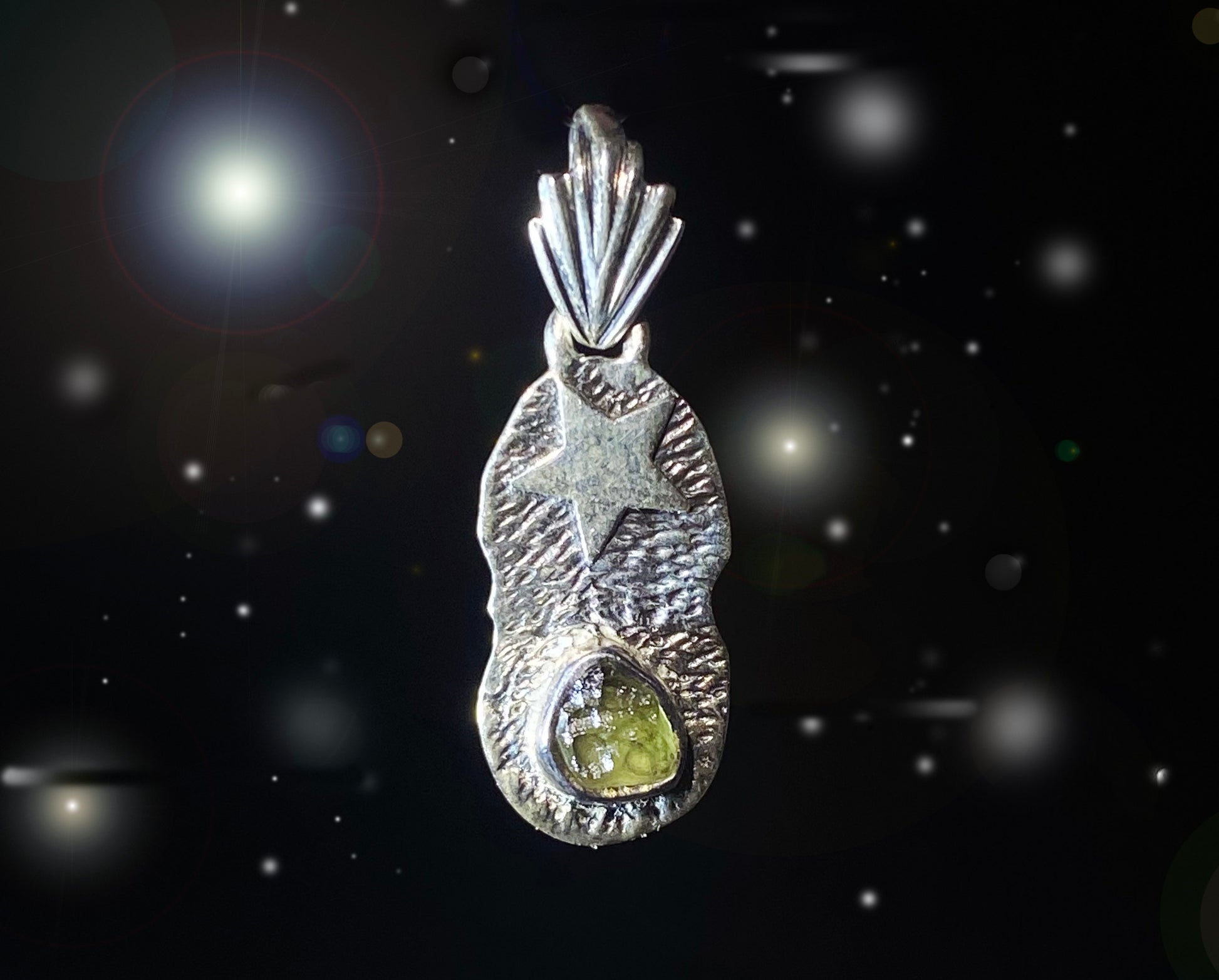 This adorable mini Moldavite pendant is stamped with a shining silver star, reminding you we are all stardust. We all are meant to shine and be our greatest versions of ourself. Moldavite, the result of a meteor impact, opens the heart and speaks to the soul star chakra within your being, creating a space for you to truly shine.