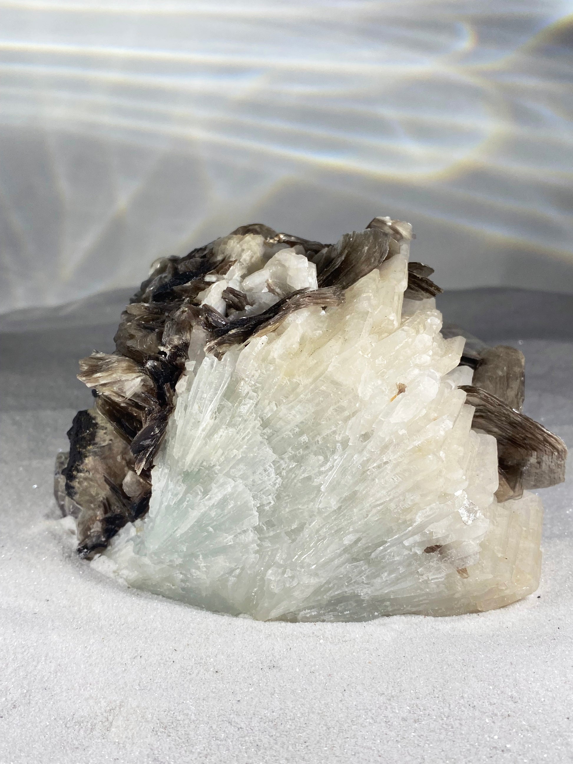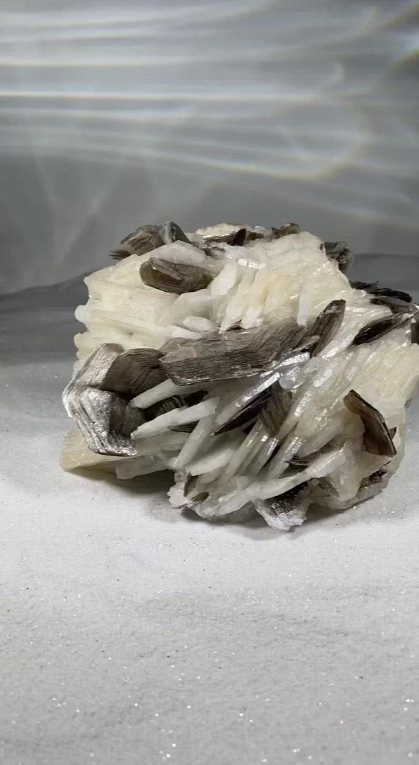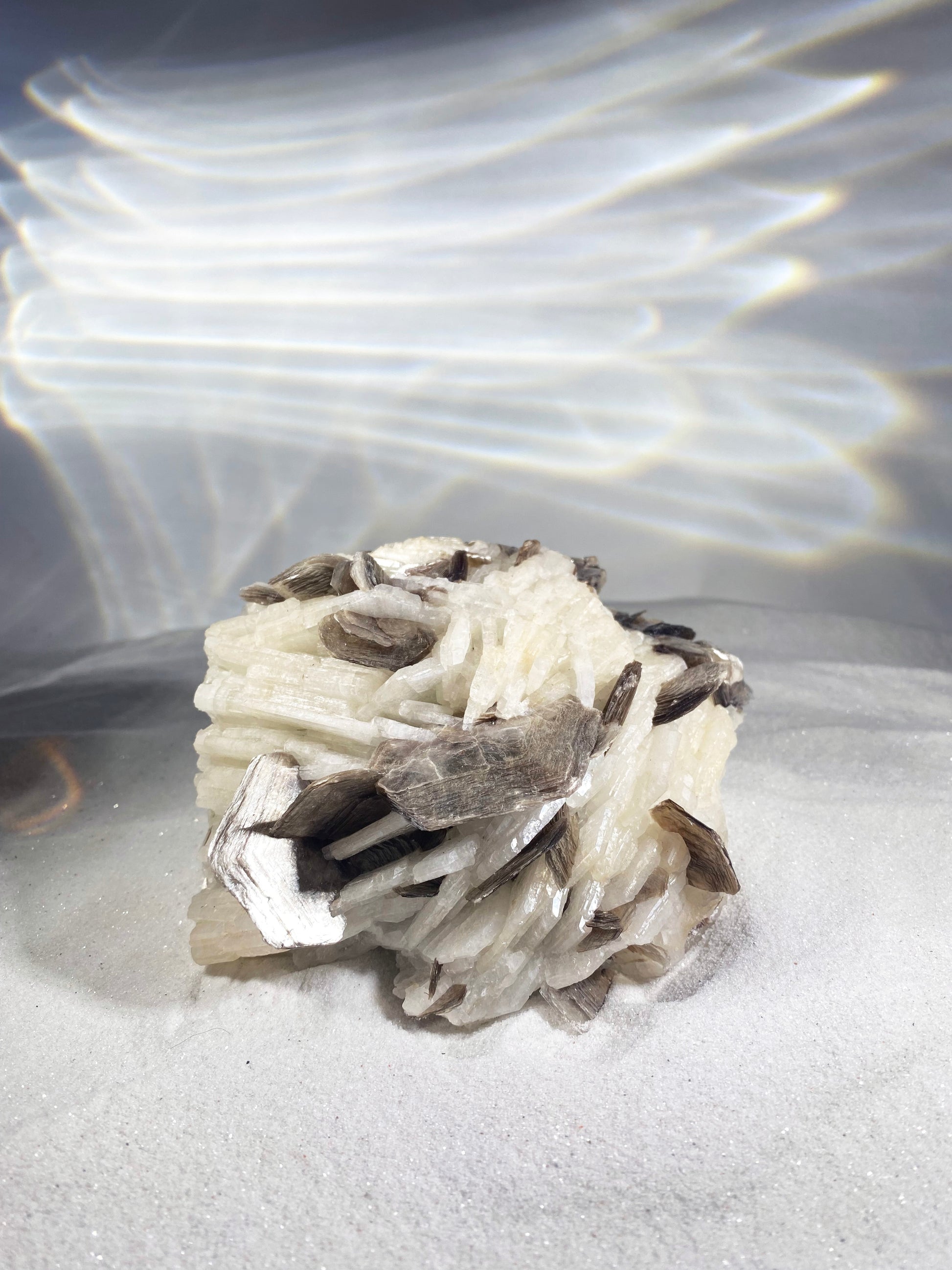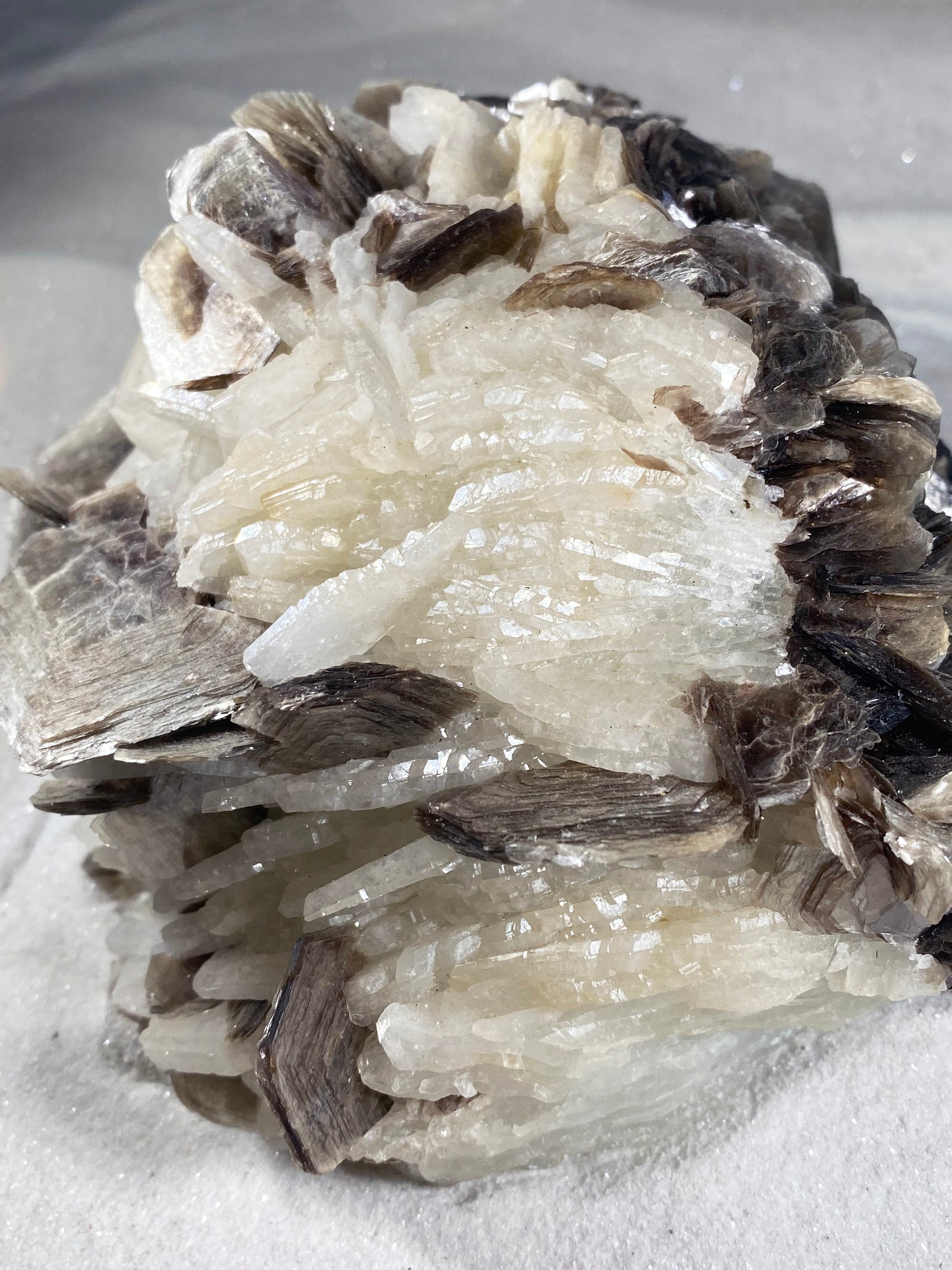 This specimen contains layers of the bronze brown form of mica called muscovite intertwined in folds of milky white and lustrous Albite. This mineral creates a very visually interesting display piece and a conversation starter. In my years of working with crystals I have found many people to be pulled into this crystal even though many have come across mica in their own back yards and find it to be no big deal. When high quality Muscovite and Albite are presented together in a crystal such as this one, they allude a regal energy making the ordinary magnificent. They glisten and awe those who view it with inspiration and wonder.