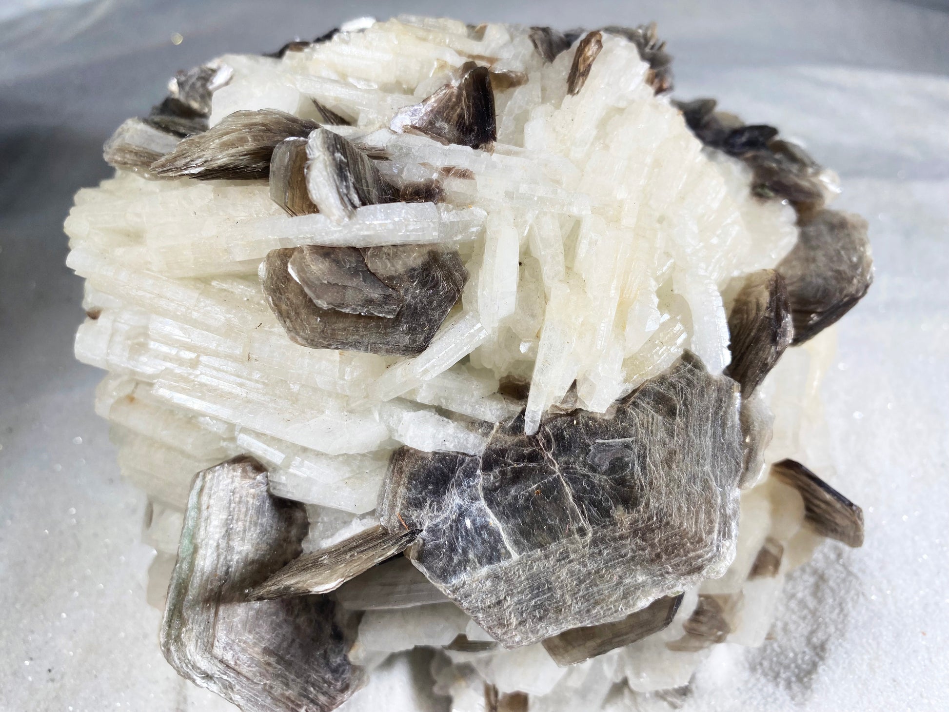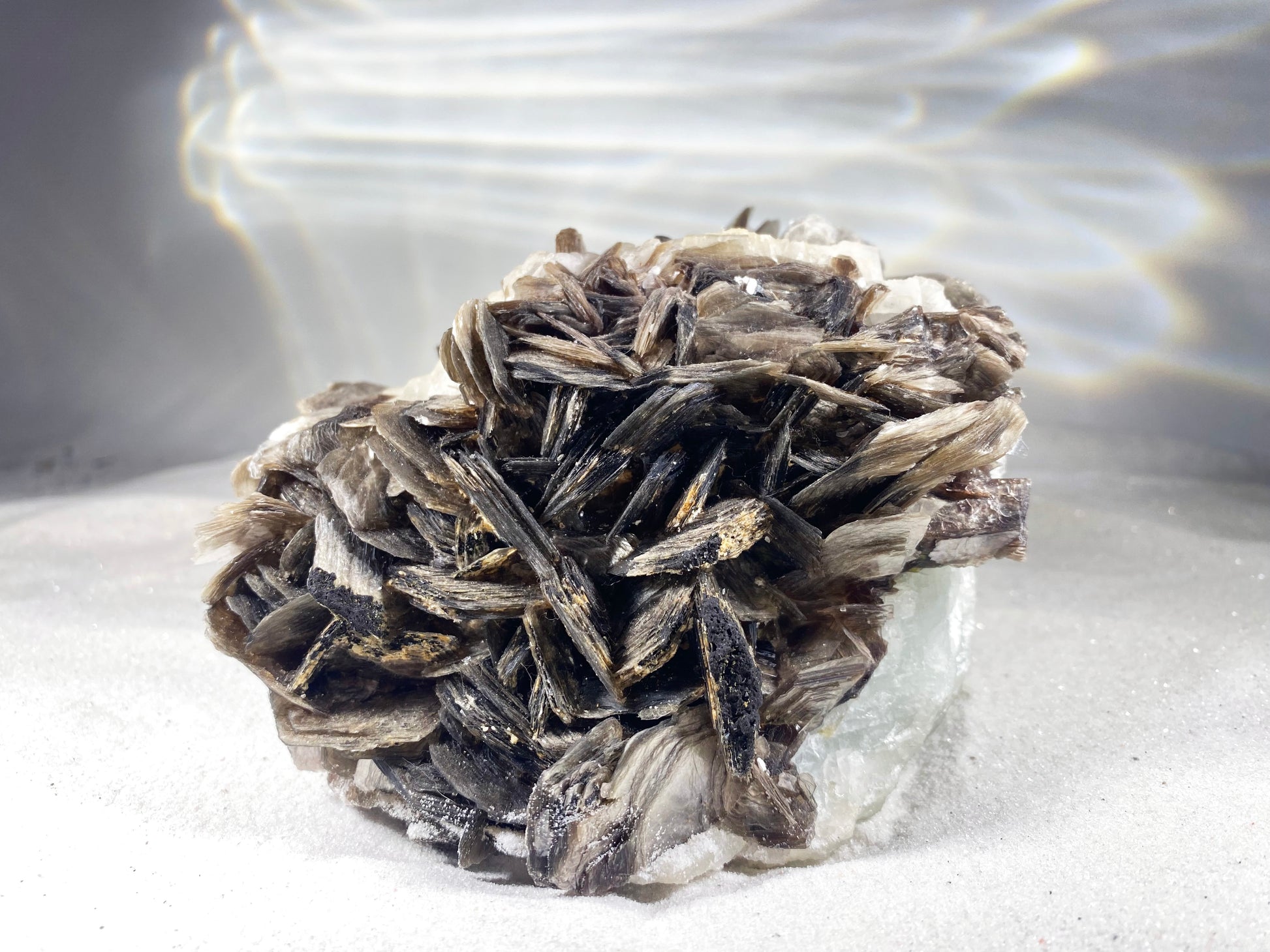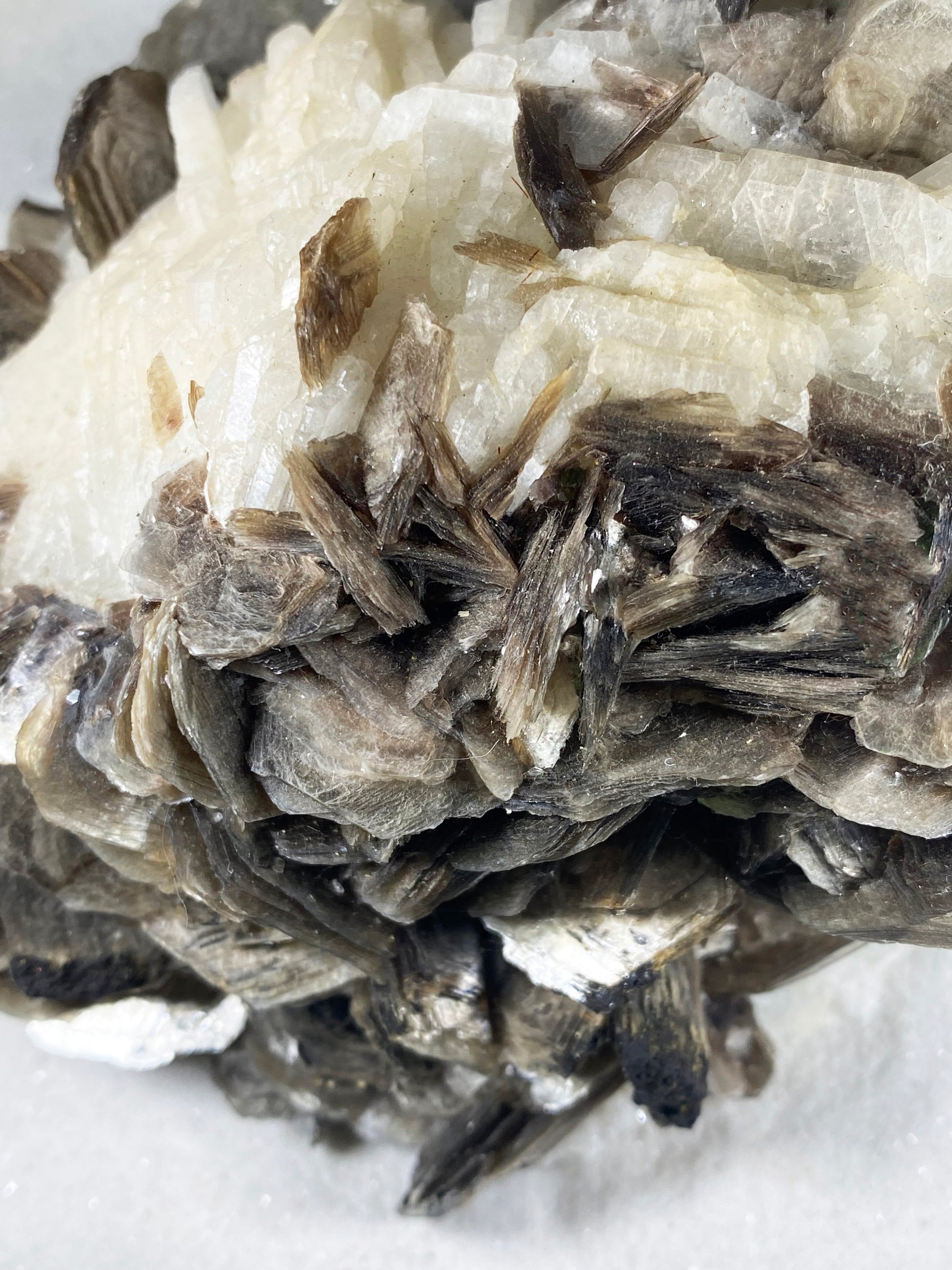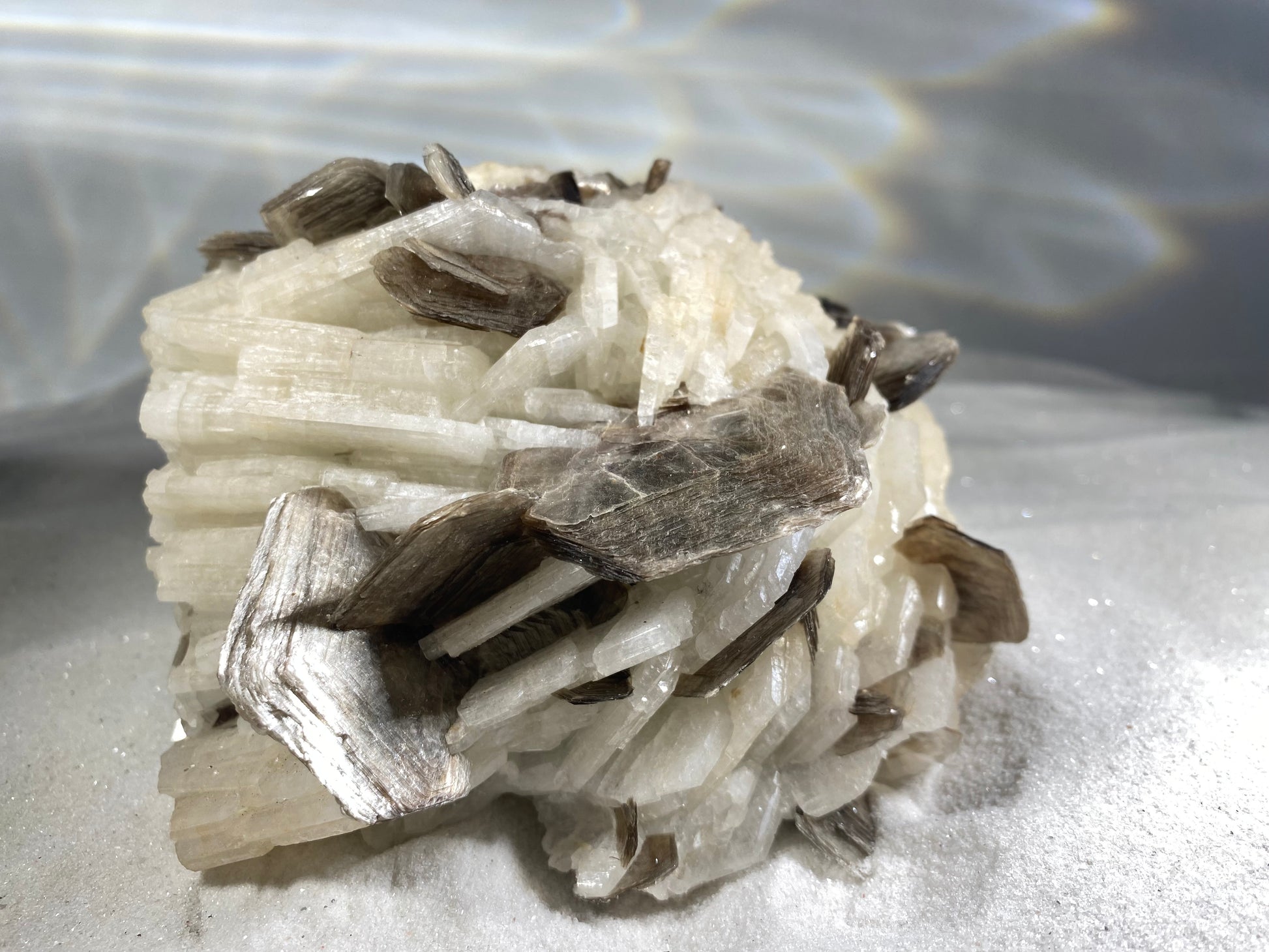This specimen contains layers of the bronze brown form of mica called muscovite intertwined in folds of milky white and lustrous Albite. This mineral creates a very visually interesting display piece and a conversation starter. In my years of working with crystals I have found many people to be pulled into this crystal even though many have come across mica in their own back yards and find it to be no big deal. When high quality Muscovite and Albite are presented together in a crystal such as this one, they allude a regal energy making the ordinary magnificent. They glisten and awe those who view it with inspiration and wonder.