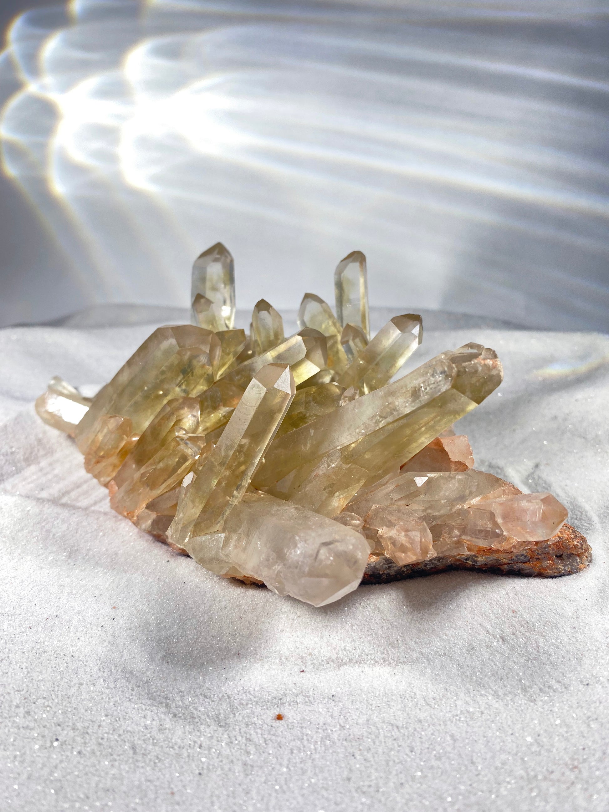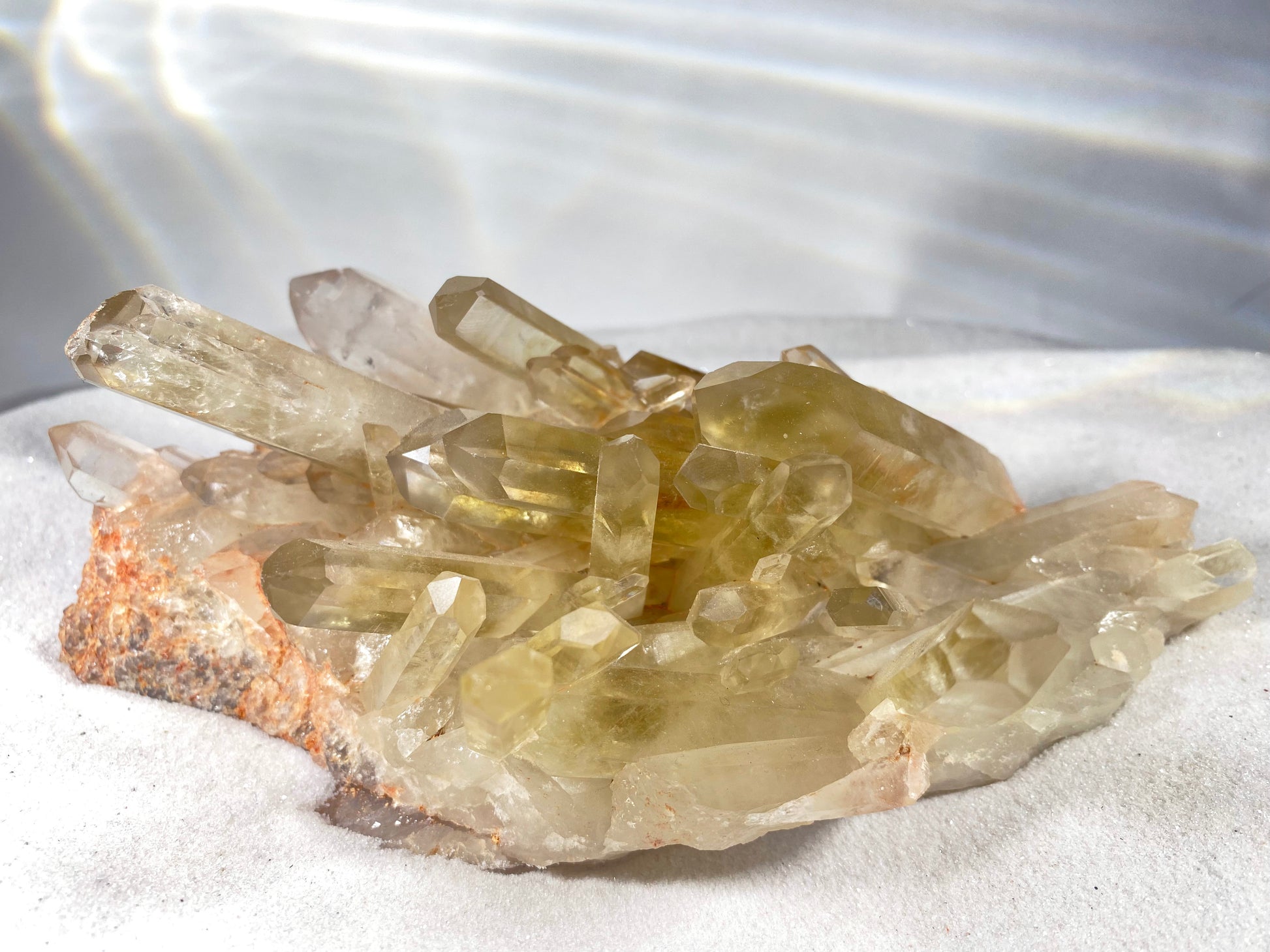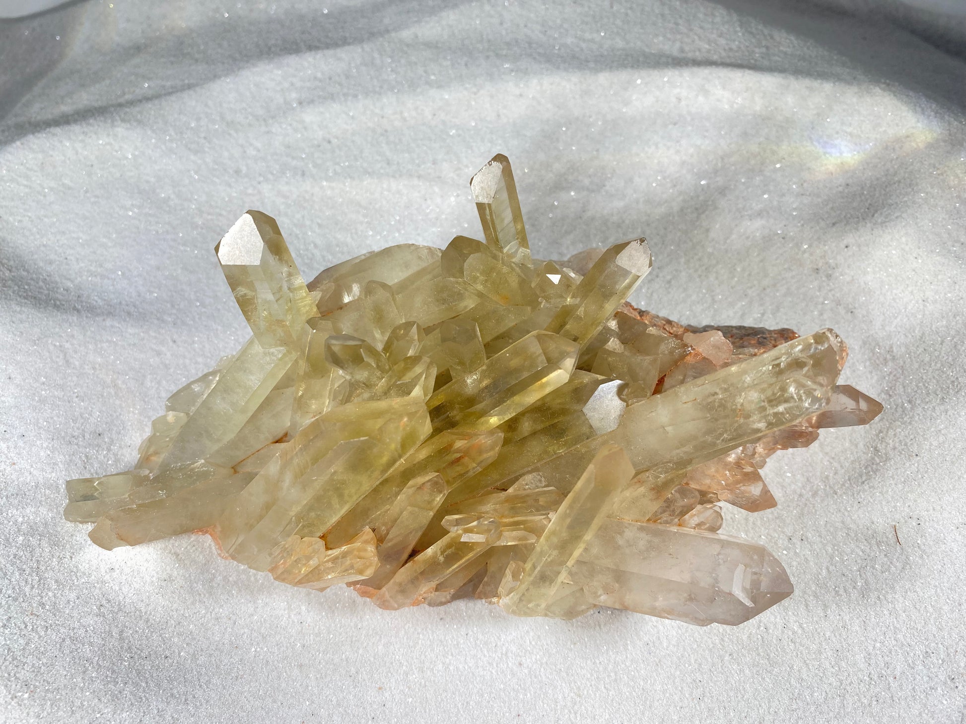 This beautiful natural Citrine cluster is of AAA quality. It creates a beautiful array of bright and warm yellow hued points with a bit of reddish iron coating. The points in this cluster have very little damage and spectacular clarity. This cluster consists of more than 26 laser like points going different directions creating a very visually pleasing display. This material is a product of new mining operation in Madagascar. This one-of-a-kind Citrine cluster is a perfect addition for spreading positive vibes in your space, lifting your spirits and manifesting your dreams.