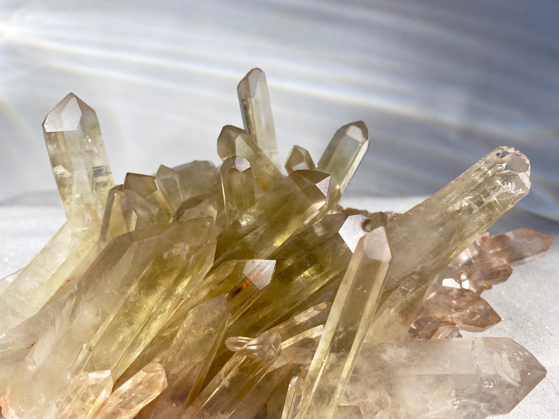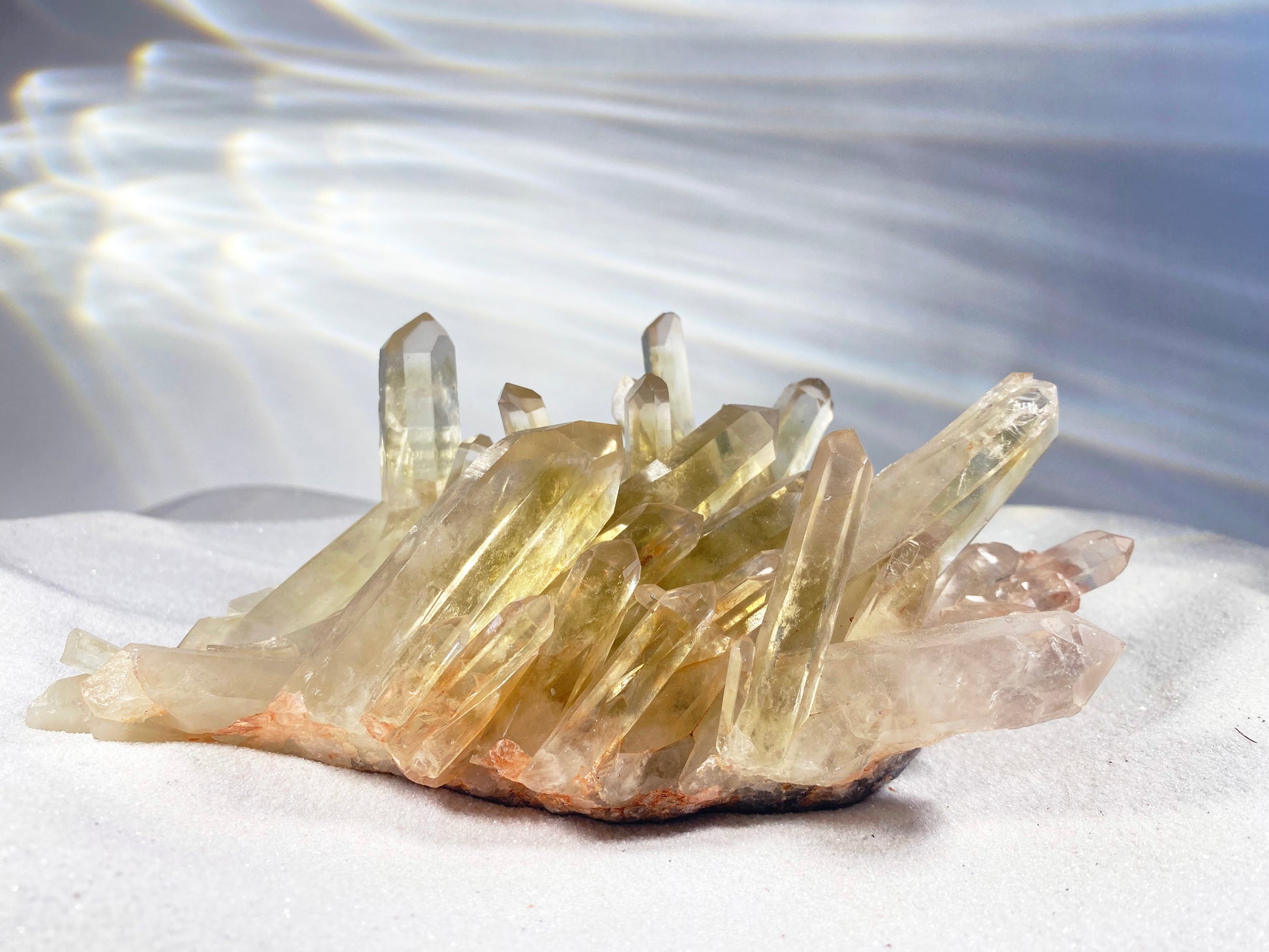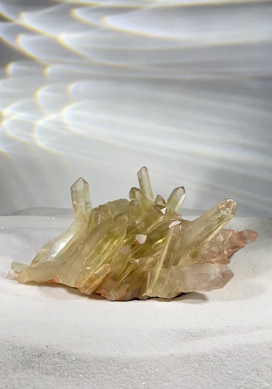 This beautiful natural Citrine cluster is of AAA quality. It creates a beautiful array of bright and warm yellow hued points with a bit of reddish iron coating. The points in this cluster have very little damage and spectacular clarity. This cluster consists of more than 26 laser like points going different directions creating a very visually pleasing display. This material is a product of new mining operation in Madagascar. This one-of-a-kind Citrine cluster is a perfect addition for spreading positive vibes in your space, lifting your spirits and manifesting your dreams.