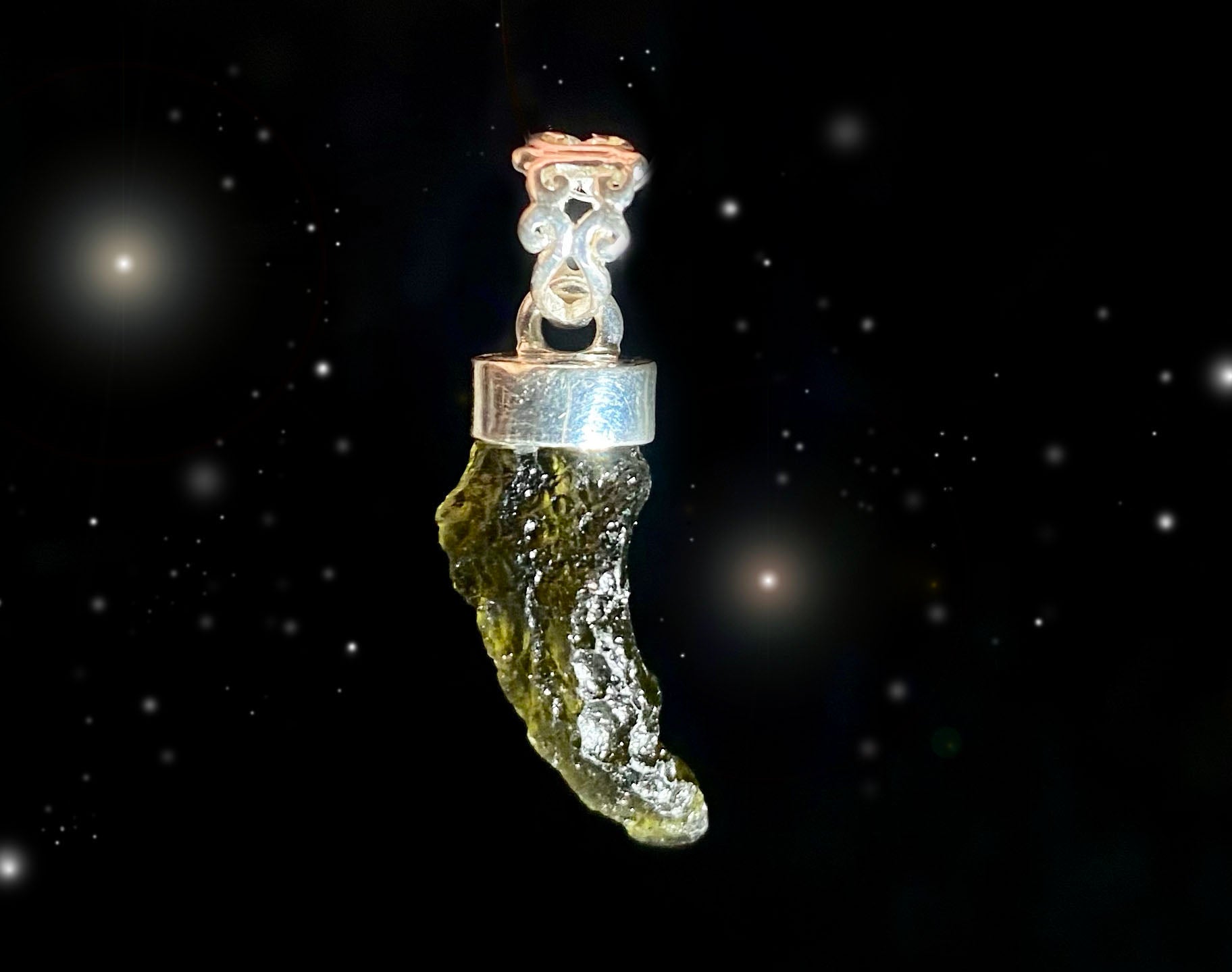 One-of-a-kind. Sterling Silver. Moldavite sourced from the Czech Republic.