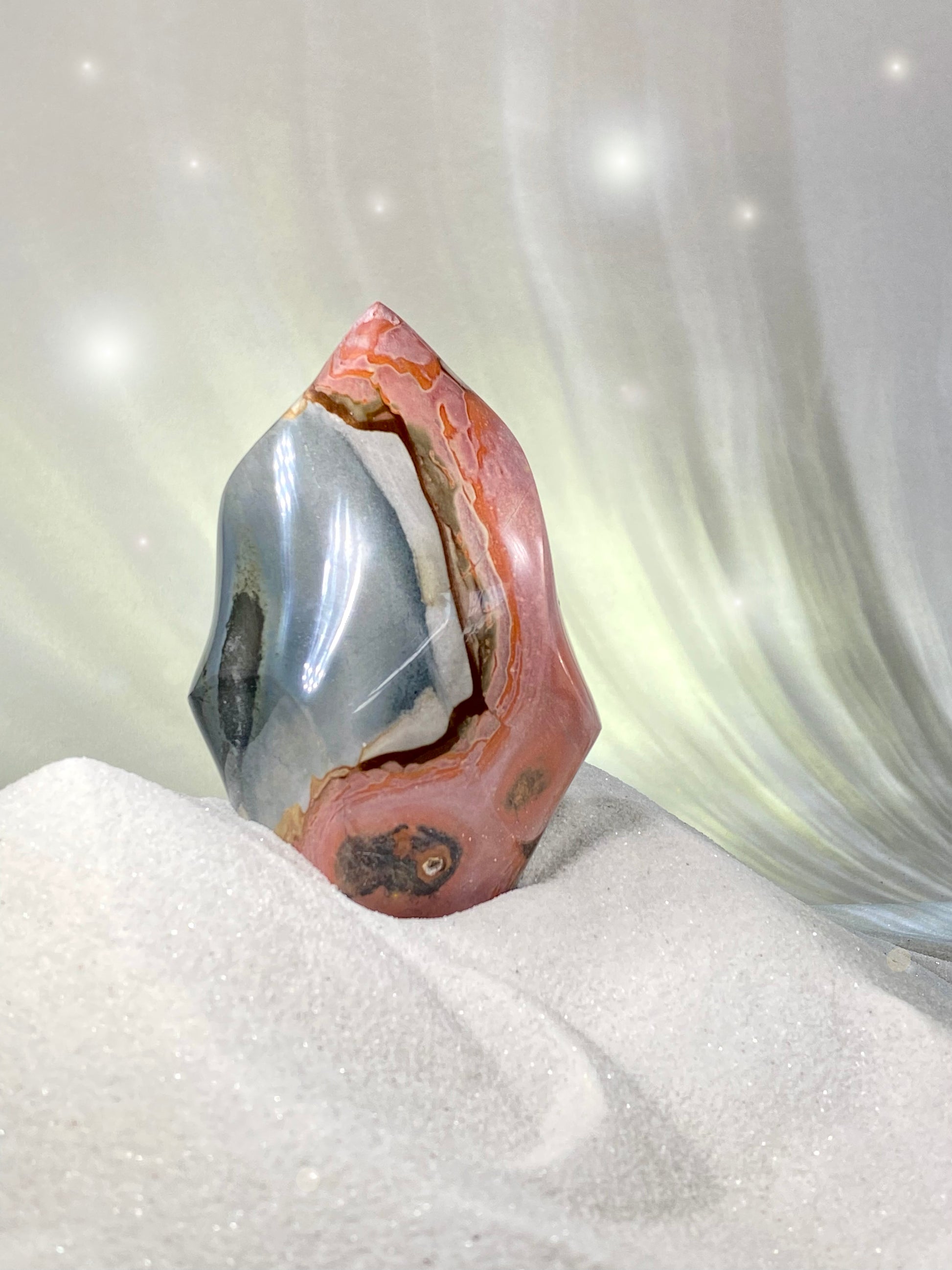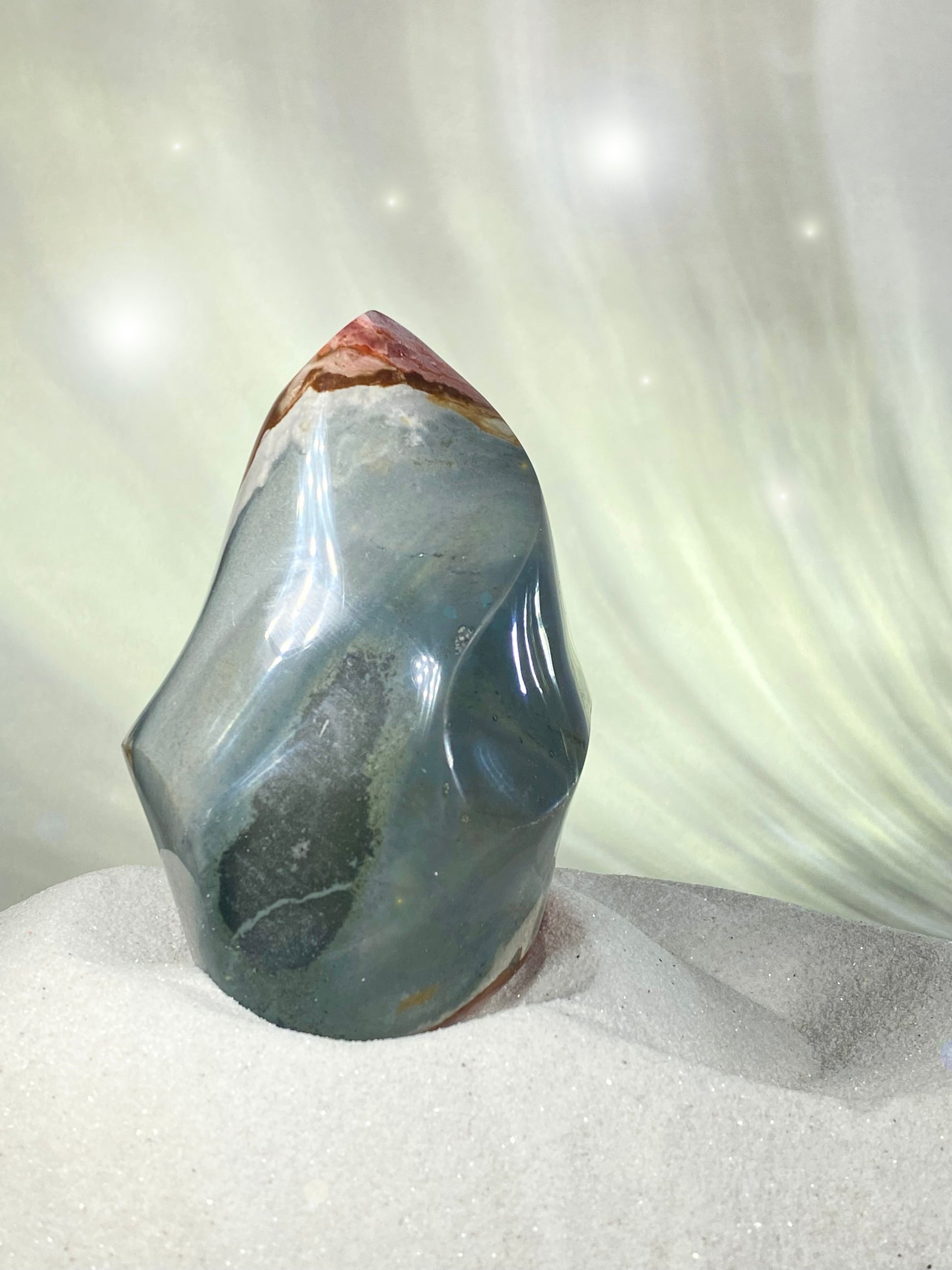 This Polychrome Jasper flame ignites a deep passion within fueling creativity and inspiring positive change towards ones greatest version of self. This beautifully hand carved flame is symbolic of hope and eternity. Its intriguing morph of contrasting colors is a bright and alluring addition to ones sacred space.