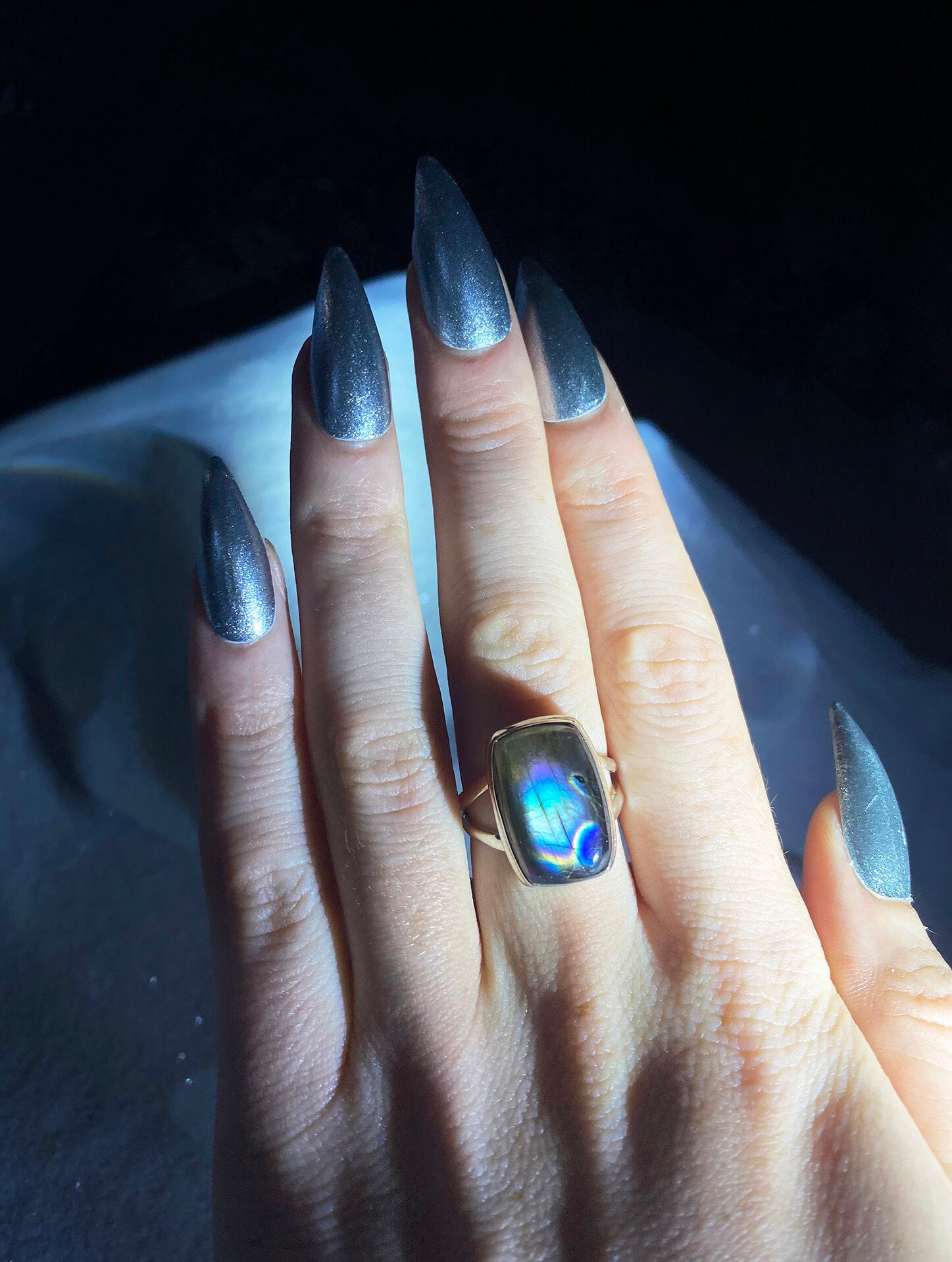 Oh the special moment to find a Labradorite ring that reflects the entire rainbow of colors. You put this ring on and I promise you, you'll find that pot of gold. Or you'll get a lot of compliments...because dang is she pretty. Both sound good to me.