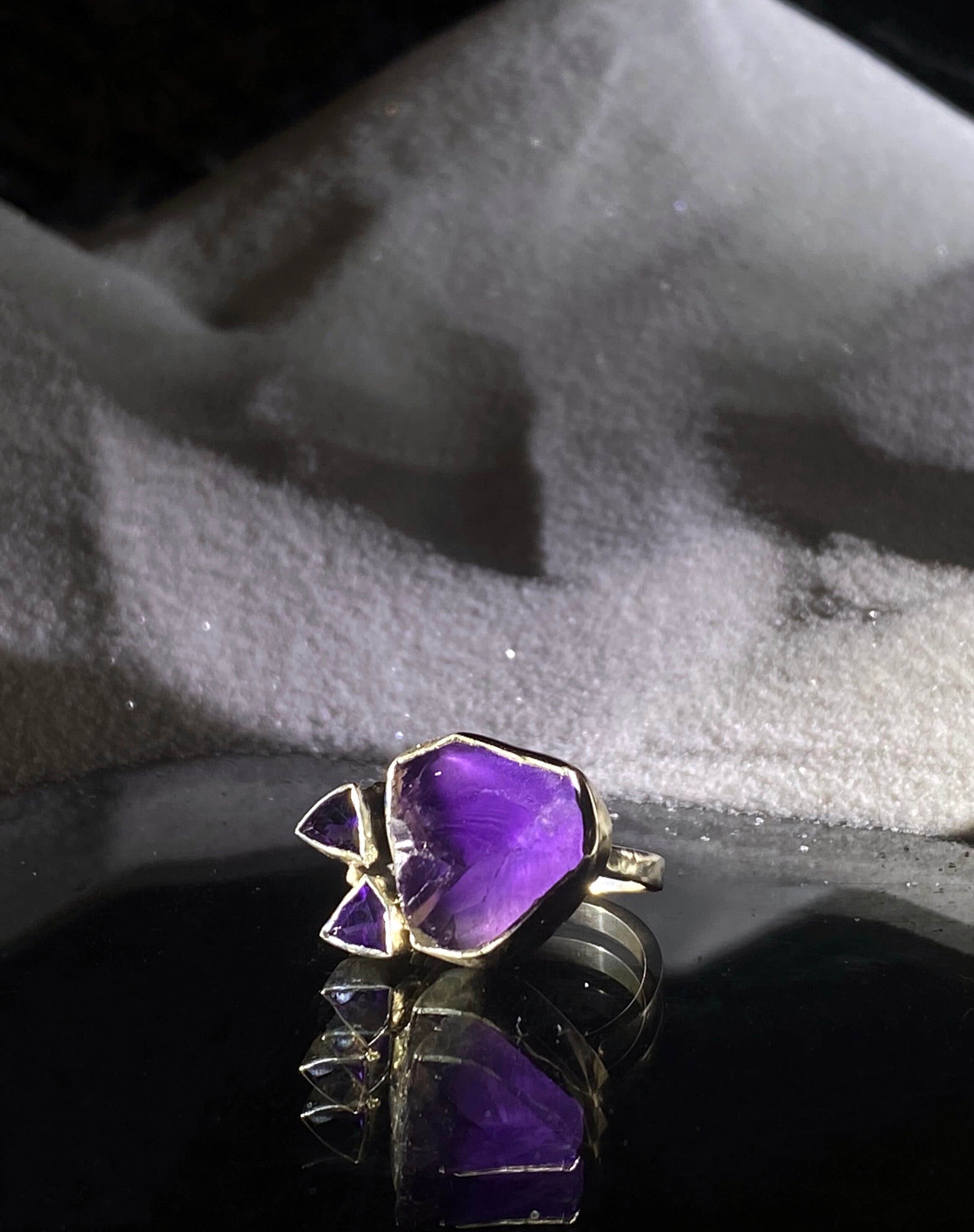 Ever seen purple Jell-O? Well, this rough chunk of amethyst literally looks like its jiggling around from this impeccable gemmy quality. The two faceted, triangular amethysts coming out the side there, well turn that baby around and you got two cat ears. Yeah, I'm all over the place with this ring, but I think that just proves how fun this one is!