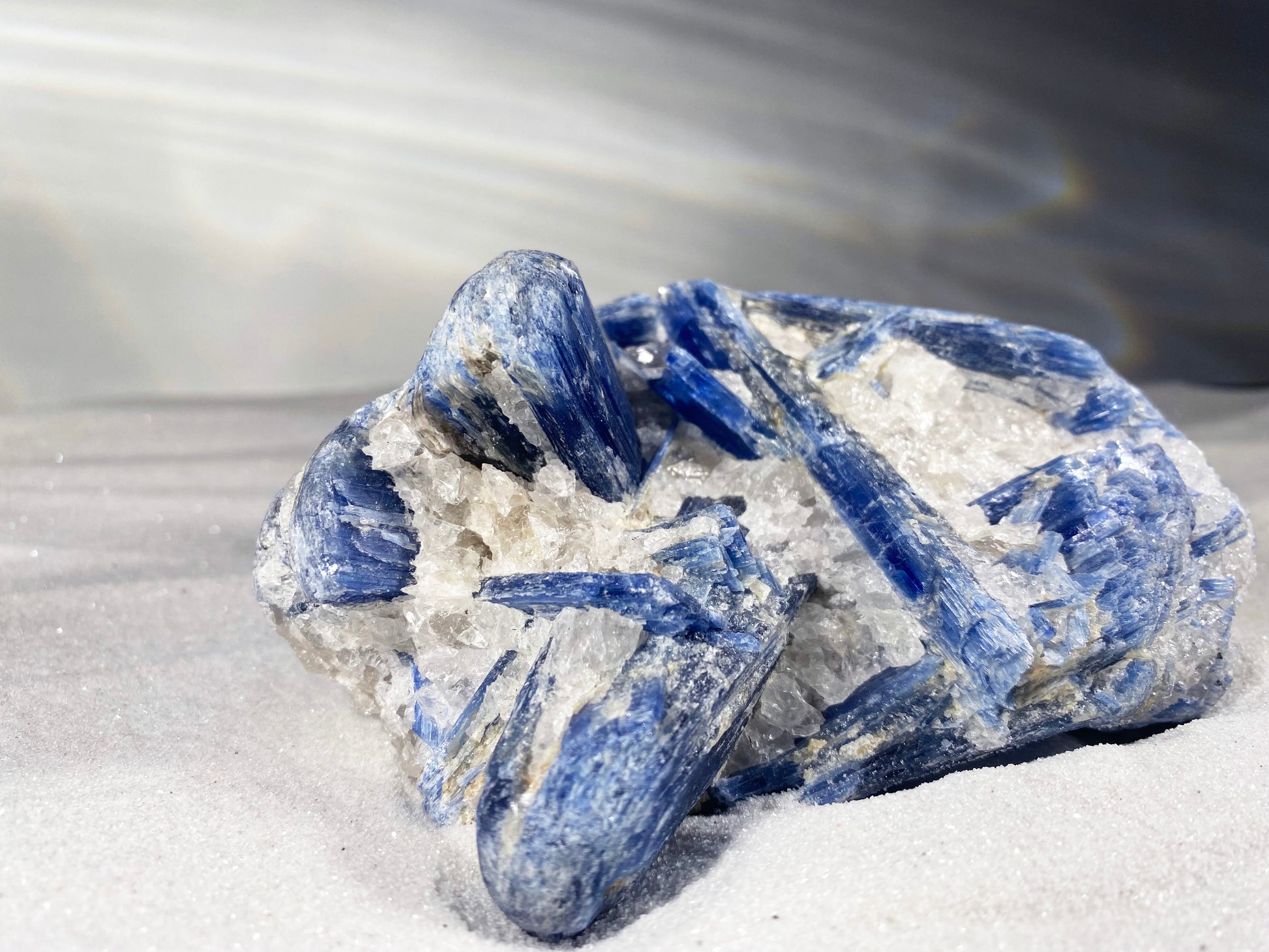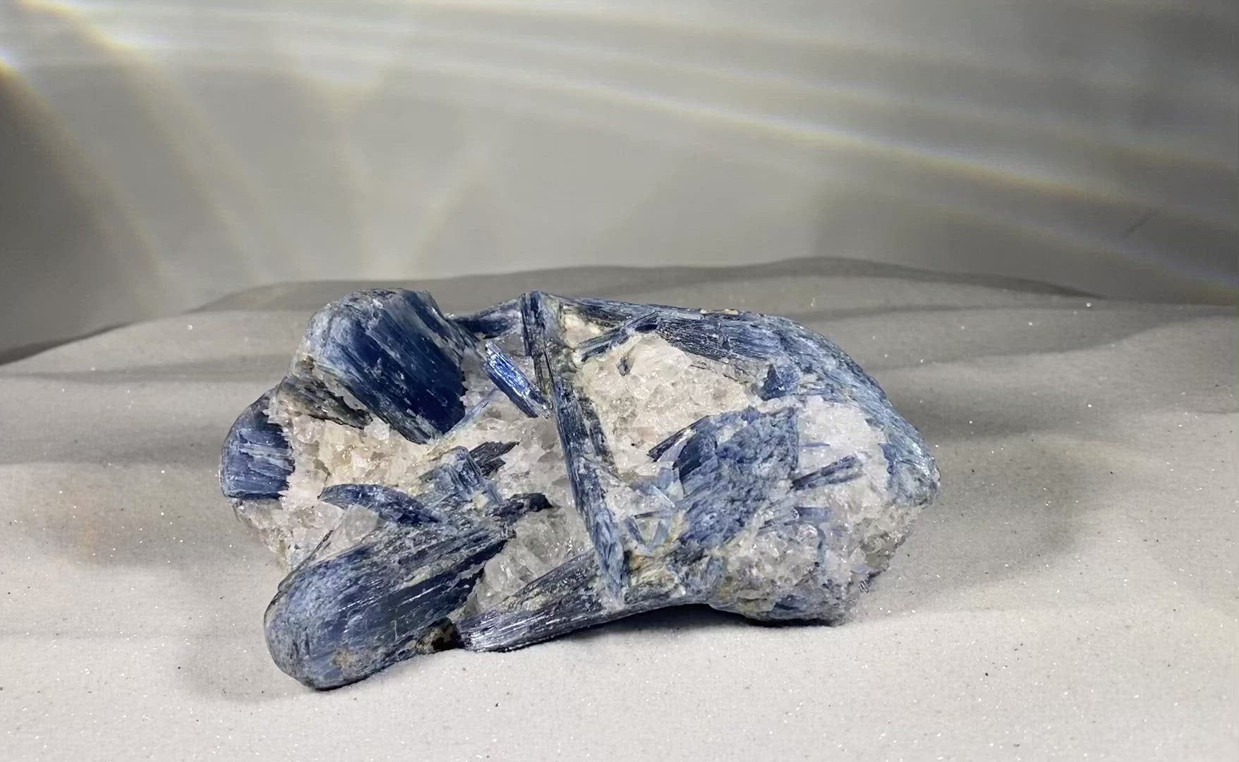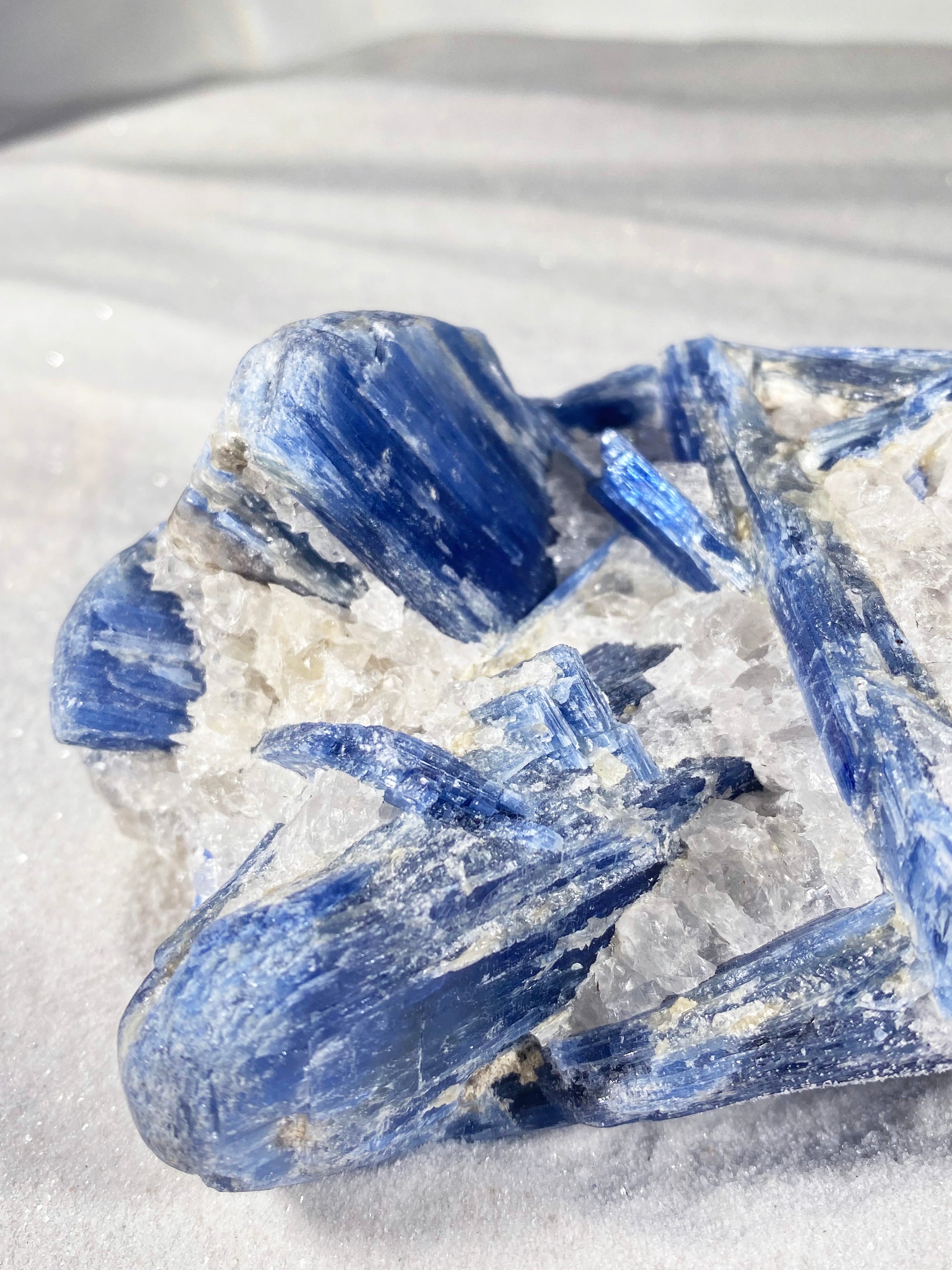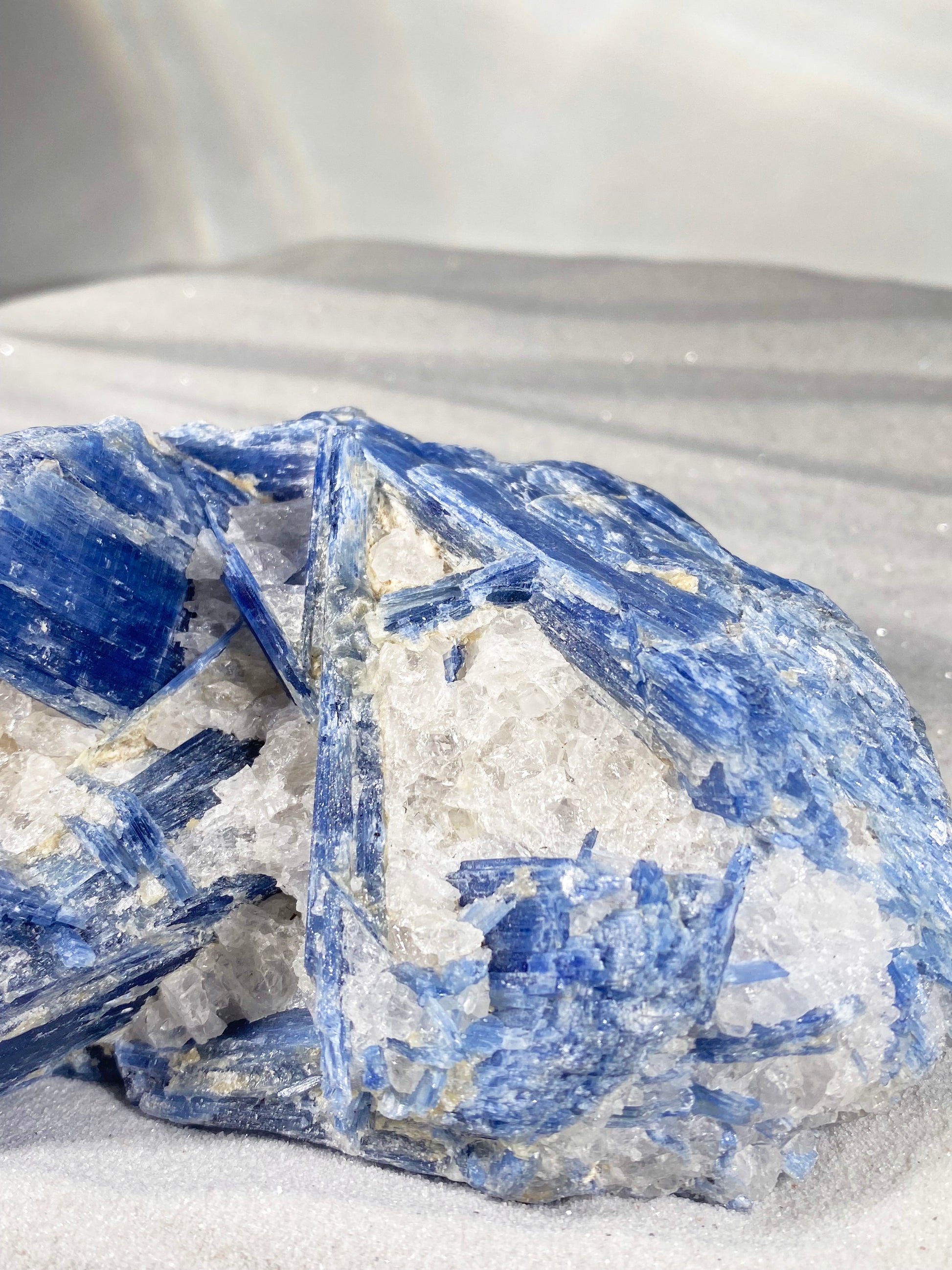 Kyanite is one of those crystals that fascinates those who lay eyes on it. Its typical growth pattern of sprays of bladed crystals with its bright blue color makes this mineral unique and iconic. The specimen here is of spectacular quality creating a beautiful display of thick rich blades imbedded in a host stone of Quartz. What makes this specimen so interesting is that it has a natural rounded quality to it. Unlike many Kyanite clusters this one doesn't have as many sharp blades sticking out. This Kyanite crystal would be great for healing work, holding or resting on the body for meditative purposes. Kyanite makes a beautiful addition spreading positive high vibrations in your space.