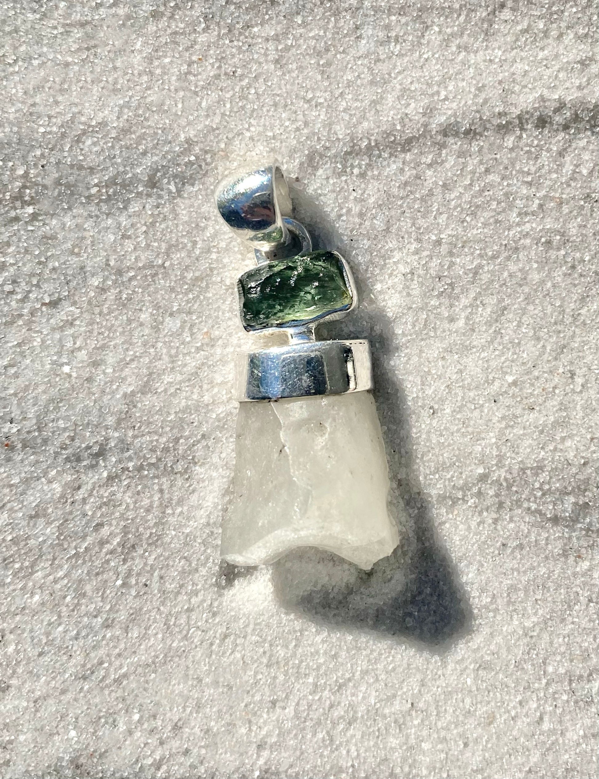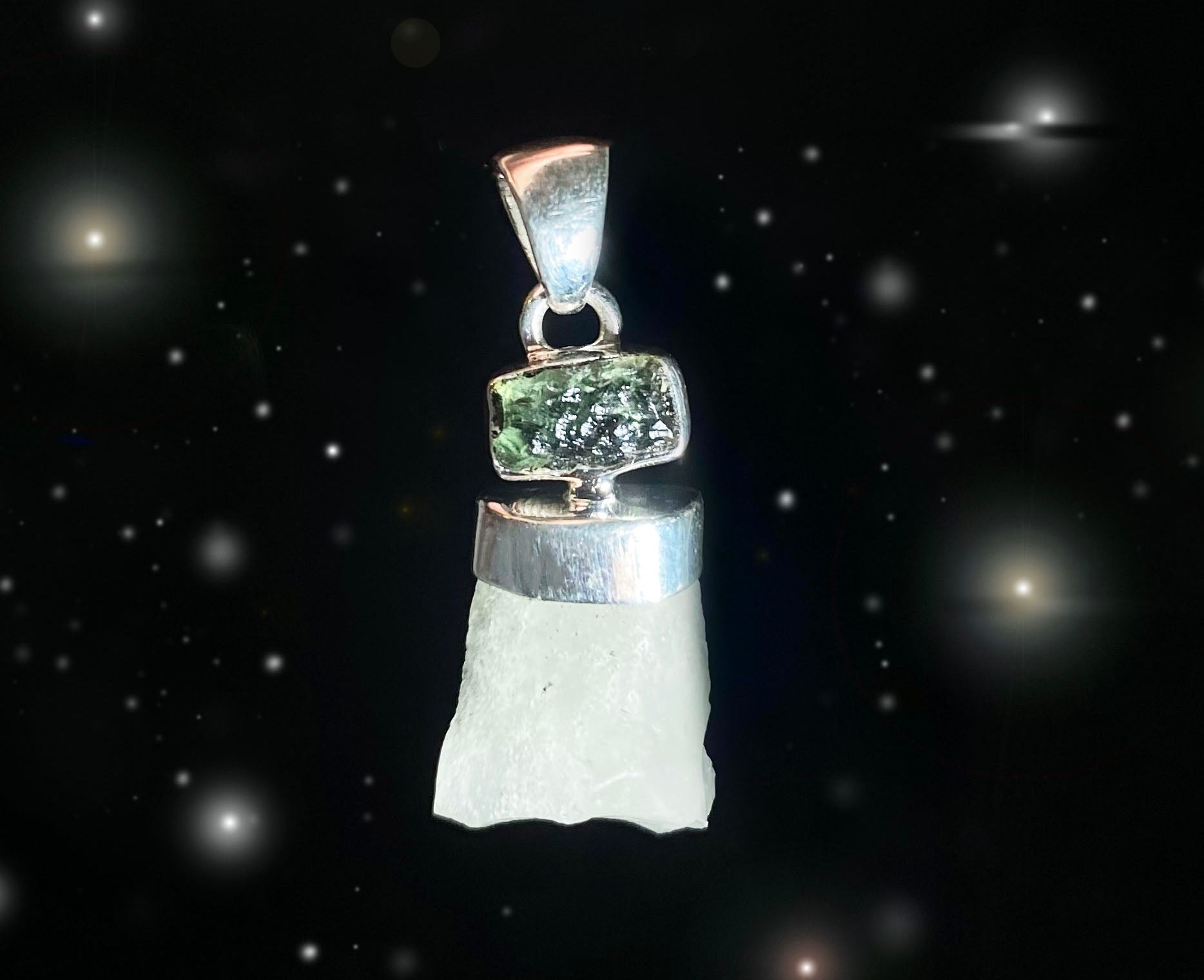 This pendant features a piece of genuine rough Moldavite resting above a piece of natural and authentic Libyan Desert Glass. Known for its potent combination for expediting your spiritual growth, these two tektite impact glasses will help raise your vibration and expand your consciousness.