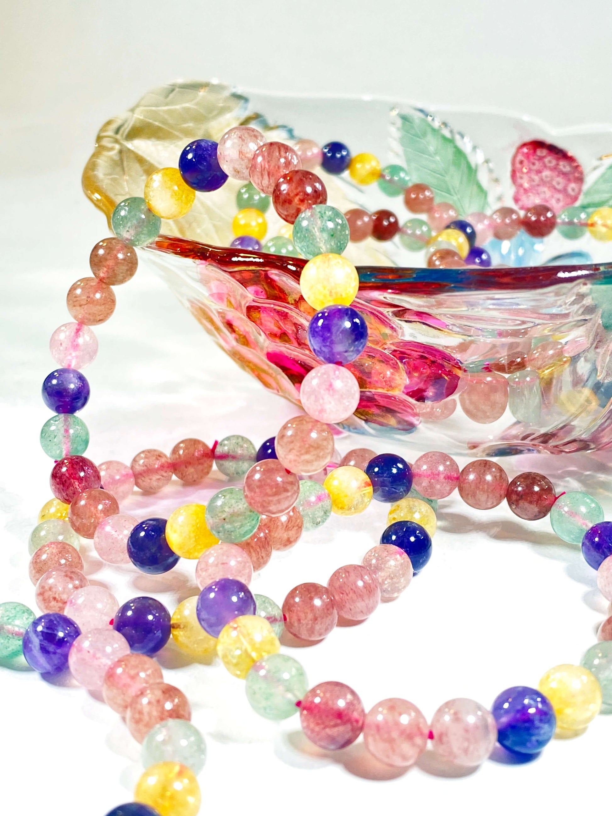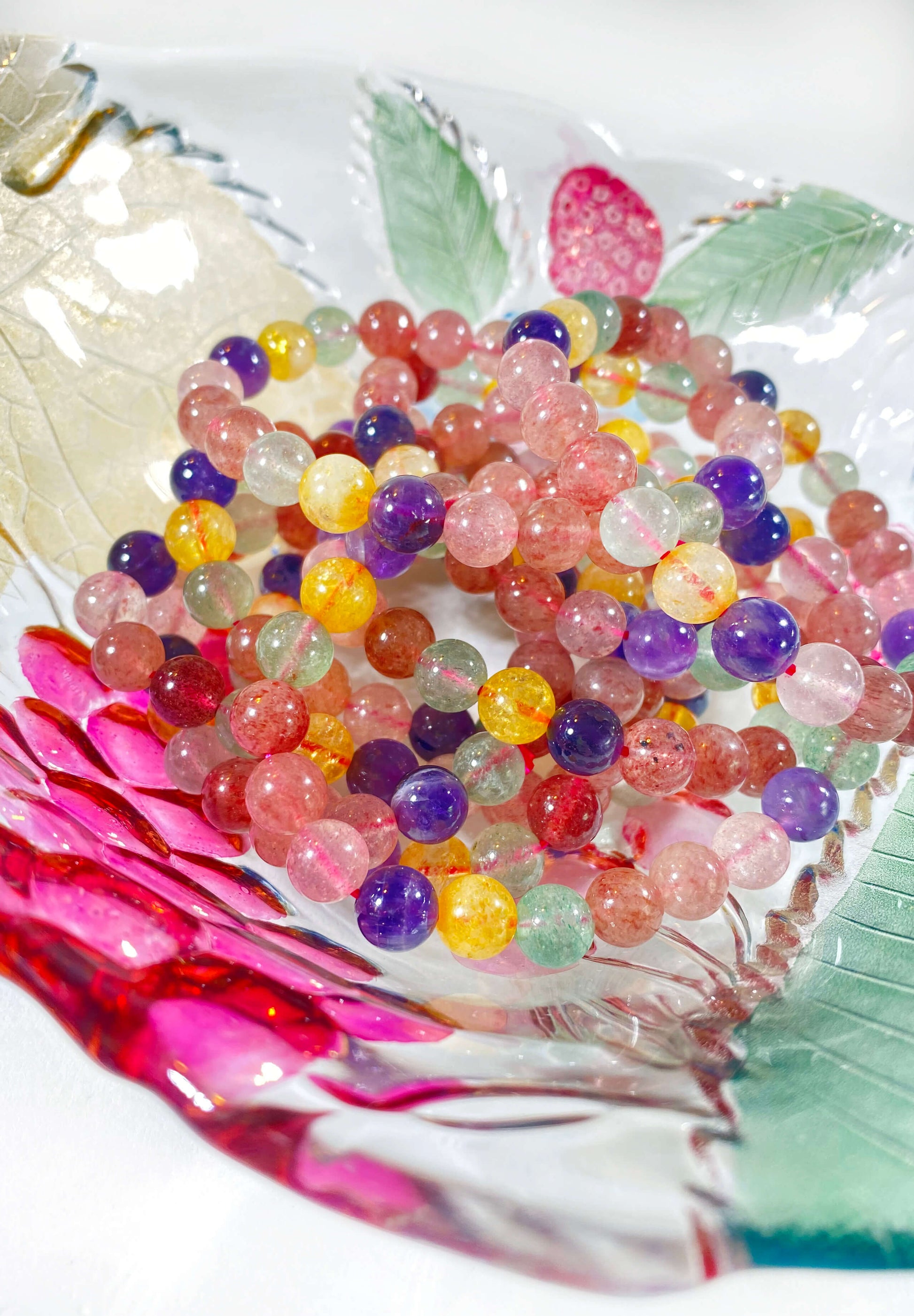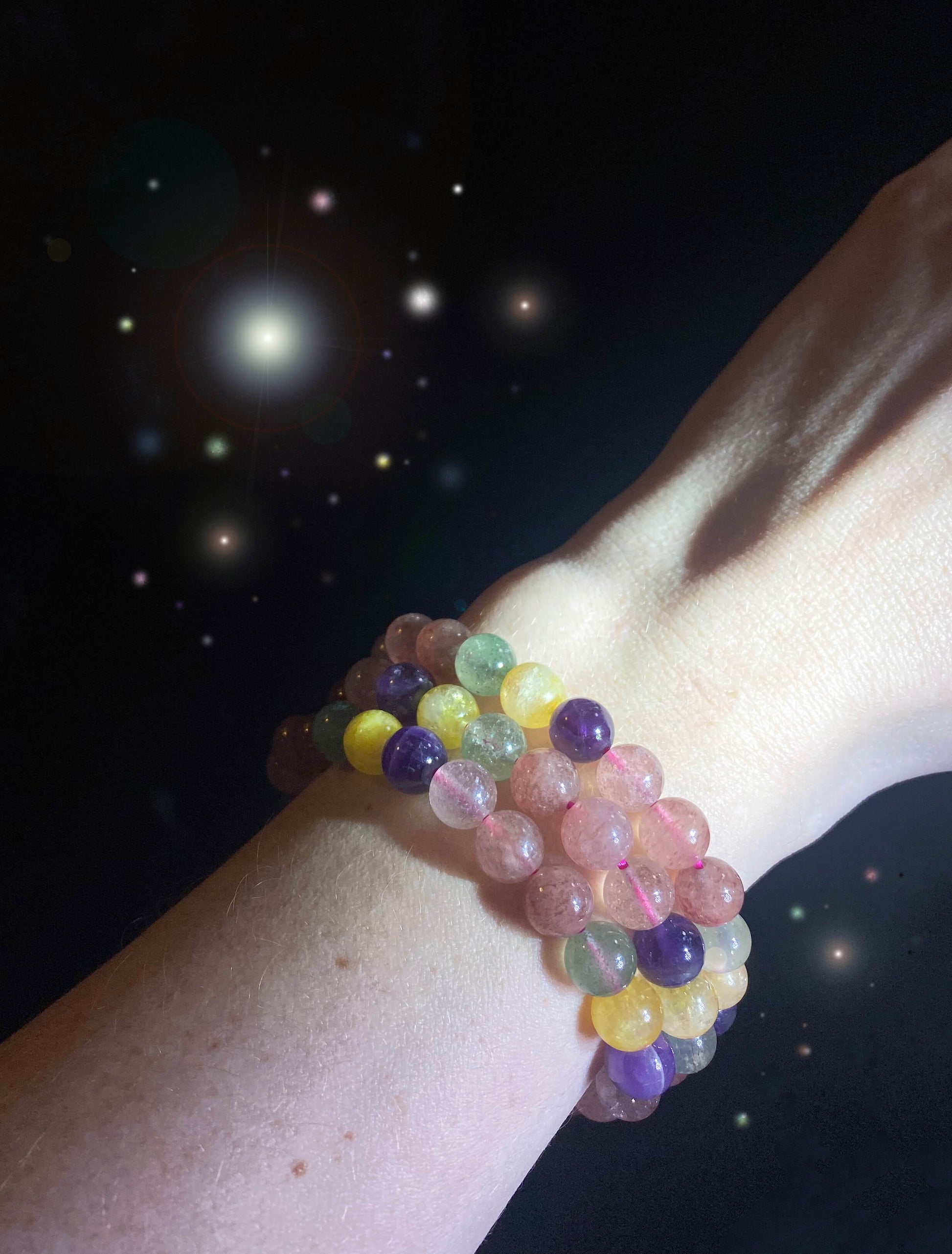 Delicious Strawberry Quartz, both pink (or red) and green variety, combined with Amethyst and Golden Healer to create this super juicy wrist cocktail. But don’t be fooled by this fruity bunch, their metaphysical powers combine a potent antioxidant-like energy. Amethyst and Golden Healer are masters in their fields of healing with all around powerful vibrations. Strawberry Quartz (both colors) are wonderful elixirs for the heart. Stimulating a flow of energy of love, happiness and gratitude.