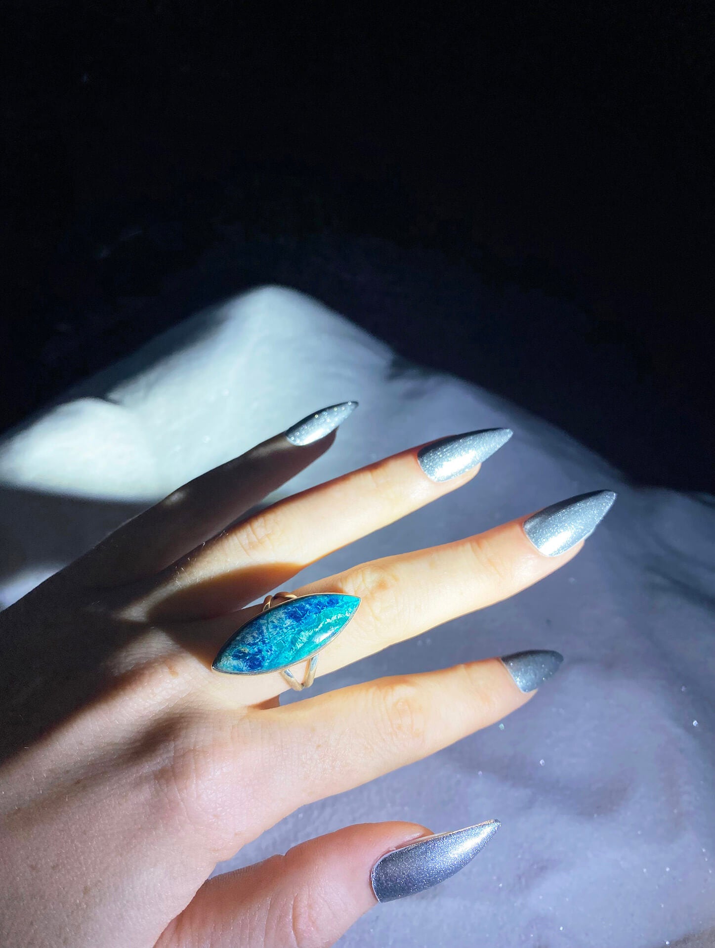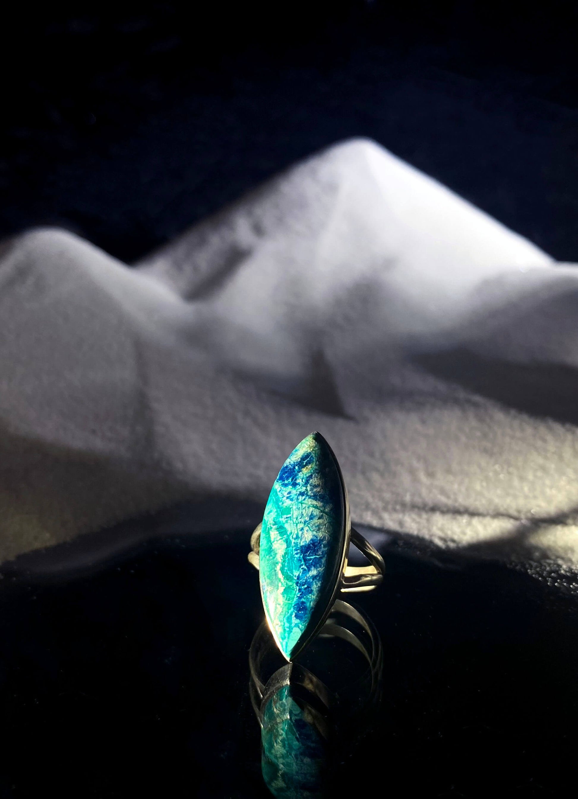 Table Mountain Shadowkite is sourced from a mine in South Africa near Cape Town. It's a blend of it main stone Chrysocolla, Malachite and Azurite. It is a rare and beautiful stone that is a relatively new find in the gem world. Chrysocolla is a stone that is reverend for its energy of communication linking to the truth and inner wisdom within one's soul. Azurite is known as the "stone of heaven" and is deeply connected to the psychic realm, inner vision, intuition and the spiritual seeker. Malachite is a powerful heart chakra stone that brings transformative and necessary energies making way for more abundance in one's life.